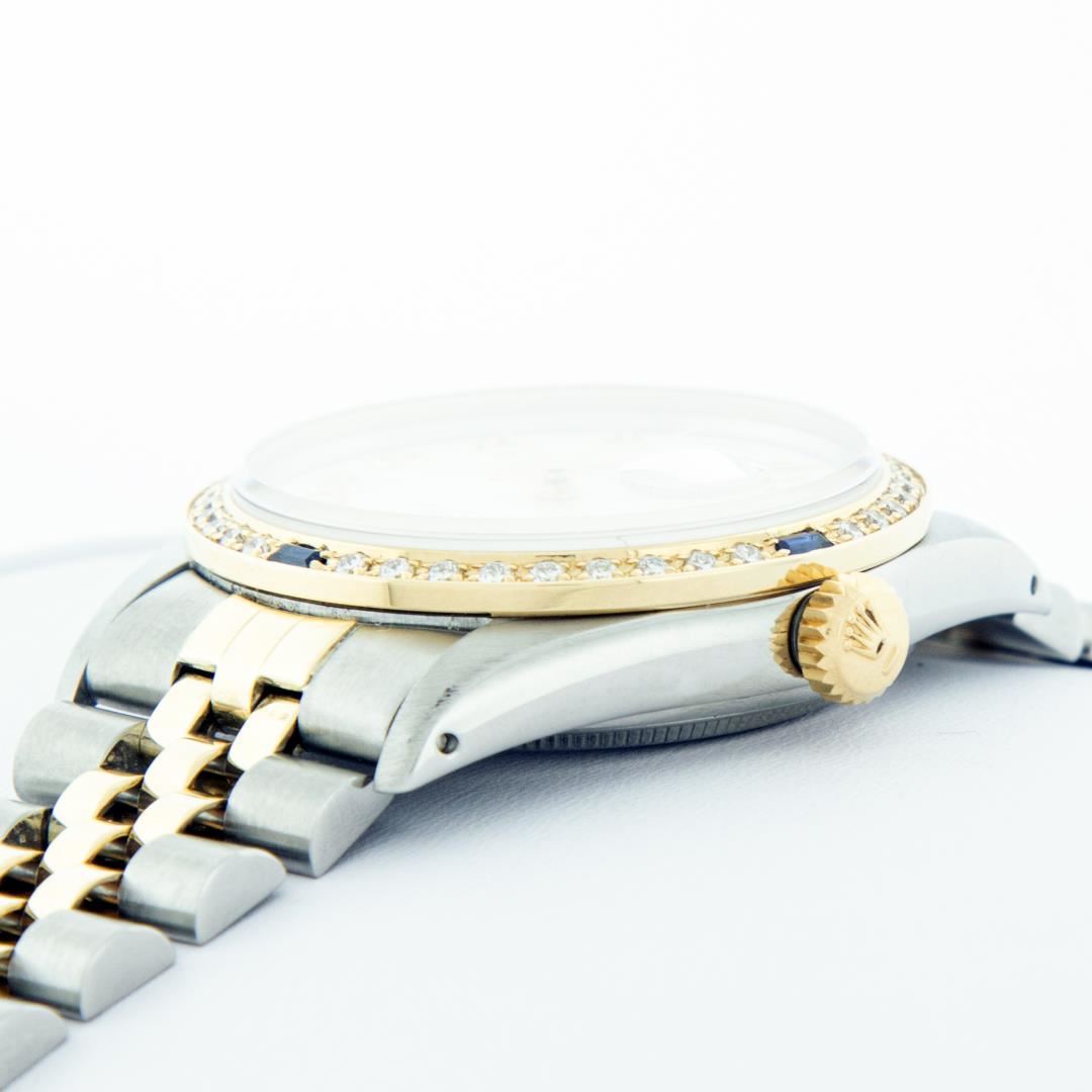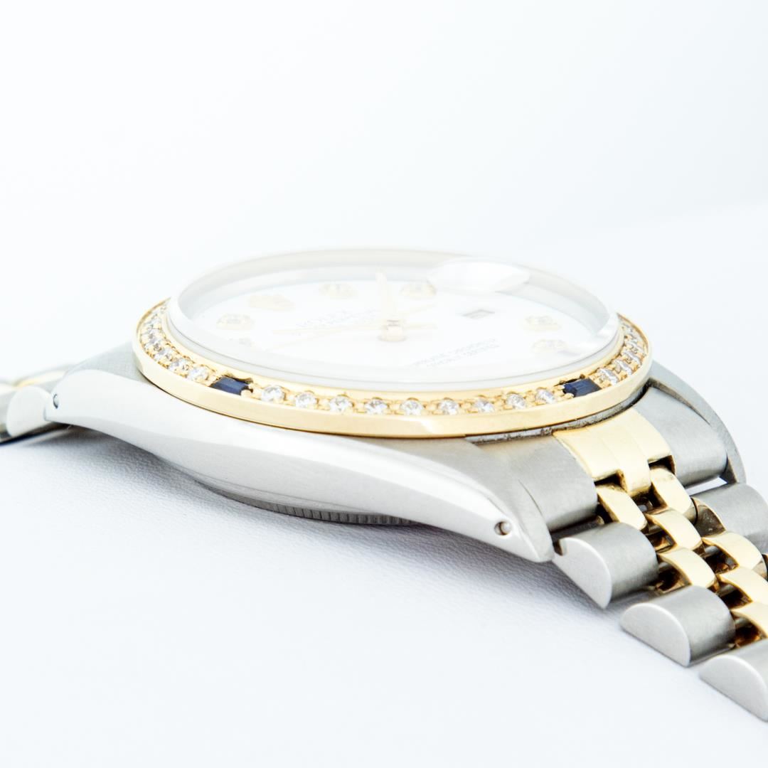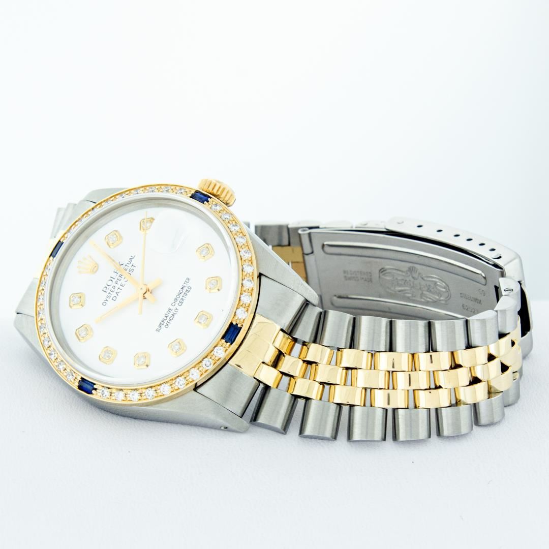 One Mens Pre Owned Yellow Gold And Stainless Steel Two Tone Rolex Datejust Polished, Serviced And Electronically Tested, Rolex Yellow Gold And Stainless Steel Case: 36mm, Rolex Yellow Gold Crown, Custom Bezel: New 18K Yellow Gold Sapphire Beadset Diamond Bezel, Stone Count: 36 Diamonds + 4 Sapphires. Custom Crystal: New Sapphire With Magnified Date. Custom Hands: New Luminescent Hands. Rolex Movement: Automatic Winding Movement 3035. Custom Dial: Custom White Diamond Dial With Added Diamond Hour Markers, Diamond Count: 10 Diamonds. Date Window: 3 O'Clock Position Date Display, Quickset, Model: Datejust. Condition: G-6 Extra Fine. Rolex Bracelet: Two Tone Yellow Gold & Stainless Steel Jubilee Band. Bright Polish. 7.0 Inch Length, Adjustable. Standard Clasp, With Rolex Logo. This Watch Has Been Serviced Time Tested And Is In Excellent Condition It Is Free Of All Scratches And Dents.