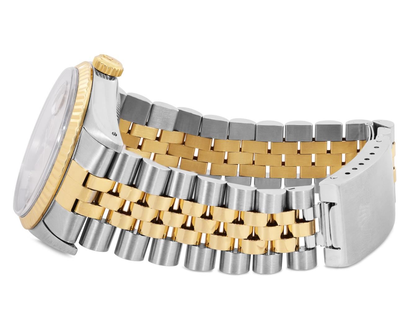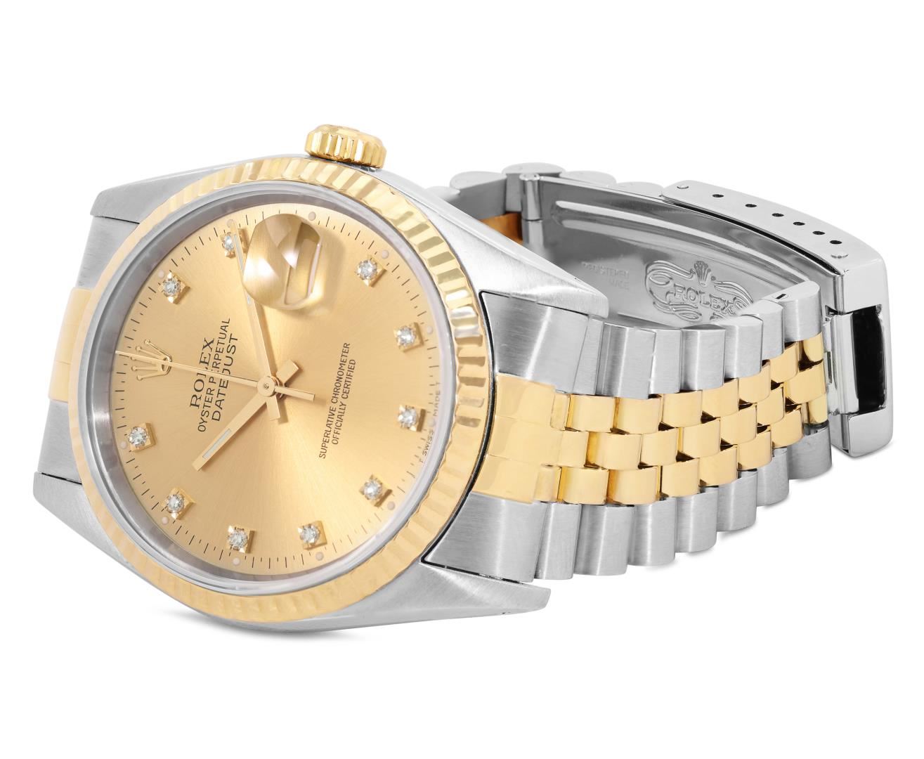 One Mens Pre Owned Two Tone Yellow Gold And Stainless Steel Rolex Datejust Polished, Serviced And Electronically Tested, Rolex Yellow Gold And Stainless Steel Case: 36mm, Rolex Yellow Gold Crown, Rolex Bezel: 18K Yellow Gold Fluted Bezel. Crystal: Sapphire With Magnified Date Window. Hands: Luminescent Hands. Rolex Movement: Automatic Winding Movement 3135. Rolex Dial: Champagne Dial With Diamond Hour Markers and Dash Track With Lumi Dots. Diamond Count: 10 Diamonds On Dial. Date Window: 3 O'Clock Position Date Display, Quickset, Model: Quickset Sapphire Datejust. Condition: G-6 Extra Fine. Rolex Bracelet: Two Tone Yellow Gold And Stainless Steel Jubilee Band. Bright Polish. 7.0 Inch Length, Adjustable. Standard Clasp, With Rolex Logo. This Watch Has Been Serviced Time Tested And Is In Excellent Condition It Is Free Of All Scratches And Dents. This Watch Comes With A Rolex Box.