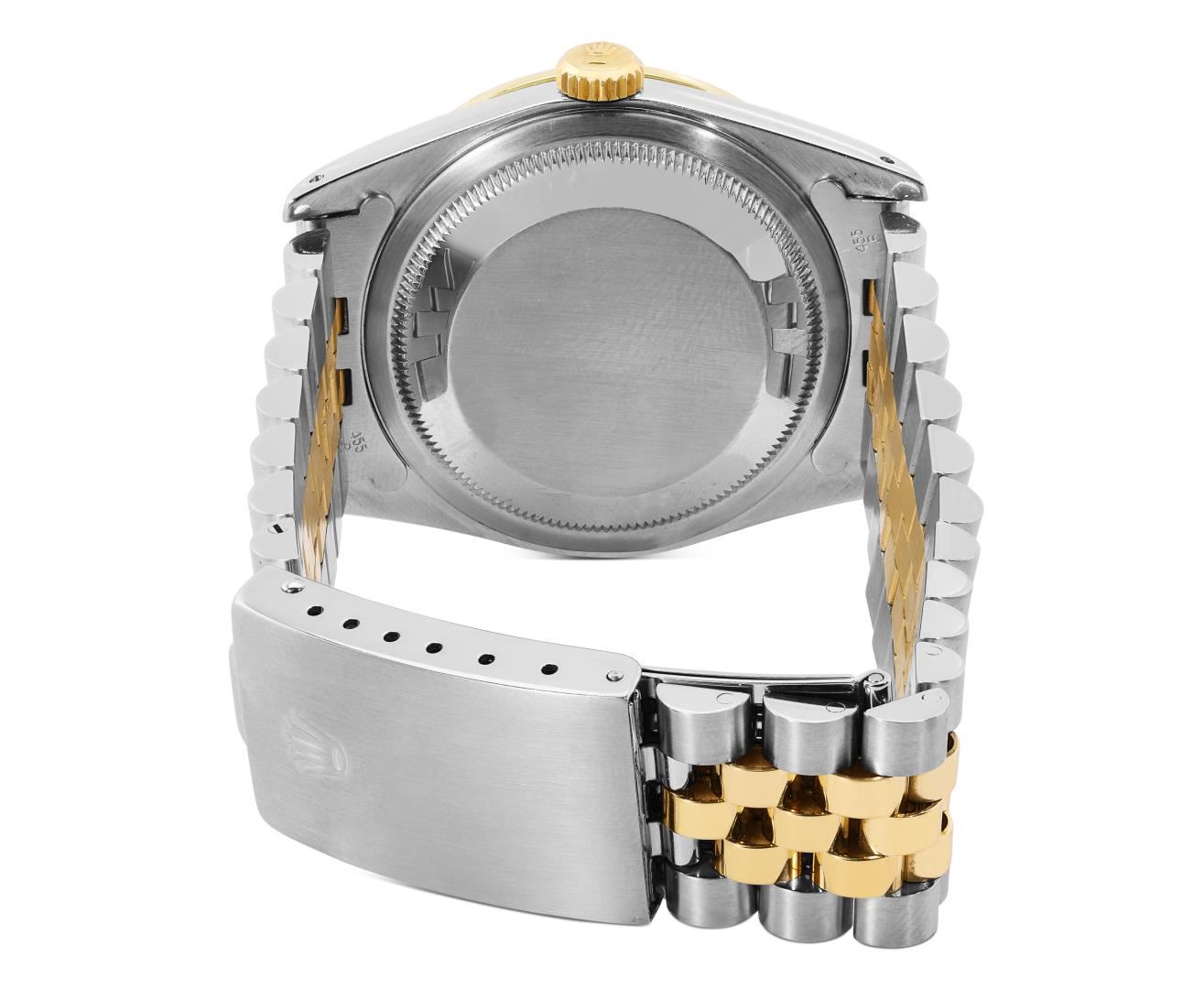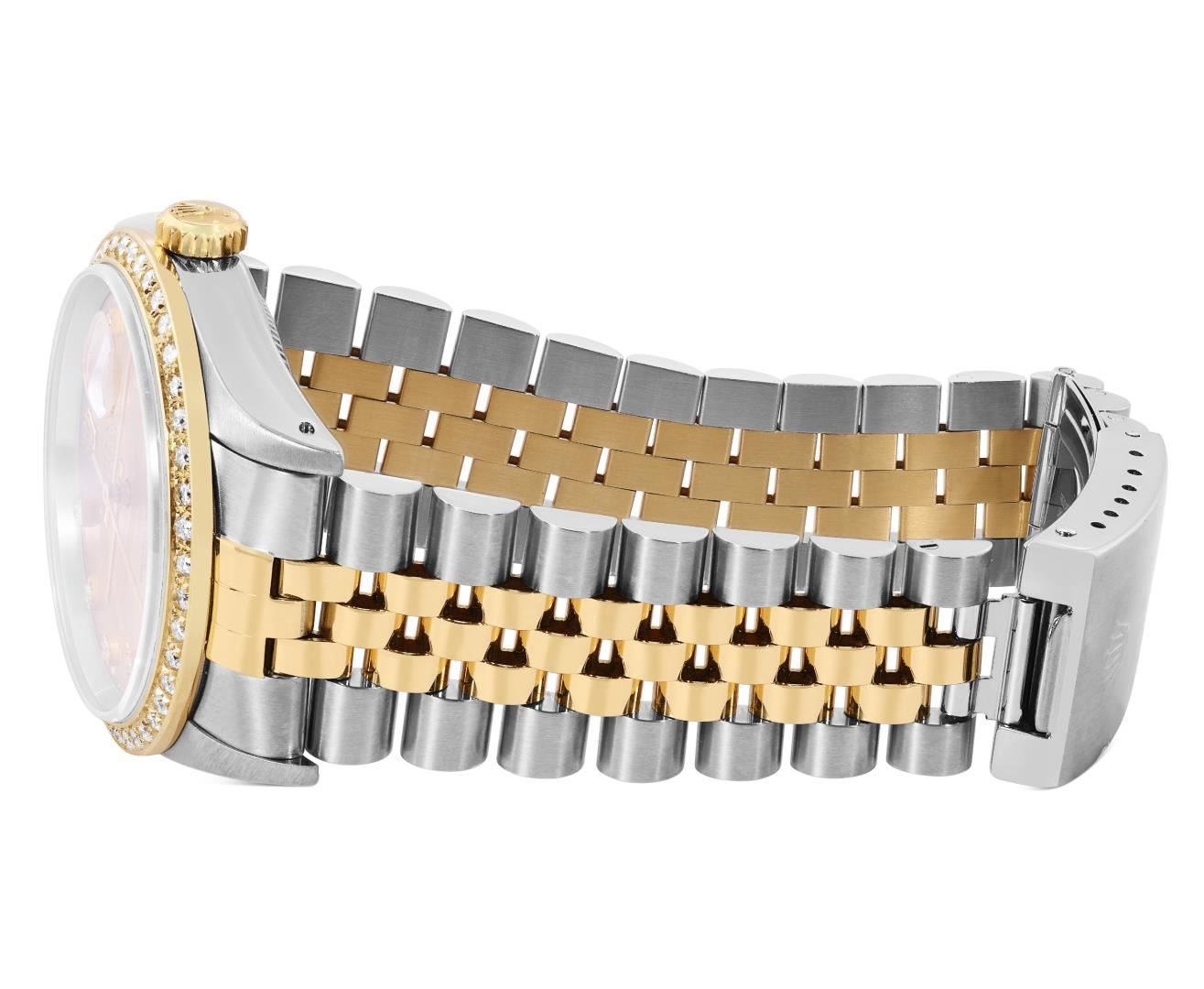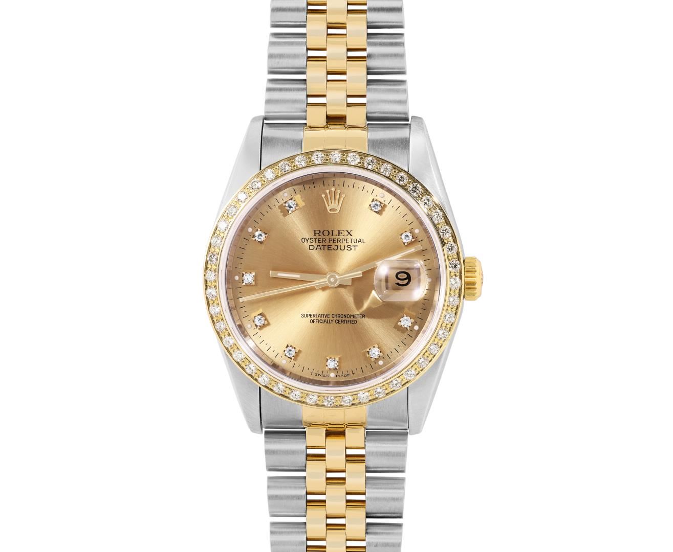 One Mens Pre Owned Two Tone 18K Yellow Gold And Stainless Steel Rolex Datejust Polished, Serviced And Electronically Tested, Rolex Yellow Gold And Stainless Steel Case: 36mm, Rolex Yellow Gold Crown, Custom Bezel: New 18K Yellow Gold Beadset Diamond Bezel, Diamond Count: 44 Diamonds. Custom Crystal: New Sapphire With Magnified Date Window. Custom Hands: New Luminecent Hands. Rolex Movement: Automatic Winding Movement 3135. Rolex Dial: Factory Champagne Dial With Diamond Hour Markers and Dash Track With Lumi Dots, Diamond Count: 10 Diamonds On Dial. Date Window: 3 O'Clock Position Date Display, Quickset, Model: Quickset Datejust. Condition: G-6 Extra Fine. Rolex Bracelet: Two Tone 18K Yellow Gold And Stainless Steel Jubilee Band. Bright Polish. 7.0 Inch Length, Adjustable. Standard Clasp, With Rolex Logo. This Watch Has Been Serviced Time Tested And Is In Excellent Condition It Is Free Of All Scratches And Dents.