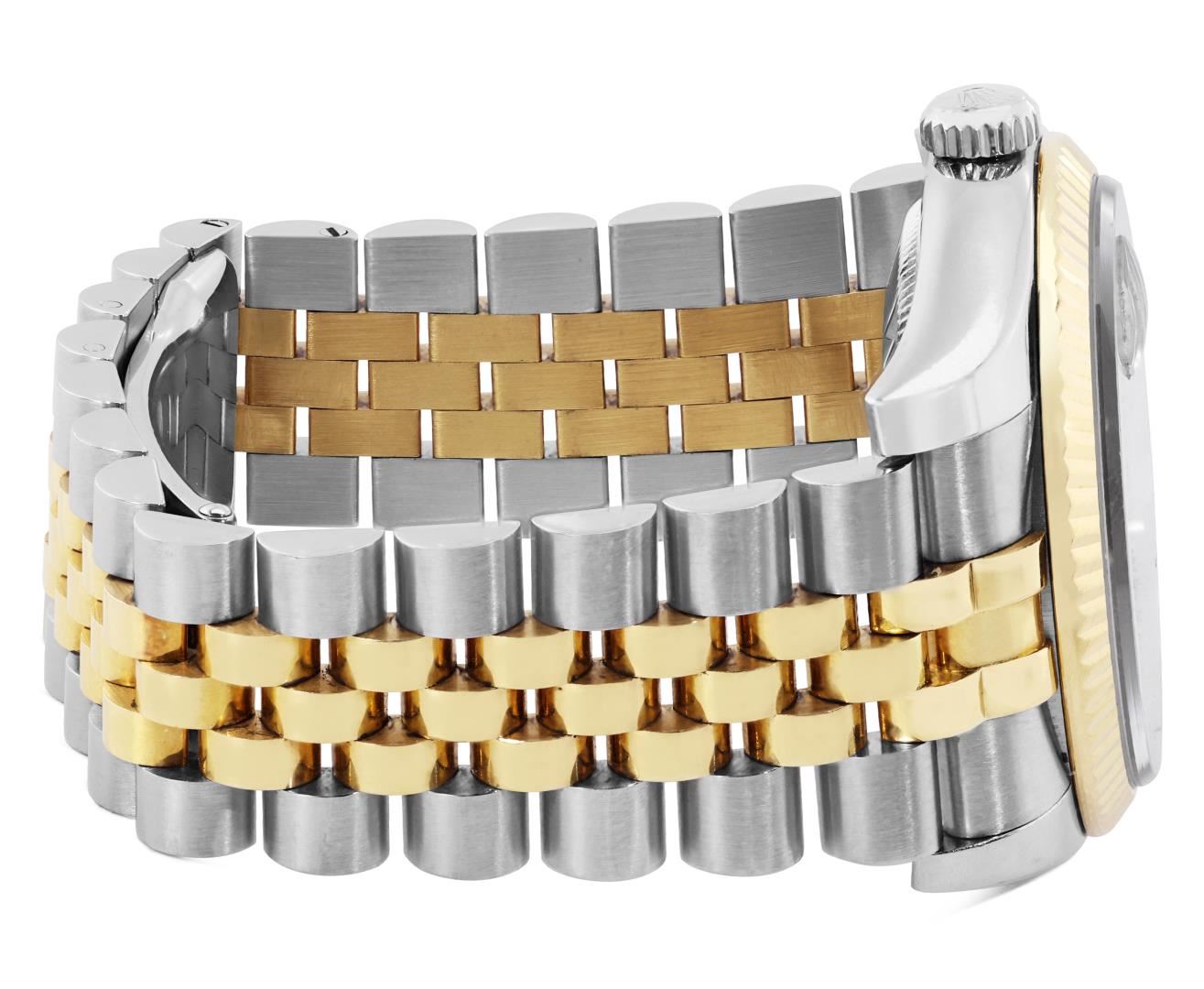 One Mens Pre Owned 18K Yellow Gold And Stainless Steel Rolex Datejust 36MM Polished, Serviced And Electronically Tested, Rolex Yellow Gold And Stainless Steel Case: 36mm, Rolex Yellow Gold Crown, Rolex Bezel: New 18K Yellow Gold Fluted Bezel. Crystal: Sapphire With Magnified Date Window. Rolex Hands: Solid Hands. Rolex Movement: Automatic Winding Movement 3235. Rolex Dial: Factory Champagne Diamond Dial, Diamond Count: 10 Diamonds On Dial, Clarity: VVS. Date Window: 3 O'Clock Position Date Display, Quickset, Model: Quickset Sapphire Datejust. Condition: G-6 Extra Fine. Rolex Bracelet: Two Tone 18K Yellow Gold And Stainless Steel Jubilee Band. Bright Polish. 7.0 Inch Length, Adjustable. Hidden Clasp, With Rolex Logo. This Watch Has Been Serviced And Polished It Is Free Of All Scratches And Dents. This Watch Comes With A Rolex Box.