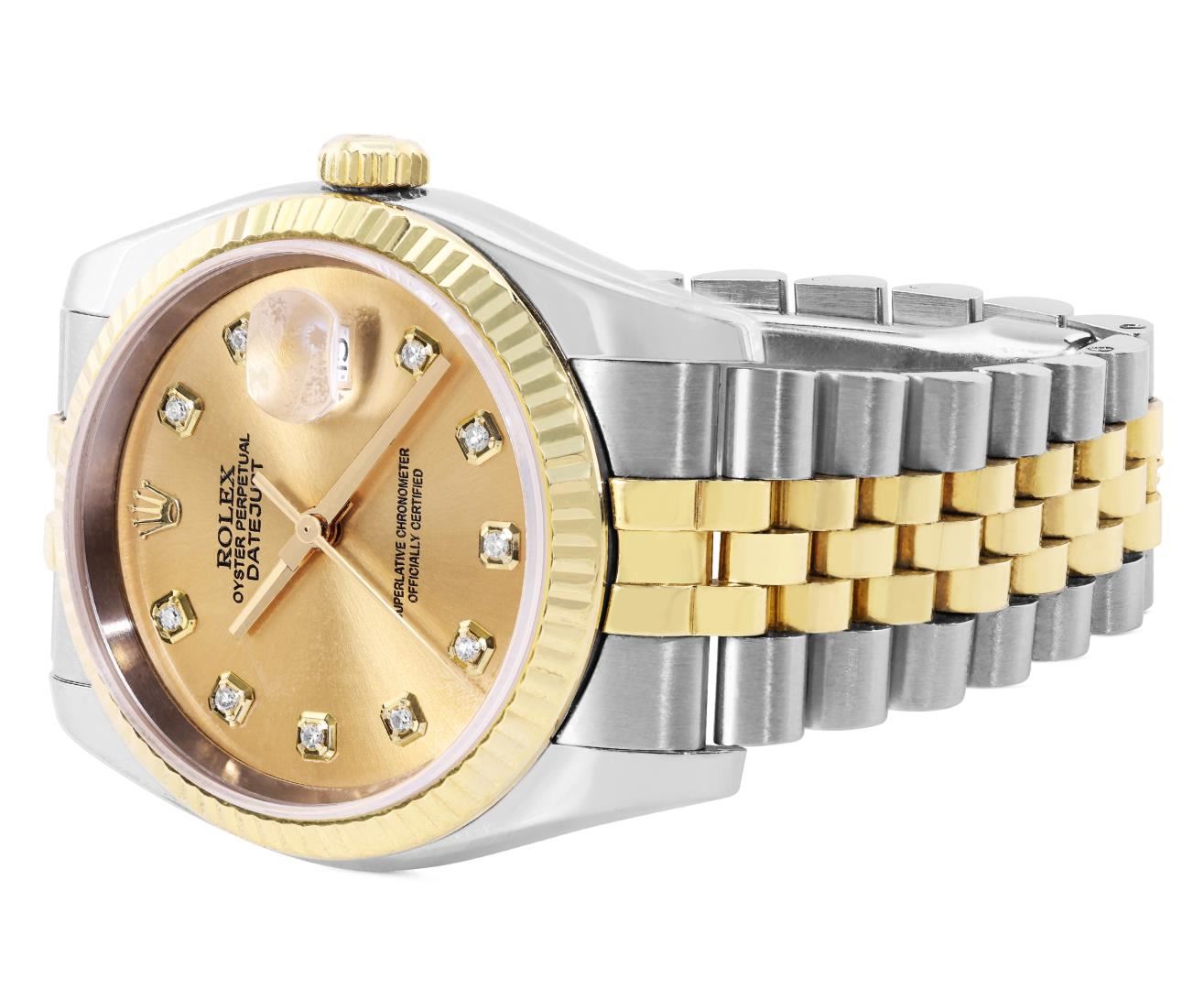 One Mens Pre Owned 18K Yellow Gold And Stainless Steel Rolex Datejust 36MM Polished, Serviced And Electronically Tested, Rolex Yellow Gold And Stainless Steel Case: 36mm, Rolex Yellow Gold Crown, Rolex Bezel: New 18K Yellow Gold Fluted Bezel. Crystal: Sapphire With Magnified Date Window. Rolex Hands: Solid Hands. Rolex Movement: Automatic Winding Movement 3235. Rolex Dial: Factory Champagne Diamond Dial, Diamond Count: 10 Diamonds On Dial, Clarity: VVS. Date Window: 3 O'Clock Position Date Display, Quickset, Model: Quickset Sapphire Datejust. Condition: G-6 Extra Fine. Rolex Bracelet: Two Tone 18K Yellow Gold And Stainless Steel Jubilee Band. Bright Polish. 7.0 Inch Length, Adjustable. Hidden Clasp, With Rolex Logo. This Watch Has Been Serviced And Polished It Is Free Of All Scratches And Dents. This Watch Comes With A Rolex Box.