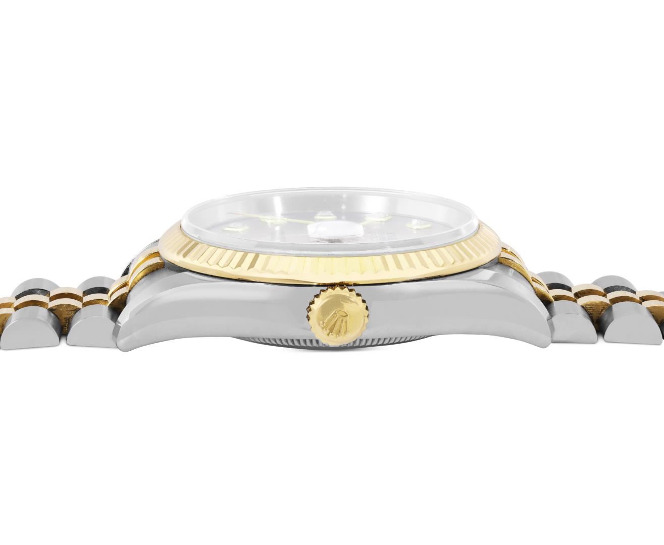 One Mens Pre Owned 18K Yellow Gold And Stainless Steel Rolex Datejust 36MM Polished, Serviced And Electronically Tested, Rolex Yellow Gold And Stainless Steel Case: 36mm, Rolex Yellow Gold Crown, Rolex Bezel: New 18K Yellow Gold Fluted Bezel. Crystal: Sapphire With Magnified Date Window. Rolex Hands: Solid Hands. Rolex Movement: Automatic Winding Movement 3235. Rolex Dial: Factory Champagne Diamond Dial, Diamond Count: 10 Diamonds On Dial, Clarity: VVS. Date Window: 3 O'Clock Position Date Display, Quickset, Model: Quickset Sapphire Datejust. Condition: G-6 Extra Fine. Rolex Bracelet: Two Tone 18K Yellow Gold And Stainless Steel Jubilee Band. Bright Polish. 7.0 Inch Length, Adjustable. Hidden Clasp, With Rolex Logo. This Watch Has Been Serviced And Polished It Is Free Of All Scratches And Dents. This Watch Comes With A Rolex Box.