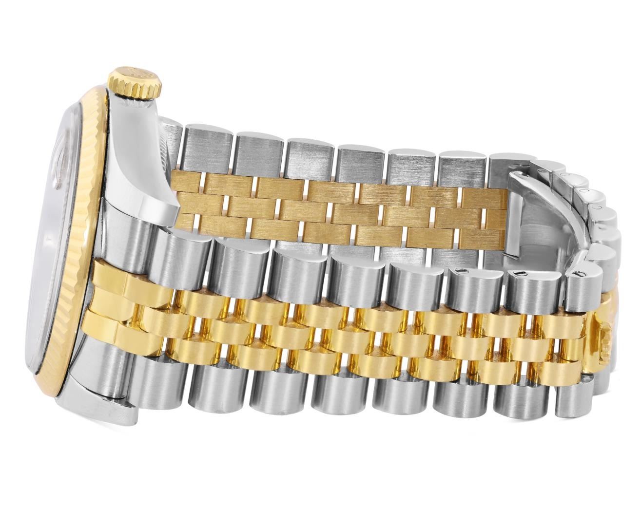 One Mens Pre Owned 18K Yellow Gold And Stainless Steel Rolex Datejust 36MM Polished, Serviced & Electronically Tested, Rolex Yellow Gold And Stainless Steel Case: 36mm, Rolex Yellow Gold Crown, Rolex Bezel: New 18K Yellow Gold Fluted Bezel. Crystal: Sapphire With Magnified Date Window. Rolex Hands: Solid Hands. Rolex Movement: Automatic Winding Movement 3235. Rolex Dial: Factory Champagne Jubilee Diamond Dial Diamond Count: 10 Diamonds On Dial, Clarity: VVS. Date Window: 3 O'Clock Position Date Display, Quickset, Model: Quickset Sapphire Datejust. Condition: G-6 Extra Fine. Rolex Bracelet: Two Tone 18K Yellow Gold And Stainless Steel Jubilee Band. Bright Polish. 7.0 Inch Length, Adjustable. Hidden Clasp, With Rolex Logo. This Watch Has Been Serviced And Polished It Is Free Of All Scratches And Dents.