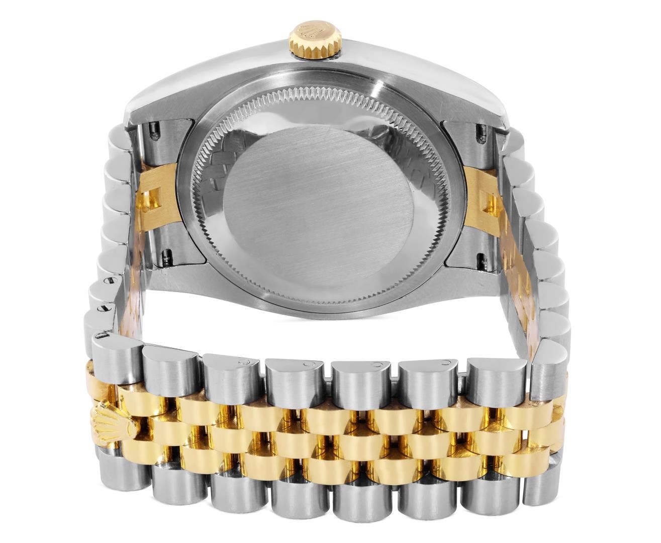 One Mens Pre Owned 18K Yellow Gold And Stainless Steel Rolex Datejust 36MM Polished, Serviced & Electronically Tested, Rolex Yellow Gold And Stainless Steel Case: 36mm, Rolex Yellow Gold Crown, Rolex Bezel: New 18K Yellow Gold Fluted Bezel. Crystal: Sapphire With Magnified Date Window. Rolex Hands: Solid Hands. Rolex Movement: Automatic Winding Movement 3235. Rolex Dial: Factory Champagne Jubilee Diamond Dial Diamond Count: 10 Diamonds On Dial, Clarity: VVS. Date Window: 3 O'Clock Position Date Display, Quickset, Model: Quickset Sapphire Datejust. Condition: G-6 Extra Fine. Rolex Bracelet: Two Tone 18K Yellow Gold And Stainless Steel Jubilee Band. Bright Polish. 7.0 Inch Length, Adjustable. Hidden Clasp, With Rolex Logo. This Watch Has Been Serviced And Polished It Is Free Of All Scratches And Dents.