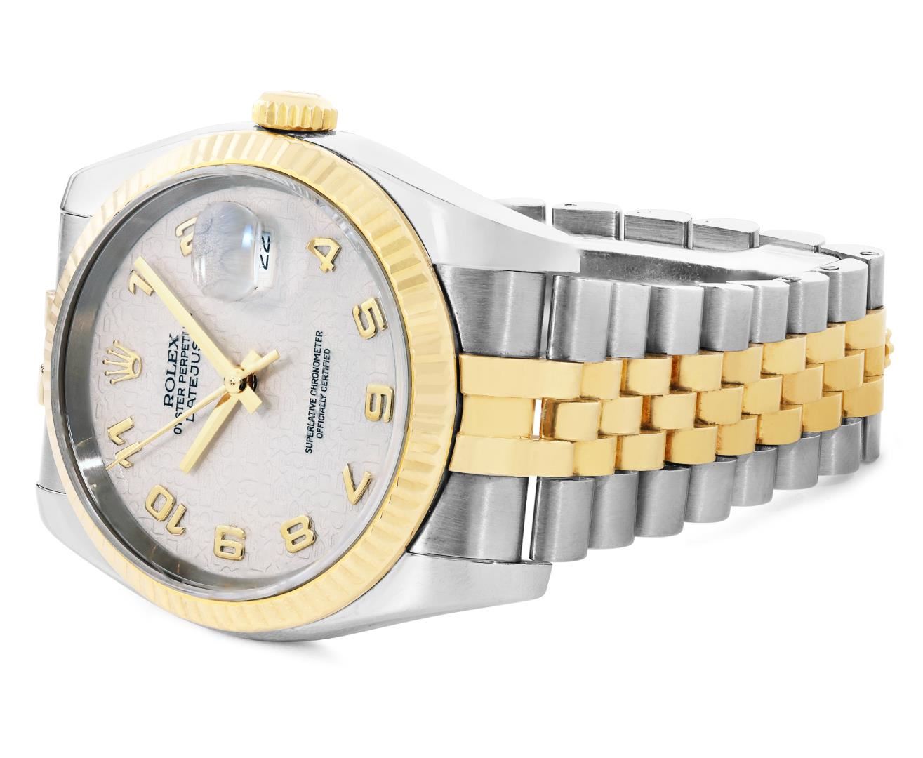 One Mens Pre Owned Sapphire 18K Yellow Gold And Stainless Steel Rolex Datejust 36MM Polished, Serviced And Electronically Tested, Rolex Yellow Gold And Stainless Steel Case: 36mm, Rolex Yellow Gold Crown, Rolex Bezel: 18K Yellow Gold Fluted Bezel. Crystal: Sapphire With Magnified Date Window. Rolex Hands: Solid Hands. Rolex Movement: Automatic Winding Movement 3135. Rolex Dial: Factory Cream Jubilee Arabic Dial. Date Window: 3 O'Clock Position Date Display, Quickset, Model: Quickset Datejust. Condition: G-6 Extra Fine. Rolex Bracelet: Two Tone 18K Yellow Gold And Stainless Steel Jubilee Band. Bright Polish. 7.0 Inch Length, Adjustable. Hidden Clasp, With Rolex Logo. This Watch Has Been Serviced And Polished It Is Free Of All Scratches And Dents. This Watch Comes With Rolex Box.