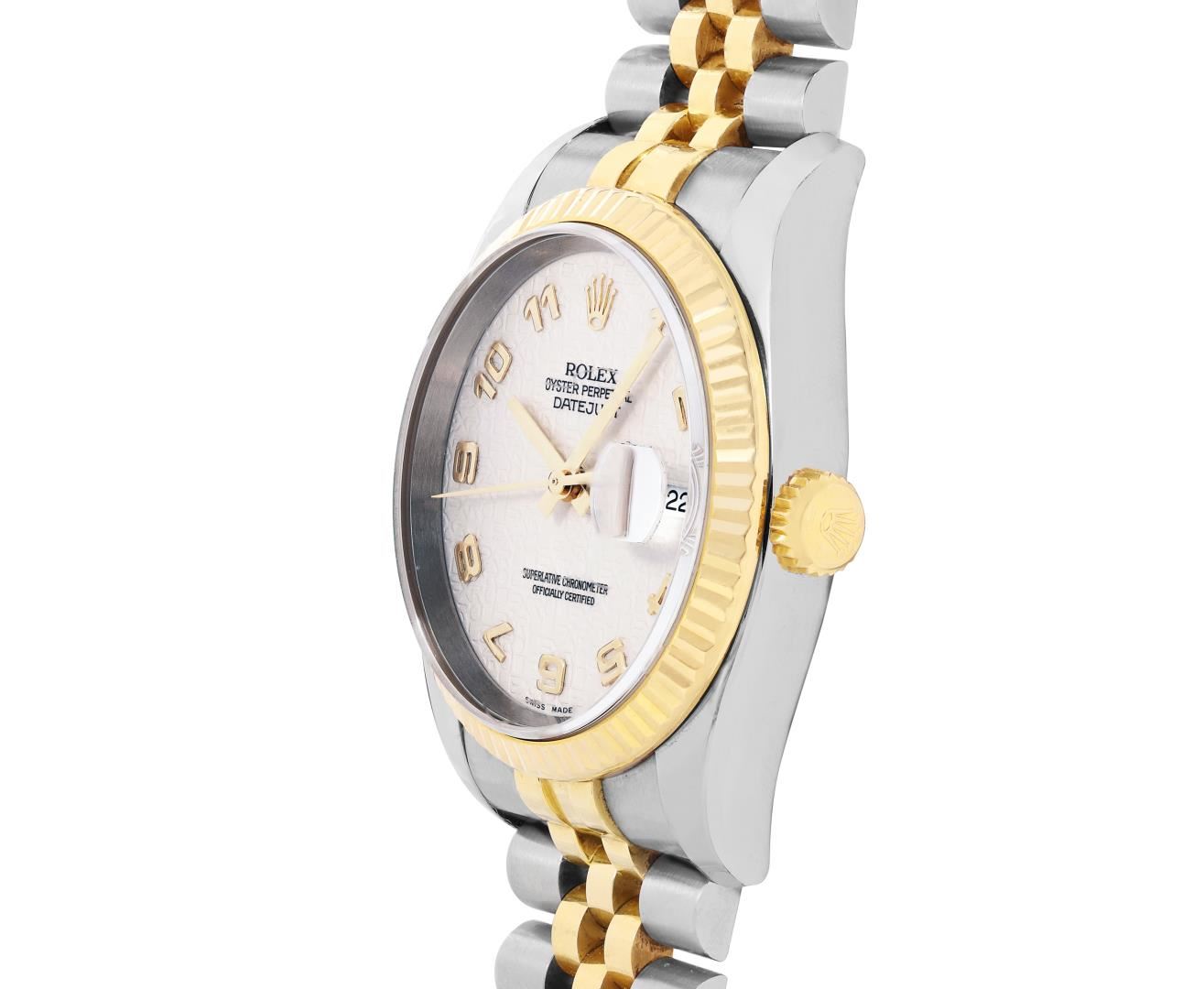 One Mens Pre Owned Sapphire 18K Yellow Gold And Stainless Steel Rolex Datejust 36MM Polished, Serviced And Electronically Tested, Rolex Yellow Gold And Stainless Steel Case: 36mm, Rolex Yellow Gold Crown, Rolex Bezel: 18K Yellow Gold Fluted Bezel. Crystal: Sapphire With Magnified Date Window. Rolex Hands: Solid Hands. Rolex Movement: Automatic Winding Movement 3135. Rolex Dial: Factory Cream Jubilee Arabic Dial. Date Window: 3 O'Clock Position Date Display, Quickset, Model: Quickset Datejust. Condition: G-6 Extra Fine. Rolex Bracelet: Two Tone 18K Yellow Gold And Stainless Steel Jubilee Band. Bright Polish. 7.0 Inch Length, Adjustable. Hidden Clasp, With Rolex Logo. This Watch Has Been Serviced And Polished It Is Free Of All Scratches And Dents. This Watch Comes With Rolex Box.