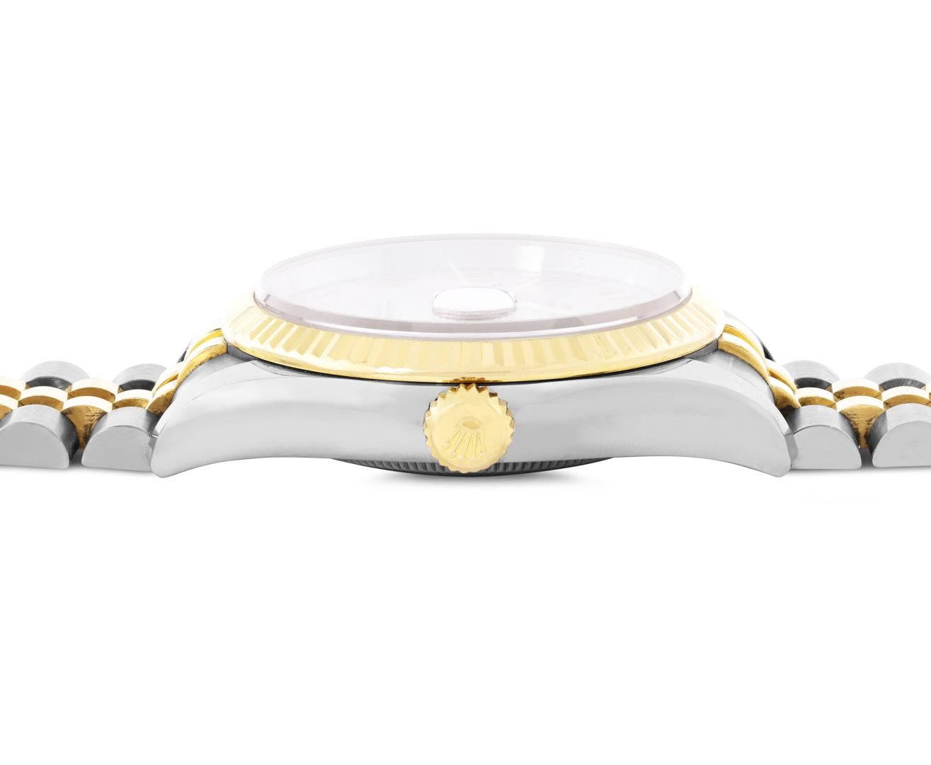 One Mens Pre Owned Sapphire 18K Yellow Gold And Stainless Steel Rolex Datejust 36MM Polished, Serviced And Electronically Tested, Rolex Yellow Gold And Stainless Steel Case: 36mm, Rolex Yellow Gold Crown, Rolex Bezel: 18K Yellow Gold Fluted Bezel. Crystal: Sapphire With Magnified Date Window. Rolex Hands: Solid Hands. Rolex Movement: Automatic Winding Movement 3135. Rolex Dial: Factory Cream Jubilee Arabic Dial. Date Window: 3 O'Clock Position Date Display, Quickset, Model: Quickset Datejust. Condition: G-6 Extra Fine. Rolex Bracelet: Two Tone 18K Yellow Gold And Stainless Steel Jubilee Band. Bright Polish. 7.0 Inch Length, Adjustable. Hidden Clasp, With Rolex Logo. This Watch Has Been Serviced And Polished It Is Free Of All Scratches And Dents. This Watch Comes With Rolex Box.
