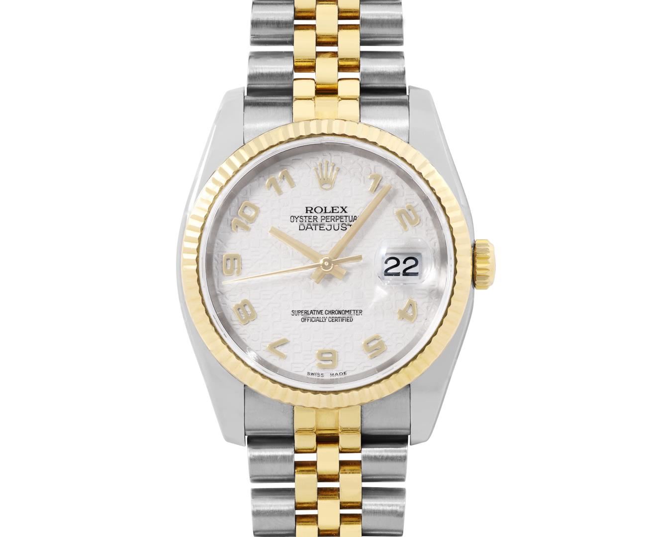 One Mens Pre Owned Sapphire 18K Yellow Gold And Stainless Steel Rolex Datejust 36MM Polished, Serviced And Electronically Tested, Rolex Yellow Gold And Stainless Steel Case: 36mm, Rolex Yellow Gold Crown, Rolex Bezel: 18K Yellow Gold Fluted Bezel. Crystal: Sapphire With Magnified Date Window. Rolex Hands: Solid Hands. Rolex Movement: Automatic Winding Movement 3135. Rolex Dial: Factory Cream Jubilee Arabic Dial. Date Window: 3 O'Clock Position Date Display, Quickset, Model: Quickset Datejust. Condition: G-6 Extra Fine. Rolex Bracelet: Two Tone 18K Yellow Gold And Stainless Steel Jubilee Band. Bright Polish. 7.0 Inch Length, Adjustable. Hidden Clasp, With Rolex Logo. This Watch Has Been Serviced And Polished It Is Free Of All Scratches And Dents. This Watch Comes With Rolex Box.