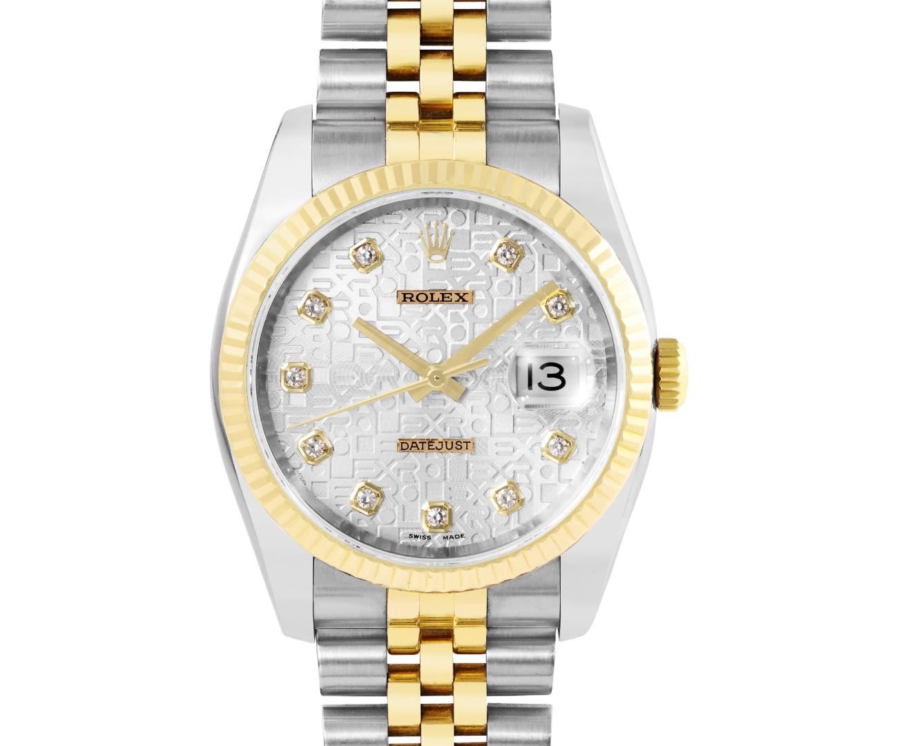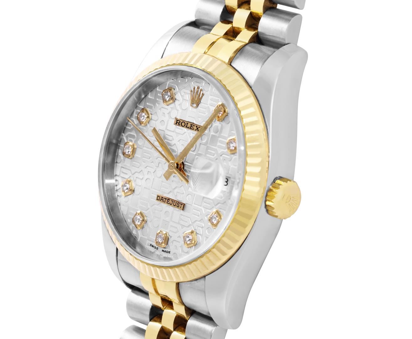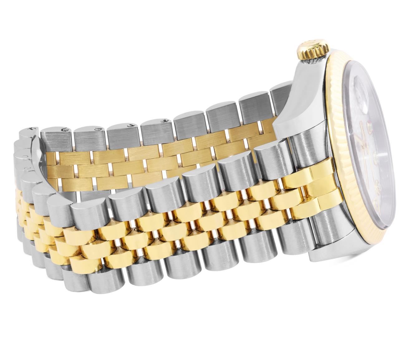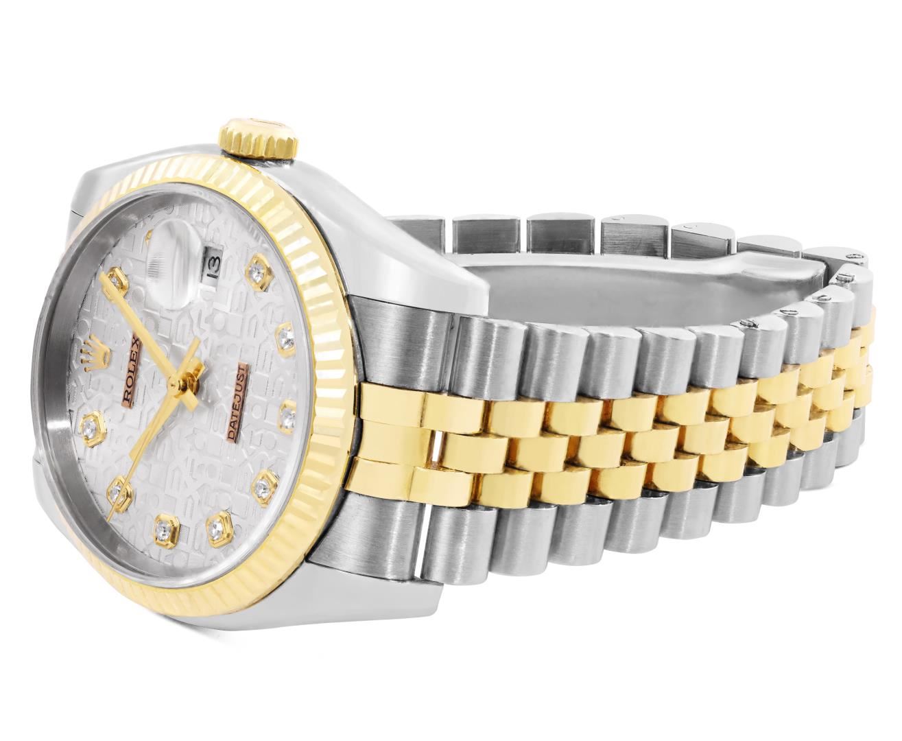 One Mens Pre Owned 18K Yellow Gold And Stainless Steel Rolex Datejust 36MM Polished, Serviced & Electronically Tested, Rolex Yellow Gold And Stainless Steel Case: 36mm, Rolex Yellow Gold Crown, Rolex Bezel: 18K Yellow Gold Fluted Bezel. Crystal: Sapphire With Magnified Date Window. Rolex Hands: Solid Hands. Rolex Movement: Automatic Winding Movement 3235. Rolex Dial: Factory Silver Jubilee Diamond Dial Diamond Count: 10 Diamonds On Dial, Clarity: VVS. Date Window: 3 O'Clock Position Date Display, Quickset, Model: Quickset Datejust. Condition: G-6 Extra Fine. Rolex Bracelet: Two Tone 18K Yellow Gold And Stainless Steel Jubilee Band. Bright Polish. 7.0 Inch Length, Adjustable. Hidden Clasp, With Rolex Logo. This Watch Has Been Serviced And Polished It Is Free Of All Scratches And Dents. This Watch Comes With Rolex Box.