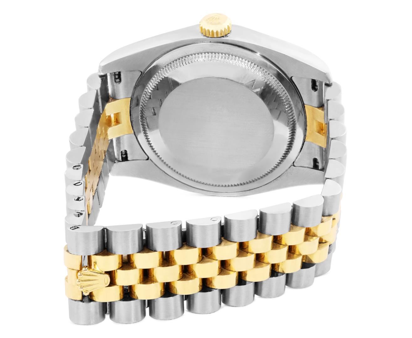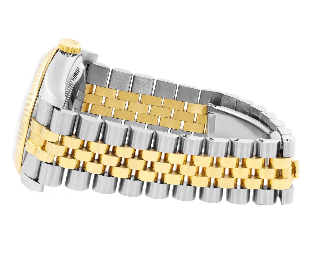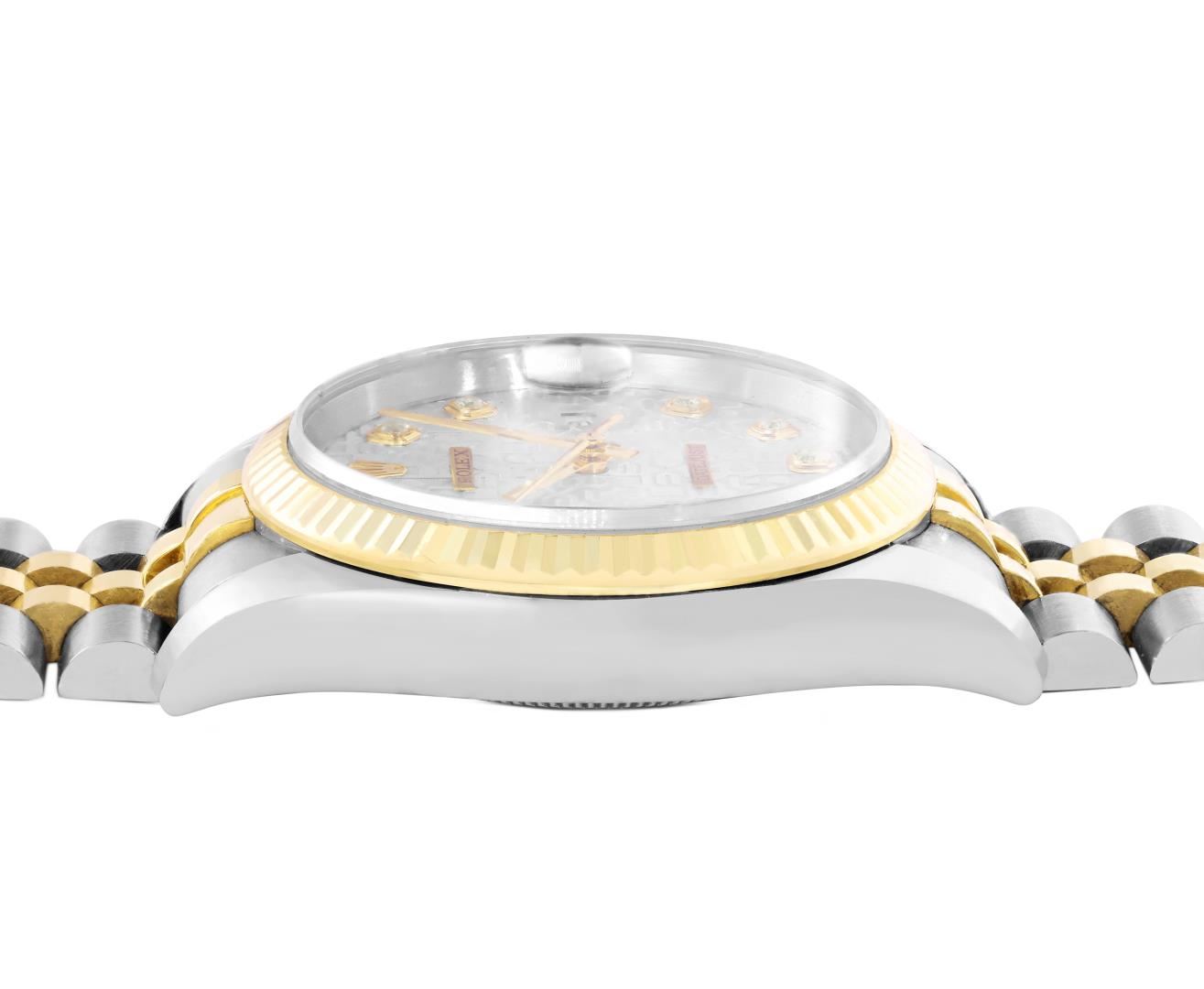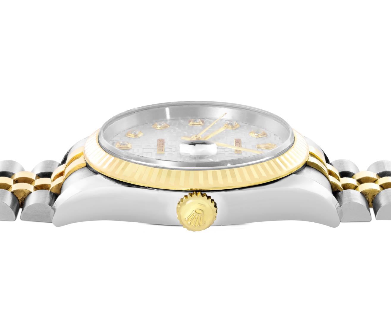 One Mens Pre Owned 18K Yellow Gold And Stainless Steel Rolex Datejust 36MM Polished, Serviced & Electronically Tested, Rolex Yellow Gold And Stainless Steel Case: 36mm, Rolex Yellow Gold Crown, Rolex Bezel: 18K Yellow Gold Fluted Bezel. Crystal: Sapphire With Magnified Date Window. Rolex Hands: Solid Hands. Rolex Movement: Automatic Winding Movement 3235. Rolex Dial: Factory Silver Jubilee Diamond Dial Diamond Count: 10 Diamonds On Dial, Clarity: VVS. Date Window: 3 O'Clock Position Date Display, Quickset, Model: Quickset Datejust. Condition: G-6 Extra Fine. Rolex Bracelet: Two Tone 18K Yellow Gold And Stainless Steel Jubilee Band. Bright Polish. 7.0 Inch Length, Adjustable. Hidden Clasp, With Rolex Logo. This Watch Has Been Serviced And Polished It Is Free Of All Scratches And Dents. This Watch Comes With Rolex Box.