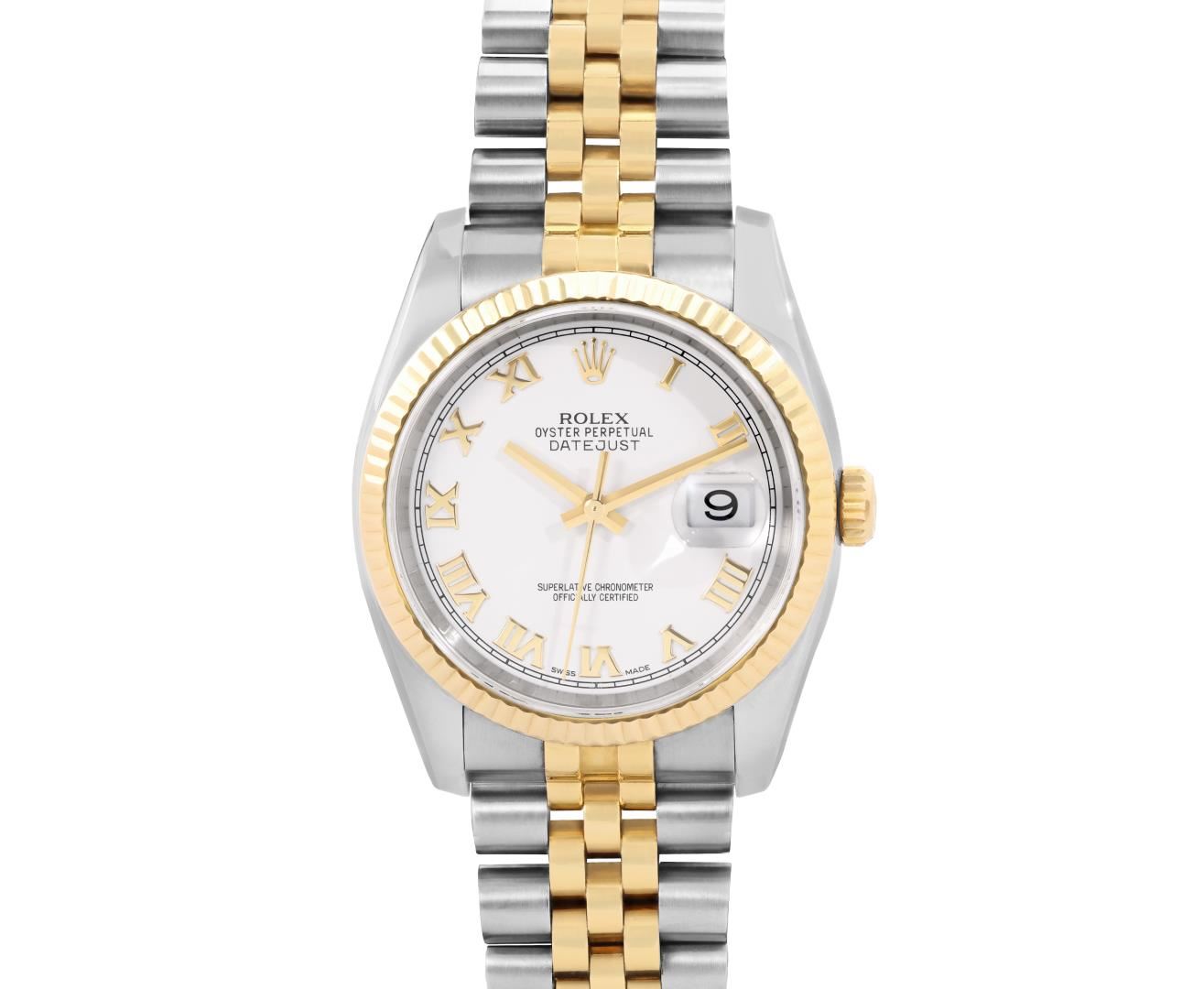 One Mens Pre Owned Sapphire 18K Yellow Gold And Stainless Steel Rolex Datejust 36MM Polished, Serviced And Electronically Tested, Rolex Yellow Gold And Stainless Steel Case: 36mm, Rolex Yellow Gold Crown, Rolex Bezel: 18K Yellow Gold Fluted Bezel. Crystal: Sapphire With Magnified Date Window. Rolex Hands: Solid Hands. Rolex Movement: Automatic Winding Movement 3135. Rolex Dial: Factory White Roman Dial. Date Window: 3 O'Clock Position Date Display, Quickset, Model: Quickset Datejust. Condition: G-6 Extra Fine. Rolex Bracelet: Two Tone 18K Yellow Gold And Stainless Steel Jubilee Band. Bright Polish. 7.0 Inch Length, Adjustable. Hidden Clasp, With Rolex Logo. This Watch Has Been Serviced And Polished It Is Free Of All Scratches And Dents. This Watch Comes With Rolex Box.