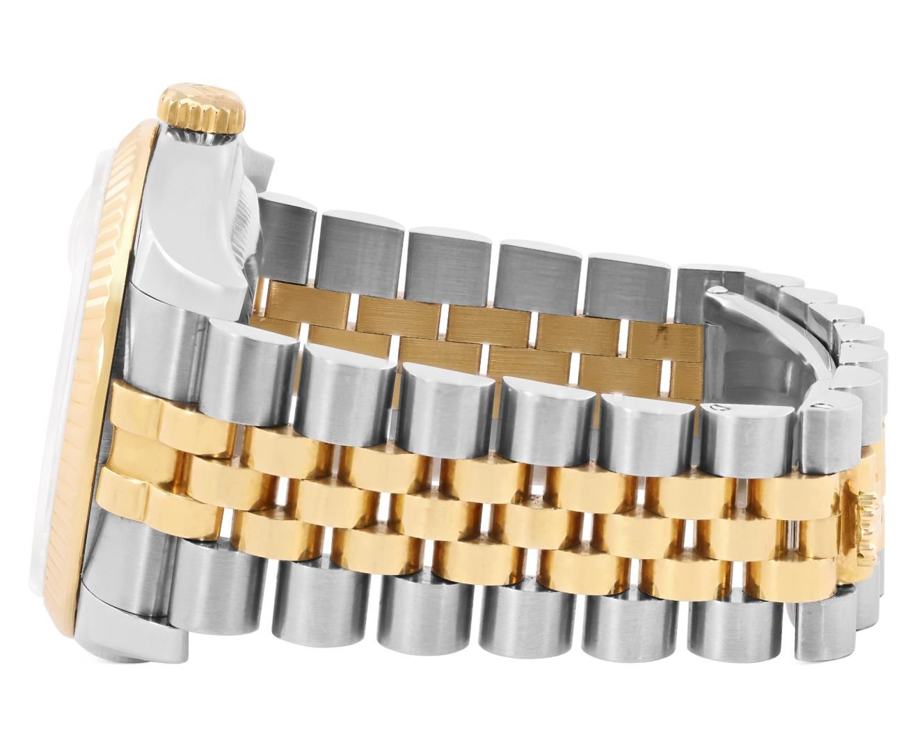One Mens Pre Owned Sapphire 18K Yellow Gold And Stainless Steel Rolex Datejust 36MM Polished, Serviced And Electronically Tested, Rolex Yellow Gold And Stainless Steel Case: 36mm, Rolex Yellow Gold Crown, Rolex Bezel: 18K Yellow Gold Fluted Bezel. Crystal: Sapphire With Magnified Date Window. Rolex Hands: Solid Hands. Rolex Movement: Automatic Winding Movement 3135. Rolex Dial: Factory White Roman Dial. Date Window: 3 O'Clock Position Date Display, Quickset, Model: Quickset Datejust. Condition: G-6 Extra Fine. Rolex Bracelet: Two Tone 18K Yellow Gold And Stainless Steel Jubilee Band. Bright Polish. 7.0 Inch Length, Adjustable. Hidden Clasp, With Rolex Logo. This Watch Has Been Serviced And Polished It Is Free Of All Scratches And Dents. This Watch Comes With Rolex Box.