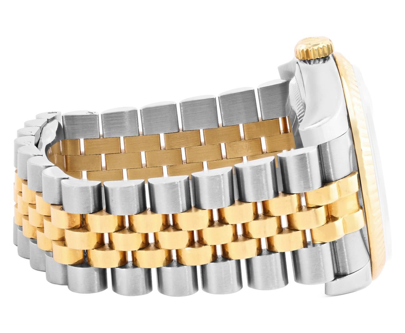 One Mens Pre Owned Sapphire 18K Yellow Gold And Stainless Steel Rolex Datejust 36MM Polished, Serviced And Electronically Tested, Rolex Yellow Gold And Stainless Steel Case: 36mm, Rolex Yellow Gold Crown, Rolex Bezel: 18K Yellow Gold Fluted Bezel. Crystal: Sapphire With Magnified Date Window. Rolex Hands: Solid Hands. Rolex Movement: Automatic Winding Movement 3135. Rolex Dial: Factory White Roman Dial. Date Window: 3 O'Clock Position Date Display, Quickset, Model: Quickset Datejust. Condition: G-6 Extra Fine. Rolex Bracelet: Two Tone 18K Yellow Gold And Stainless Steel Jubilee Band. Bright Polish. 7.0 Inch Length, Adjustable. Hidden Clasp, With Rolex Logo. This Watch Has Been Serviced And Polished It Is Free Of All Scratches And Dents. This Watch Comes With Rolex Box.