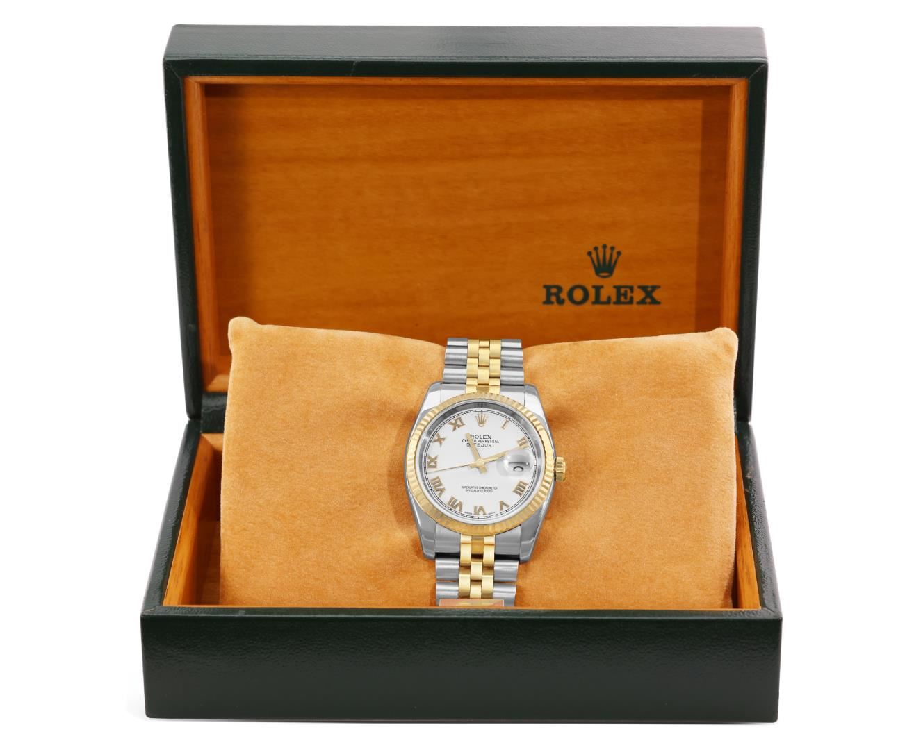 One Mens Pre Owned Sapphire 18K Yellow Gold And Stainless Steel Rolex Datejust 36MM Polished, Serviced And Electronically Tested, Rolex Yellow Gold And Stainless Steel Case: 36mm, Rolex Yellow Gold Crown, Rolex Bezel: 18K Yellow Gold Fluted Bezel. Crystal: Sapphire With Magnified Date Window. Rolex Hands: Solid Hands. Rolex Movement: Automatic Winding Movement 3135. Rolex Dial: Factory White Roman Dial. Date Window: 3 O'Clock Position Date Display, Quickset, Model: Quickset Datejust. Condition: G-6 Extra Fine. Rolex Bracelet: Two Tone 18K Yellow Gold And Stainless Steel Jubilee Band. Bright Polish. 7.0 Inch Length, Adjustable. Hidden Clasp, With Rolex Logo. This Watch Has Been Serviced And Polished It Is Free Of All Scratches And Dents. This Watch Comes With Rolex Box.