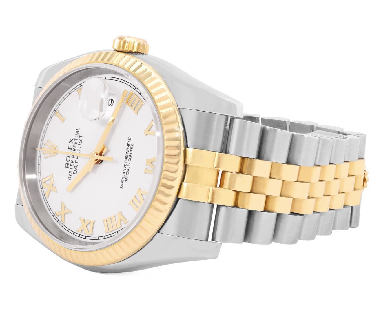 One Mens Pre Owned Sapphire 18K Yellow Gold And Stainless Steel Rolex Datejust 36MM Polished, Serviced And Electronically Tested, Rolex Yellow Gold And Stainless Steel Case: 36mm, Rolex Yellow Gold Crown, Rolex Bezel: 18K Yellow Gold Fluted Bezel. Crystal: Sapphire With Magnified Date Window. Rolex Hands: Solid Hands. Rolex Movement: Automatic Winding Movement 3135. Rolex Dial: Factory White Roman Dial. Date Window: 3 O'Clock Position Date Display, Quickset, Model: Quickset Datejust. Condition: G-6 Extra Fine. Rolex Bracelet: Two Tone 18K Yellow Gold And Stainless Steel Jubilee Band. Bright Polish. 7.0 Inch Length, Adjustable. Hidden Clasp, With Rolex Logo. This Watch Has Been Serviced And Polished It Is Free Of All Scratches And Dents. This Watch Comes With Rolex Box.