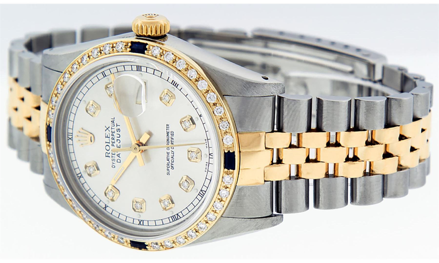One Mens Pre Owned Two Tone Yellow Gold And Stainless Steel Rolex Datejust Polished, Serviced And Electronically Tested, Rolex Yellow Gold And Stainless Steel Case: 36mm, Yellow Gold Crown, Custom Bezel: New 18K Yellow Gold Sapphire Beadset Diamond Bezel, Diamond Count: 36 Diamonds + 4 Sapphires. Custom Crystal: New Sapphire With Magnified Date. Custom Hands: New Luminescent Hands. Rolex Movement: Automatic Winding Movement 3035. Custom Dial: Custom Silver Dial With Added Diamonds, Diamond Count: 10 Diamonds On Dial. Date Window: 3 O'Clock Position Date Display, Quickset, Model: Datejust. Condition: G-6 Extra Fine. Rolex Bracelet: Two Tone Yellow Gold And Stainless Steel Jubilee Band. Bright Polish. 7.0 Inch Length, Adjustable. Standard Clasp, With Rolex Logo. This Watch Has Been Serviced Time Tested And Is In Excellent Condition It Is Free Of All Scratches And Dents.