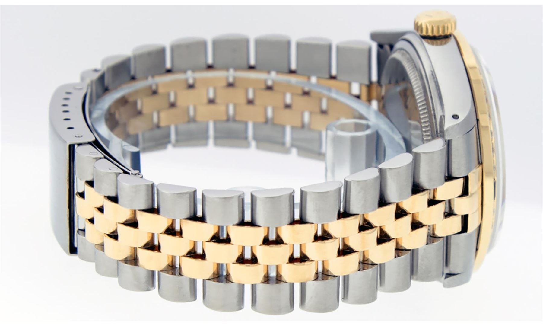 One Mens Pre Owned Two Tone Yellow Gold And Stainless Steel Rolex Datejust Polished, Serviced And Electronically Tested, Rolex Case: Yellow Gold And Stainless Steel Case: 36mm, Yellow Gold Crown, Custom Bezel: New 18K Yellow Gold Sapphire Beadset Diamond Bezel, Diamond Count: 36 Diamonds + 4 Sapphires. Custom Crystal: New Sapphire With Magnified Date Window. Rolex Movement: Automatic Winding Movement 3035. Custom Dial: Custom White Dial Set With Added Diamond Hour Markers, Diamond Count: 8 + 2 Baguette Diamonds On Dial. Date Window: 3 O'Clock Position Date Display, Quickset, Model: Datejust. Condition: G-6 Extra Fine. Rolex Bracelet: Two Tone Yellow Gold And Stainless Steel Jubilee Band. Bright Polish. 7.0 Inch Length, Adjustable. Standard Clasp, With Rolex Logo. This Watch Has Been Serviced Time Tested And Is In Excellent Condition It Is Free Of All Scratches And Dents.
