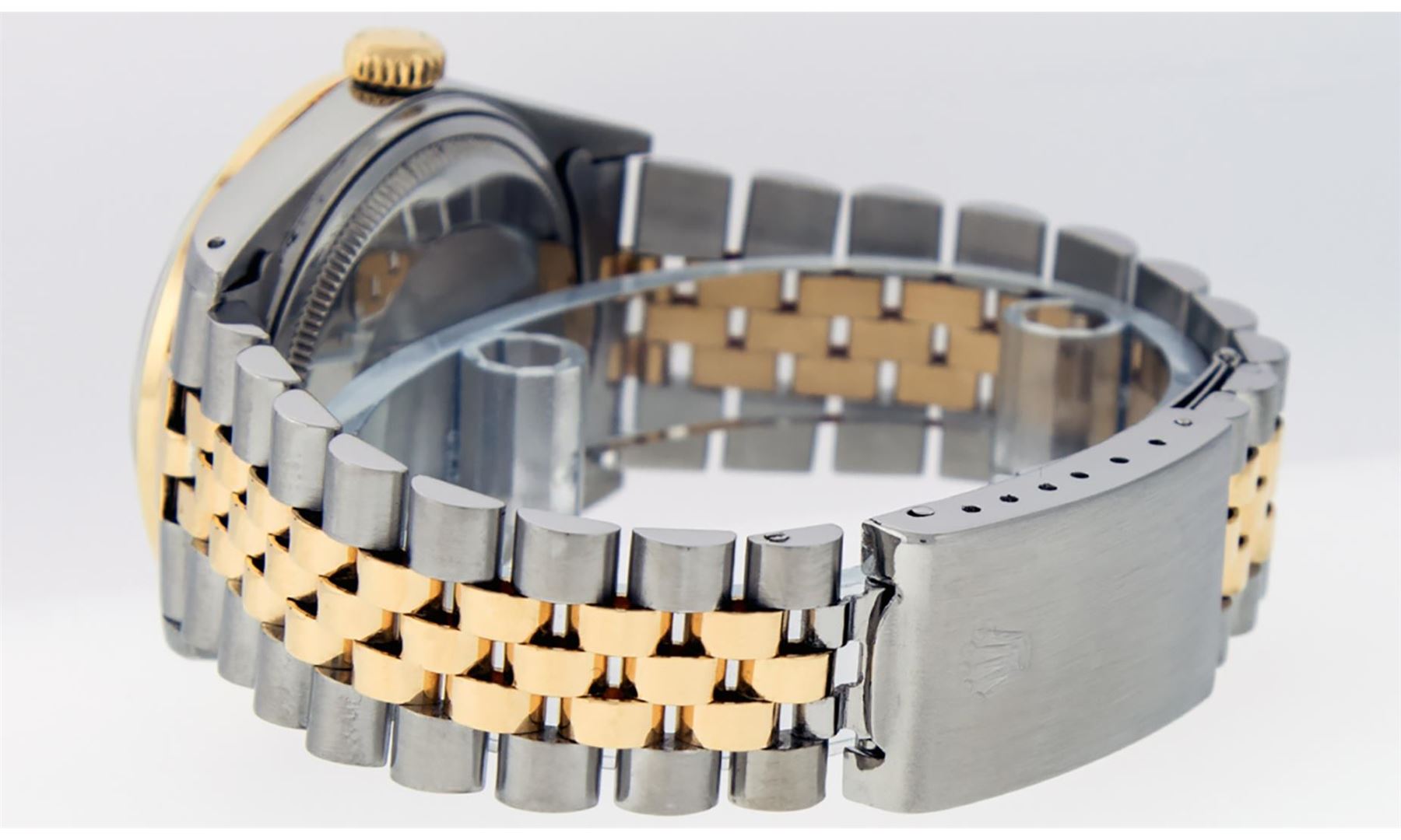 One Mens Pre Owned Yellow Gold And Stainless Steel Two Tone Rolex Datejust Polished, Serviced & Electronically Tested, Rolex Yellow Gold & Stainless Steel Case: 36mm, Rolex Yellow Gold Crown, Custom Bezel: New 18K Yellow Gold Sapphire Beadset Diamond Bezel, Stone Count: 36 Diamonds + 4 Sapphires. Custom Crystal: New Sapphire With Magnified Date. Custom Hands: New Luminescent Hands. Rolex Movement: Automatic Winding Movement 3035. Custom Dial: Custom White Diamond Dial With Added Diamond Hour Markers, Diamond Count: 10 Diamonds. Date Window: 3 O'Clock Position Date Display, Quickset, Model: Datejust. Condition: G-6 Extra Fine. Rolex Bracelet: Two Tone Yellow Gold & Stainless Steel Jubilee Band. Bright Polish. 7.0 Inch Length, Adjustable. Standard Clasp, With Rolex Logo. This Watch Has Been Serviced Time Tested And Is In Excellent Condition It Is Free Of All Scratches And Dents.