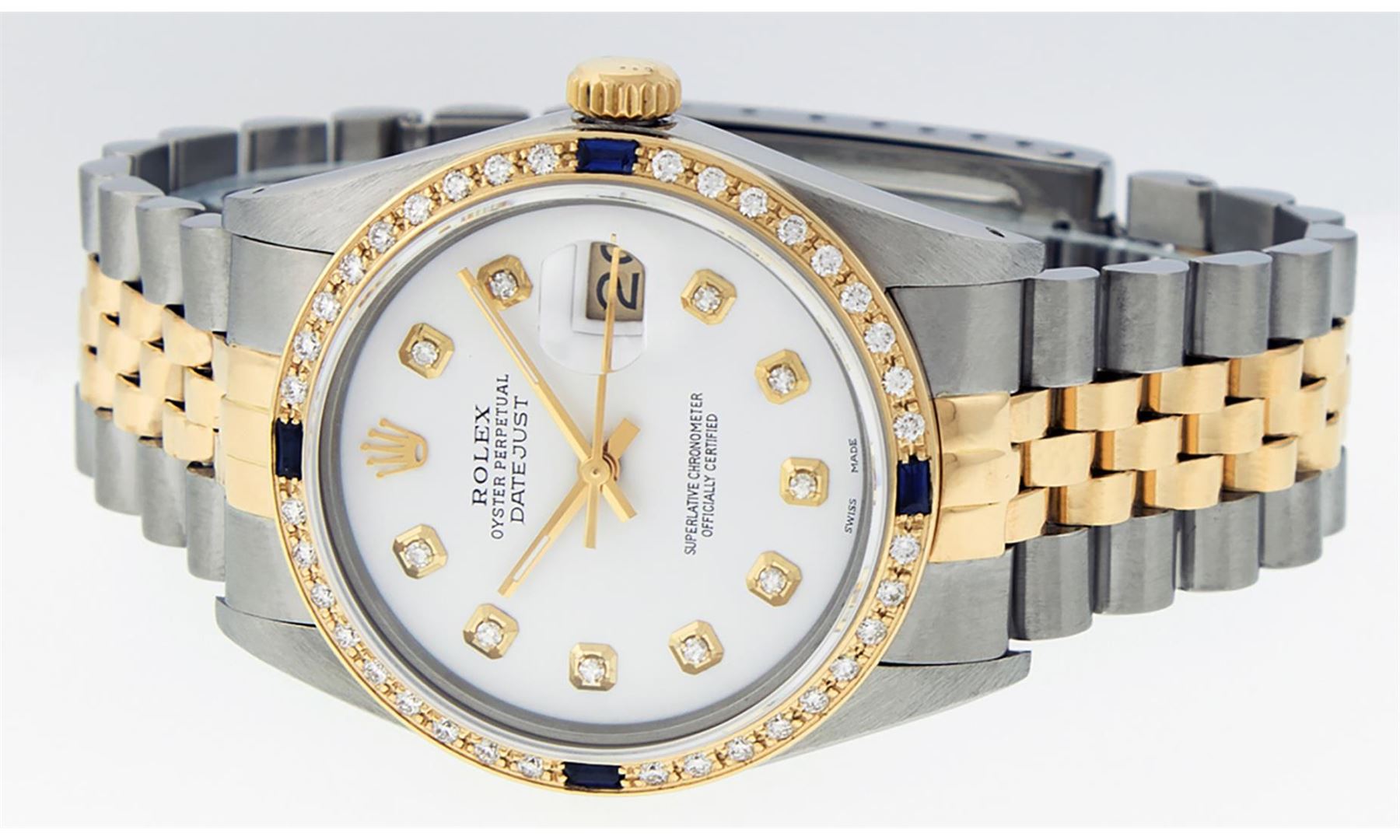 One Mens Pre Owned Yellow Gold And Stainless Steel Two Tone Rolex Datejust Polished, Serviced & Electronically Tested, Rolex Yellow Gold & Stainless Steel Case: 36mm, Rolex Yellow Gold Crown, Custom Bezel: New 18K Yellow Gold Sapphire Beadset Diamond Bezel, Stone Count: 36 Diamonds + 4 Sapphires. Custom Crystal: New Sapphire With Magnified Date. Custom Hands: New Luminescent Hands. Rolex Movement: Automatic Winding Movement 3035. Custom Dial: Custom White Diamond Dial With Added Diamond Hour Markers, Diamond Count: 10 Diamonds. Date Window: 3 O'Clock Position Date Display, Quickset, Model: Datejust. Condition: G-6 Extra Fine. Rolex Bracelet: Two Tone Yellow Gold & Stainless Steel Jubilee Band. Bright Polish. 7.0 Inch Length, Adjustable. Standard Clasp, With Rolex Logo. This Watch Has Been Serviced Time Tested And Is In Excellent Condition It Is Free Of All Scratches And Dents.