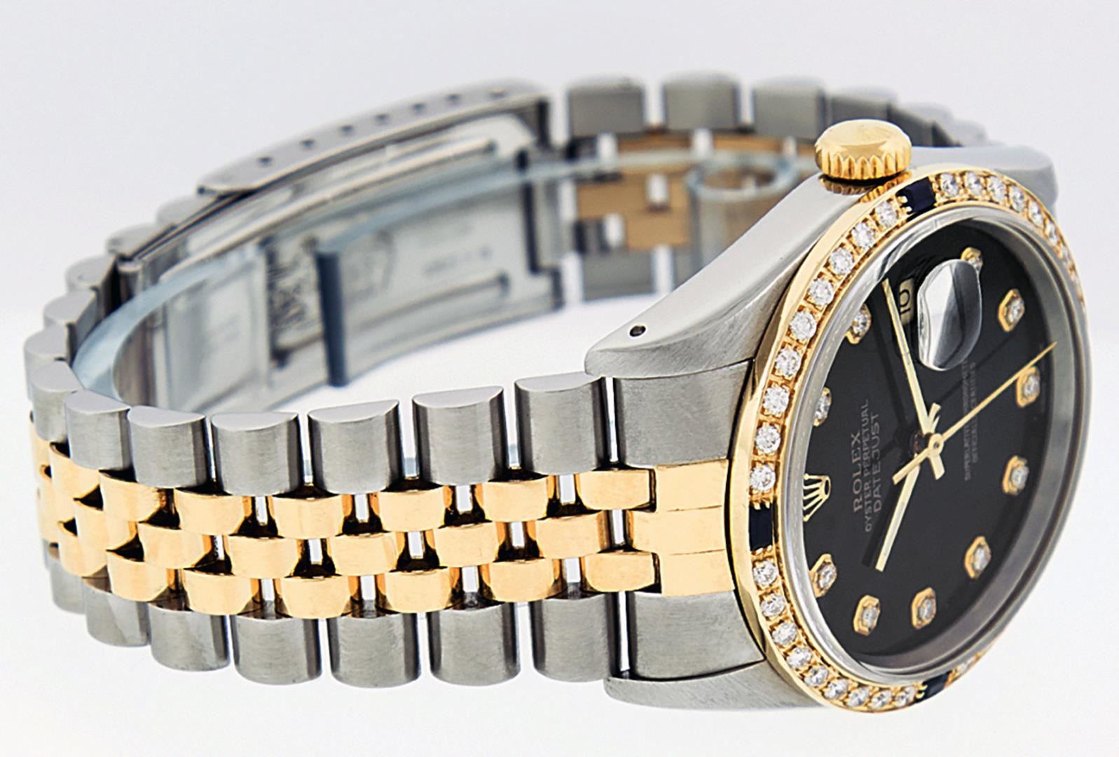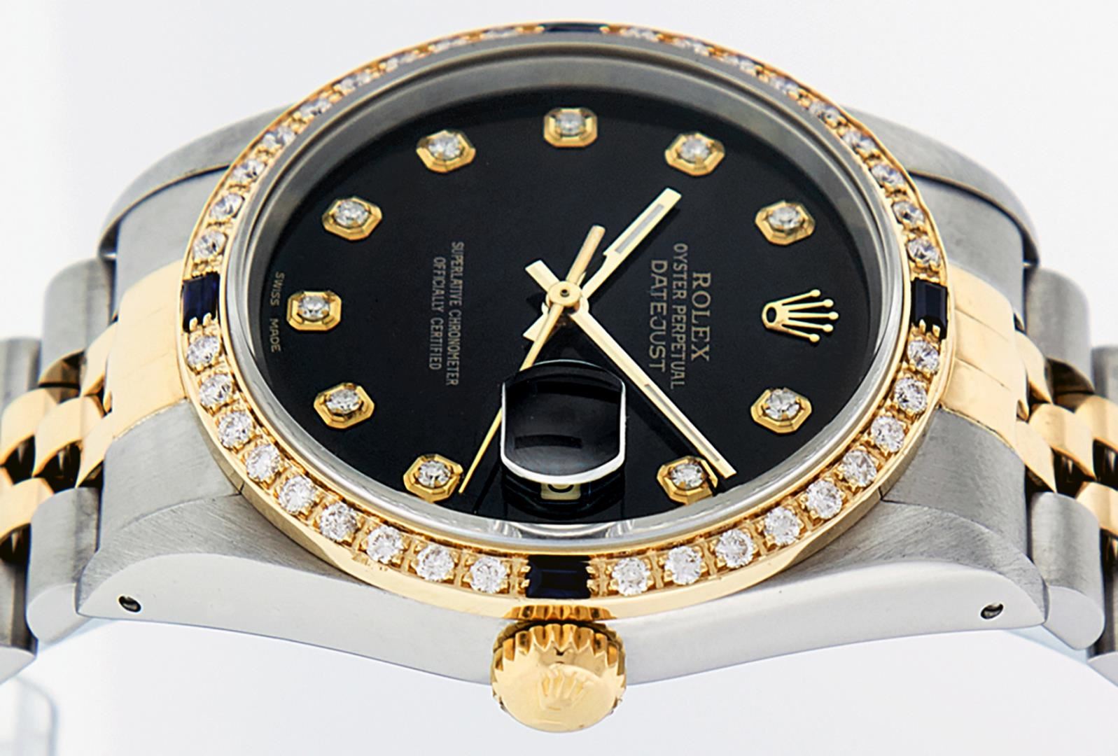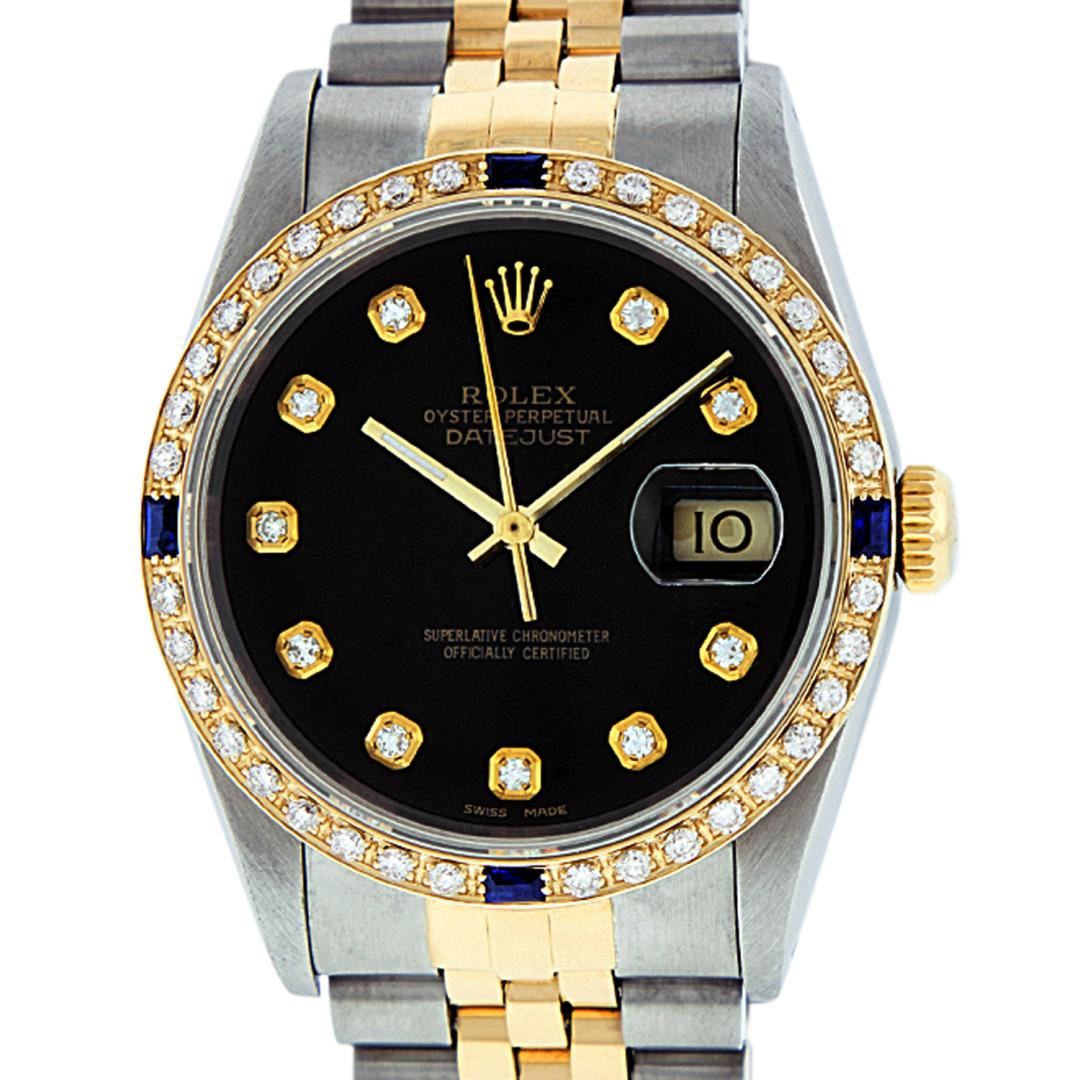 One Mens Pre Owned Rolex Two Tone Yellow Gold And Stainless Steel Rolex Datejust Polished, Serviced & Electronically Tested, Rolex Yellow Gold & Stainless Steel Case: 36mm, Rolex Yellow Gold Crown, Custom Bezel: New 18K Yellow Gold Beadset + Sapphire Diamond Bezel, Stone Count: 36 Diamonds + 4 Sapphires On The Bezel. Custom Crystal: New Sapphire With Date Window. Custom Hands: New Luminescent Hands. Rolex Movement: Automatic Winding Movement 3035. Custom Dial: Custom Black Dial With Added Diamonds. Diamond Count: 10 Diamonds On Dial. Date Window: 3 O'Clock Position Date Display, Quickset, Model: Datejust. Condition: G-6 Extra Fine. Rolex Bracelet: Two Tone Yellow Gold And Stainless Steel Jubilee Band. Bright Polish. 7.0 Inch Length, Adjustable. Standard Clasp, With Rolex Logo. This Watch Has Been Serviced Time Tested And Is In Excellent Condition It Is Free Of All Scratches And Dents.