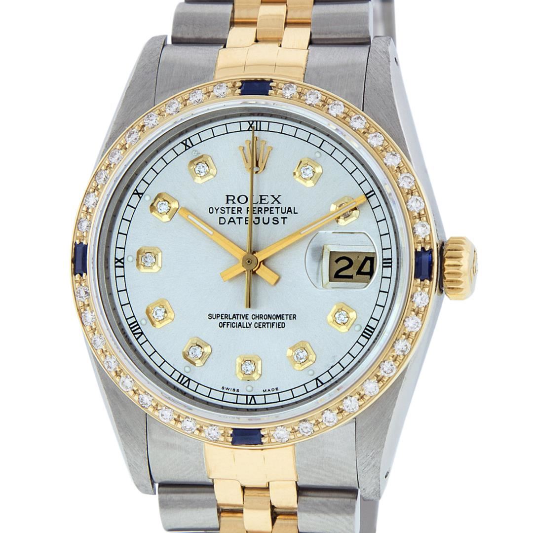 One Mens Pre Owned Two Tone Yellow Gold And Stainless Steel Rolex Datejust Polished, Serviced And Electronically Tested, Rolex Yellow Gold And Stainless Steel Case: 36mm, Yellow Gold Crown, Custom Bezel: New 18K Yellow Gold Sapphire Beadset Diamond Bezel, Diamond Count: 36 Diamonds + 4 Sapphires. Custom Crystal: New Sapphire With Magnified Date. Custom Hands: New Luminescent Hands. Rolex Movement: Automatic Winding Movement 3035. Custom Dial: Custom Silver Dial With Added Diamonds, Diamond Count: 10 Diamonds On Dial. Date Window: 3 O'Clock Position Date Display, Quickset, Model: Datejust. Condition: G-6 Extra Fine. Rolex Bracelet: Two Tone Yellow Gold And Stainless Steel Jubilee Band. Bright Polish. 7.0 Inch Length, Adjustable. Standard Clasp, With Rolex Logo. This Watch Has Been Serviced Time Tested And Is In Excellent Condition It Is Free Of All Scratches And Dents.