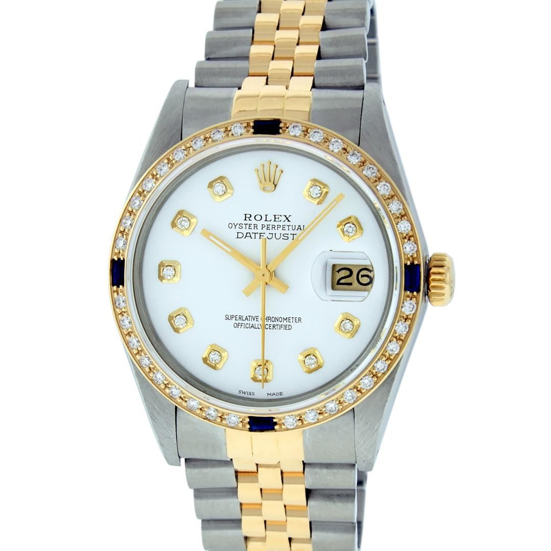 One Mens Pre Owned Yellow Gold And Stainless Steel Two Tone Rolex Datejust Polished, Serviced & Electronically Tested, Rolex Yellow Gold & Stainless Steel Case: 36mm, Rolex Yellow Gold Crown, Custom Bezel: New 18K Yellow Gold Sapphire Beadset Diamond Bezel, Stone Count: 36 Diamonds + 4 Sapphires. Custom Crystal: New Sapphire With Magnified Date. Custom Hands: New Luminescent Hands. Rolex Movement: Automatic Winding Movement 3035. Custom Dial: Custom White Diamond Dial With Added Diamond Hour Markers, Diamond Count: 10 Diamonds. Date Window: 3 O'Clock Position Date Display, Quickset, Model: Datejust. Condition: G-6 Extra Fine. Rolex Bracelet: Two Tone Yellow Gold & Stainless Steel Jubilee Band. Bright Polish. 7.0 Inch Length, Adjustable. Standard Clasp, With Rolex Logo. This Watch Has Been Serviced Time Tested And Is In Excellent Condition It Is Free Of All Scratches And Dents.