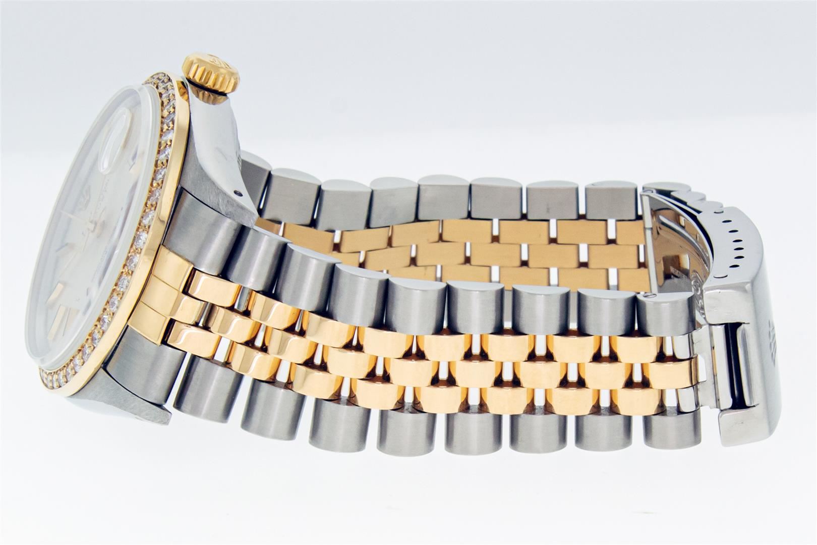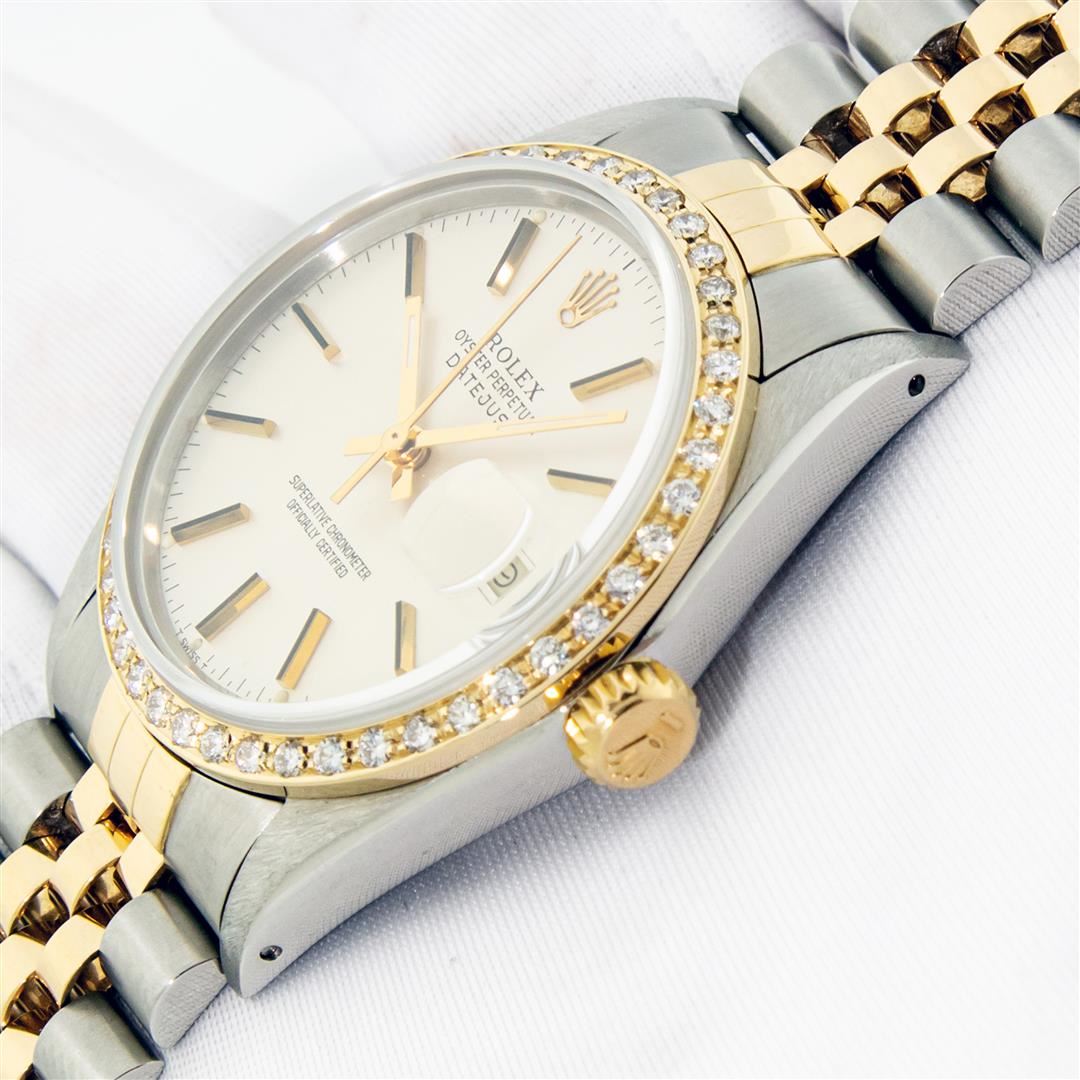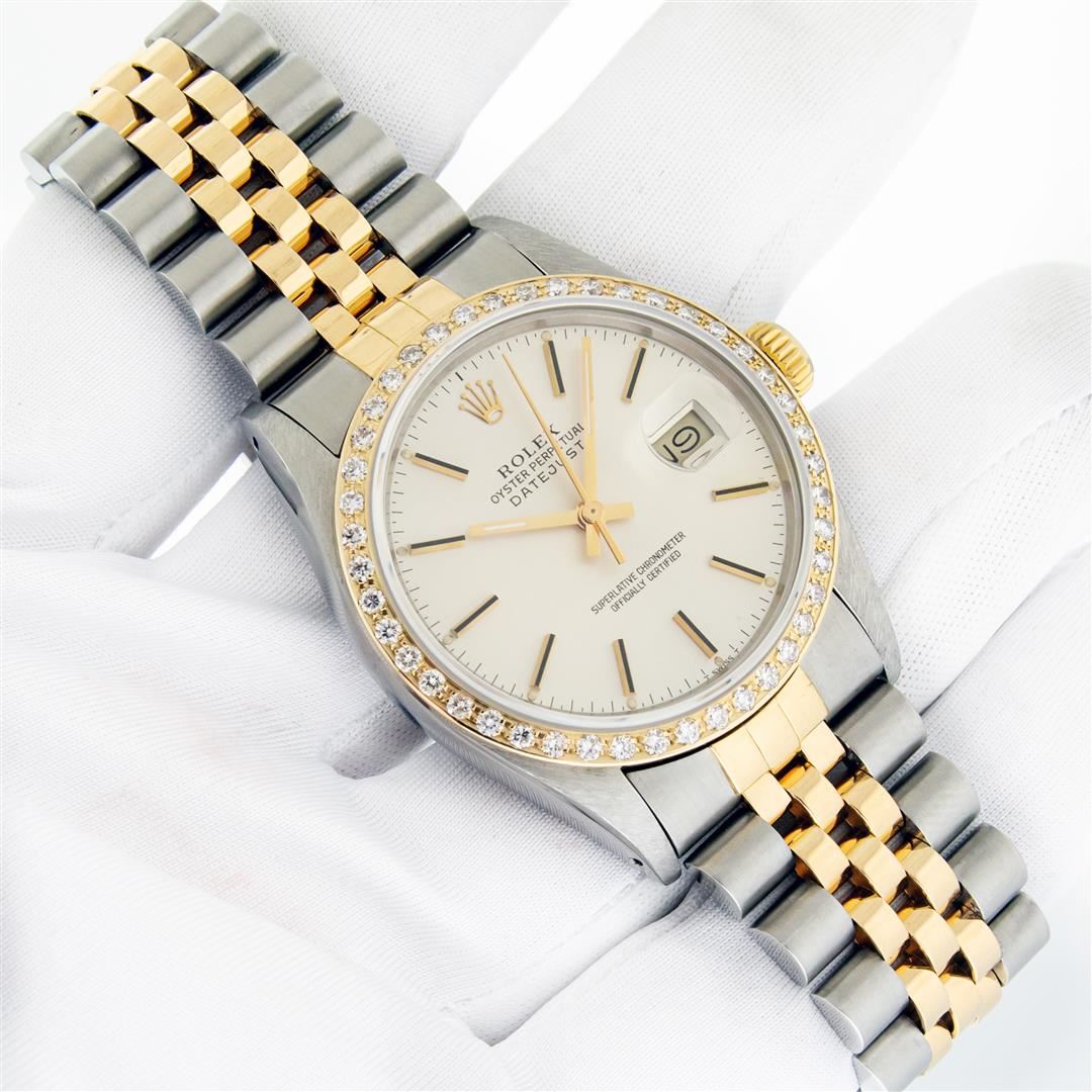 One Mens Pre Owned Two Tone Yellow Gold and Stainless Steel Rolex Datejust Polished, Serviced & Electronically Tested, Rolex Yellow Gold & Stainless Steel Case: 36mm, Rolex Yellow Gold Crown, Custom Bezel: New 18K Yellow Gold Beadset Diamond Bezel, Diamond Count: 44 Diamonds. Custom Crystal: New Sapphire With Magnified Date Window. Custom Hands: New Luminecent Hands. Rolex Movement: Automatic Winding Movement. Rolex Dial: Silver Index Dial With Dash Track. Date Window: 3 O'Clock Position Date Display, Quickset, Model: Condition: G-6 Extra Fine. Rolex Bracelet: Two Tone Yellow Gold & Stainless Steel Jubilee Band. Bright Polish. 7.0 Inch Length, Adjustable. Standard Clasp, With Rolex Logo. This Watch Has Been Serviced Time Tested And Is In Excellent Condition It Is Free Of All Scratches And Dents.