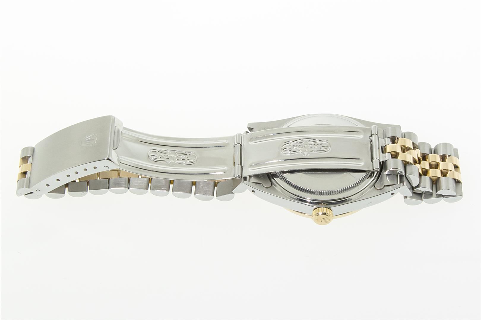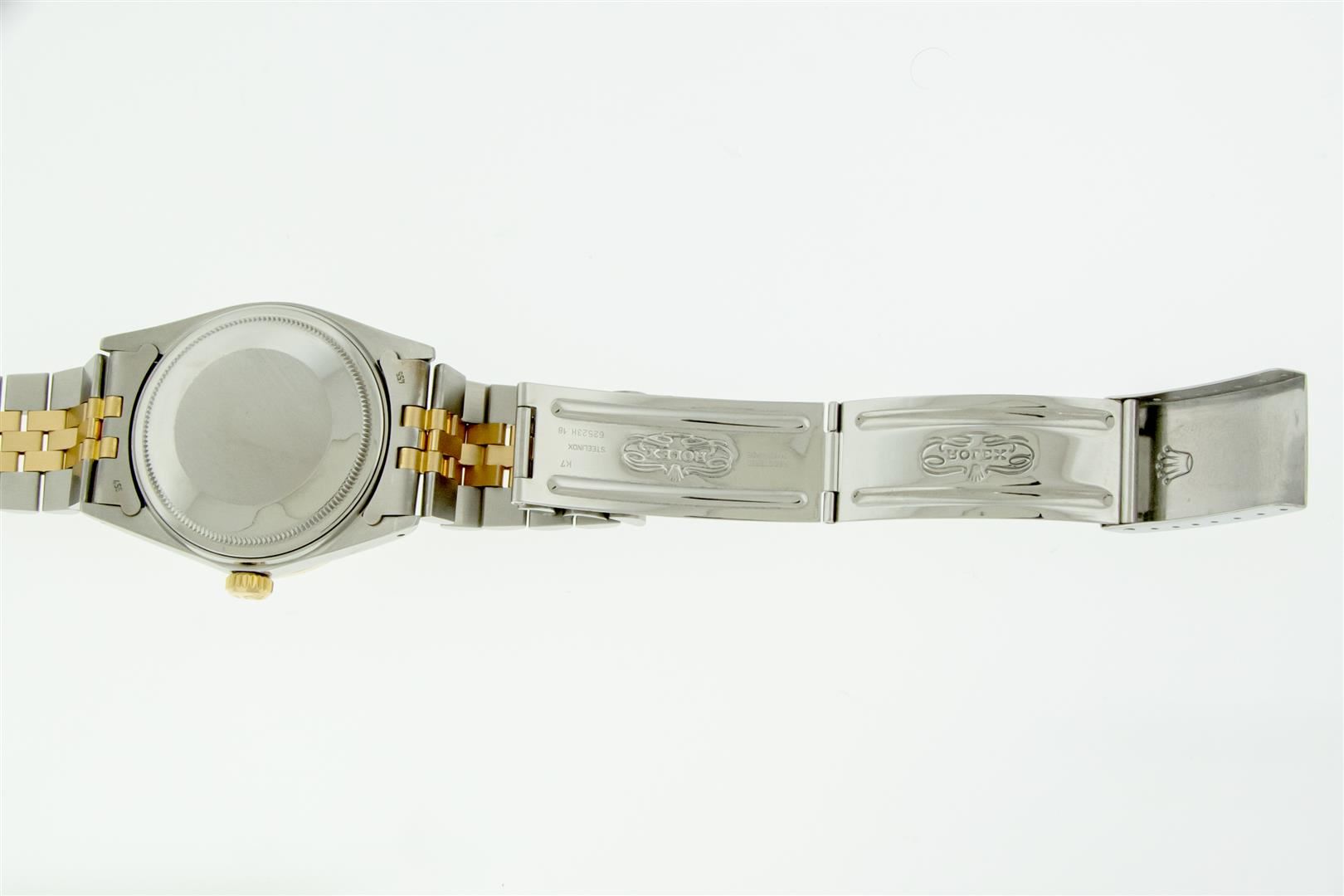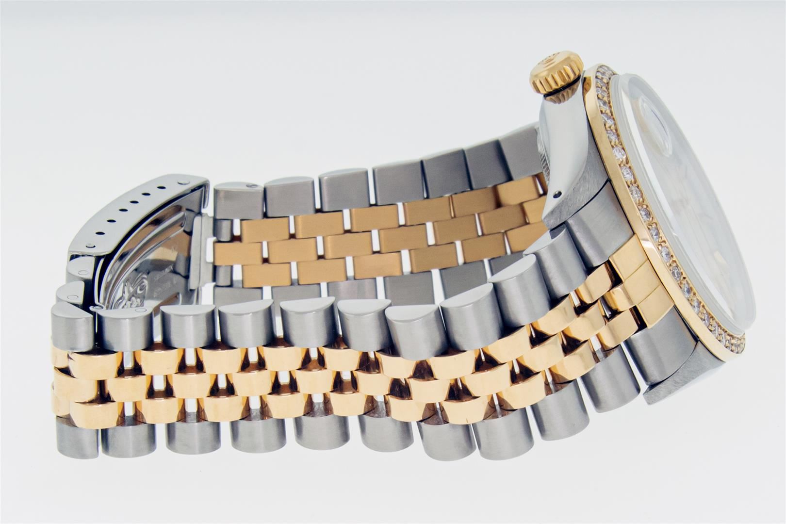 One Mens Pre Owned Two Tone Yellow Gold and Stainless Steel Rolex Datejust Polished, Serviced & Electronically Tested, Rolex Yellow Gold & Stainless Steel Case: 36mm, Rolex Yellow Gold Crown, Custom Bezel: New 18K Yellow Gold Beadset Diamond Bezel, Diamond Count: 44 Diamonds. Custom Crystal: New Sapphire With Magnified Date Window. Custom Hands: New Luminecent Hands. Rolex Movement: Automatic Winding Movement. Rolex Dial: Silver Index Dial With Dash Track. Date Window: 3 O'Clock Position Date Display, Quickset, Model: Condition: G-6 Extra Fine. Rolex Bracelet: Two Tone Yellow Gold & Stainless Steel Jubilee Band. Bright Polish. 7.0 Inch Length, Adjustable. Standard Clasp, With Rolex Logo. This Watch Has Been Serviced Time Tested And Is In Excellent Condition It Is Free Of All Scratches And Dents.