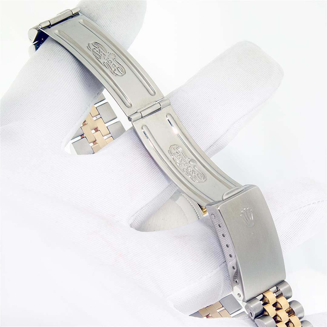 One Mens Pre Owned Two Tone Yellow Gold and Stainless Steel Rolex Datejust Polished, Serviced & Electronically Tested, Rolex Yellow Gold & Stainless Steel Case: 36mm, Rolex Yellow Gold Crown, Custom Bezel: New 18K Yellow Gold Beadset Diamond Bezel, Diamond Count: 44 Diamonds. Custom Crystal: New Sapphire With Magnified Date Window. Custom Hands: New Luminecent Hands. Rolex Movement: Automatic Winding Movement. Rolex Dial: Silver Index Dial With Dash Track. Date Window: 3 O'Clock Position Date Display, Quickset, Model: Condition: G-6 Extra Fine. Rolex Bracelet: Two Tone Yellow Gold & Stainless Steel Jubilee Band. Bright Polish. 7.0 Inch Length, Adjustable. Standard Clasp, With Rolex Logo. This Watch Has Been Serviced Time Tested And Is In Excellent Condition It Is Free Of All Scratches And Dents.