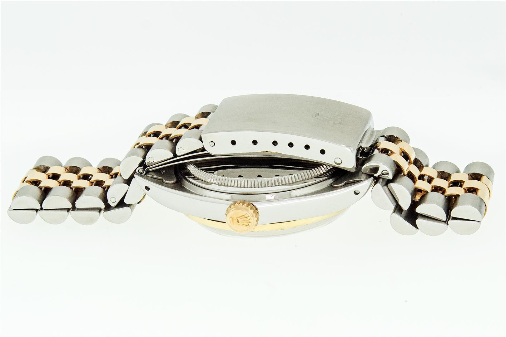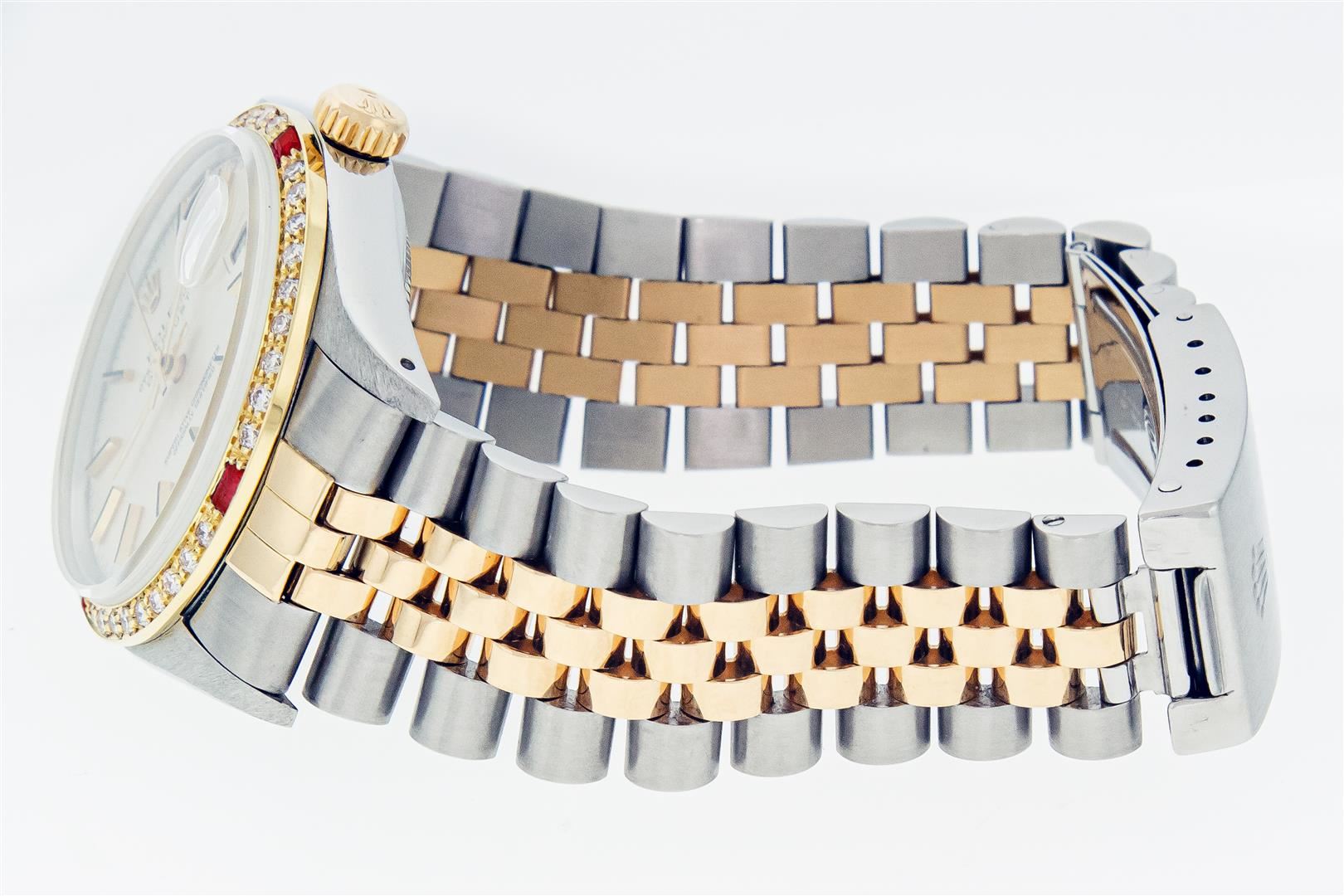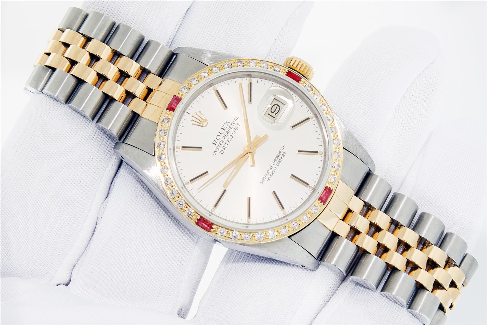 One Mens Pre Owned Two Tone Yellow Gold & Stainless Steel Rolex Datejust Polished, Serviced & Electronically Tested, Yellow Gold & Stainless Steel Case: 36mm, Rolex Yellow Gold Crown, Custom Bezel: New 18K Yellow Gold Ruby Beadset Diamond Bezel, Diamond Count: 36 Diamonds + 4 Rubies, Clarity: SI-VS, Color: G to H. Custom Crystal: New Sapphire With Magnified Date Window. Custom Hands: New Hands. Rolex Movement: Automatic Winding Movement. Rolex Factory Dial: Silver Index With Dash Track & Lumi Dots. Date Window: 3 O'Clock Position Date Display, Quickset, Model: Datejust. Condition: G-6 Extra Fine. Rolex Bracelet: Two Tone Yellow Gold & Stainless Steel Jubilee Band. Bright Polish. 7.0 Inch Length, Adjustable. Standard Clasp, With Rolex Logo. This Watch Has Been Serviced Time Tested And Is In Excellent Condition It Is Free Of All Scratches And Dents.