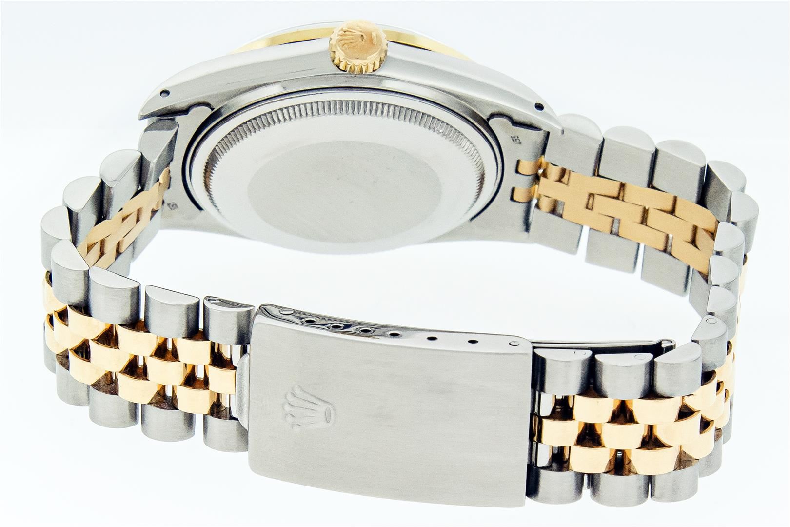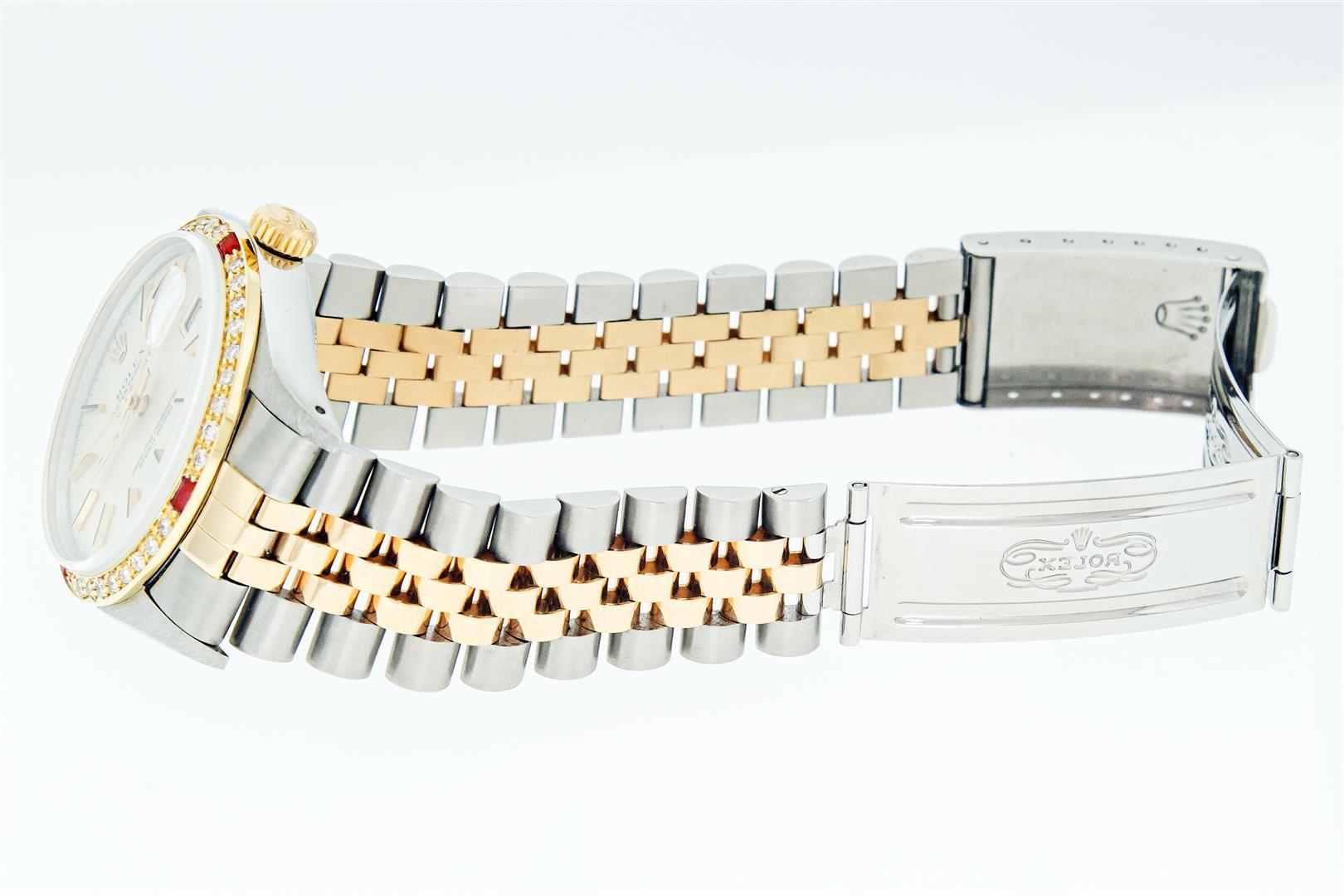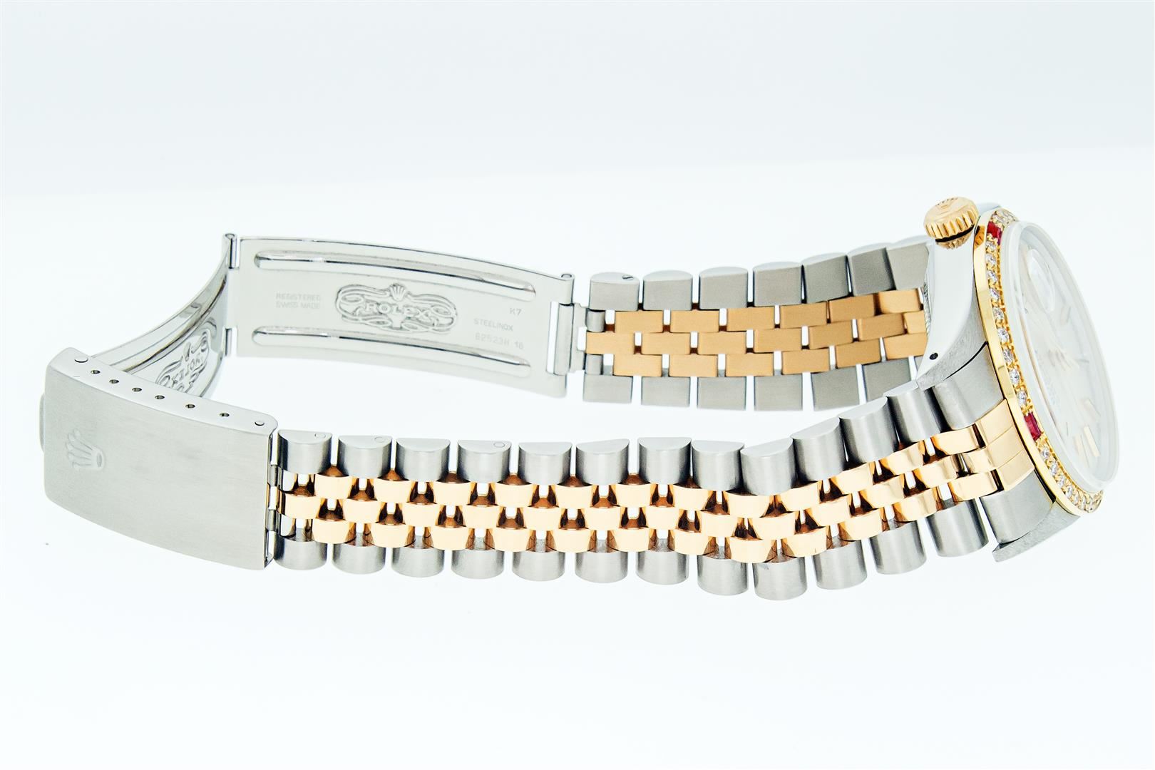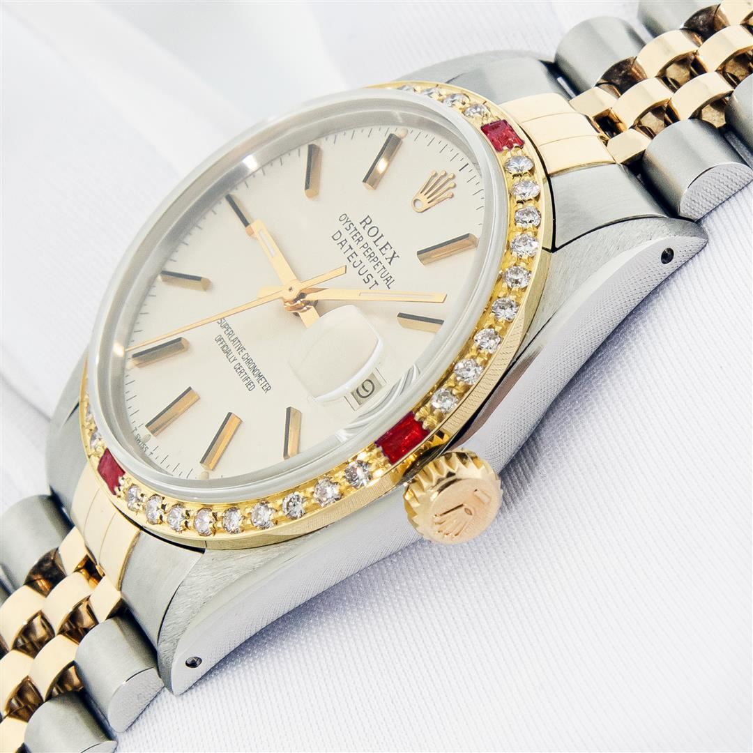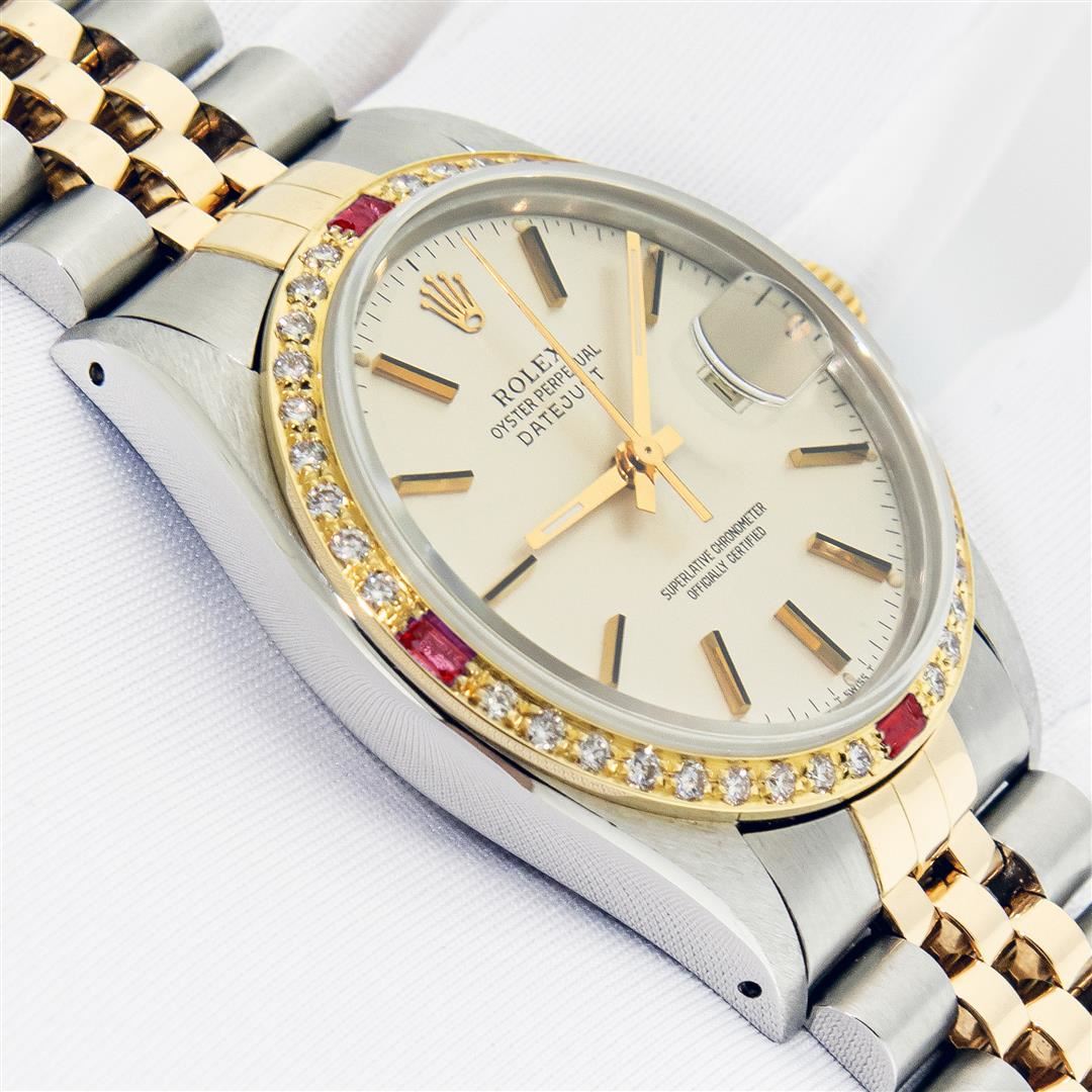 One Mens Pre Owned Two Tone Yellow Gold & Stainless Steel Rolex Datejust Polished, Serviced & Electronically Tested, Yellow Gold & Stainless Steel Case: 36mm, Rolex Yellow Gold Crown, Custom Bezel: New 18K Yellow Gold Ruby Beadset Diamond Bezel, Diamond Count: 36 Diamonds + 4 Rubies, Clarity: SI-VS, Color: G to H. Custom Crystal: New Sapphire With Magnified Date Window. Custom Hands: New Hands. Rolex Movement: Automatic Winding Movement. Rolex Factory Dial: Silver Index With Dash Track & Lumi Dots. Date Window: 3 O'Clock Position Date Display, Quickset, Model: Datejust. Condition: G-6 Extra Fine. Rolex Bracelet: Two Tone Yellow Gold & Stainless Steel Jubilee Band. Bright Polish. 7.0 Inch Length, Adjustable. Standard Clasp, With Rolex Logo. This Watch Has Been Serviced Time Tested And Is In Excellent Condition It Is Free Of All Scratches And Dents.