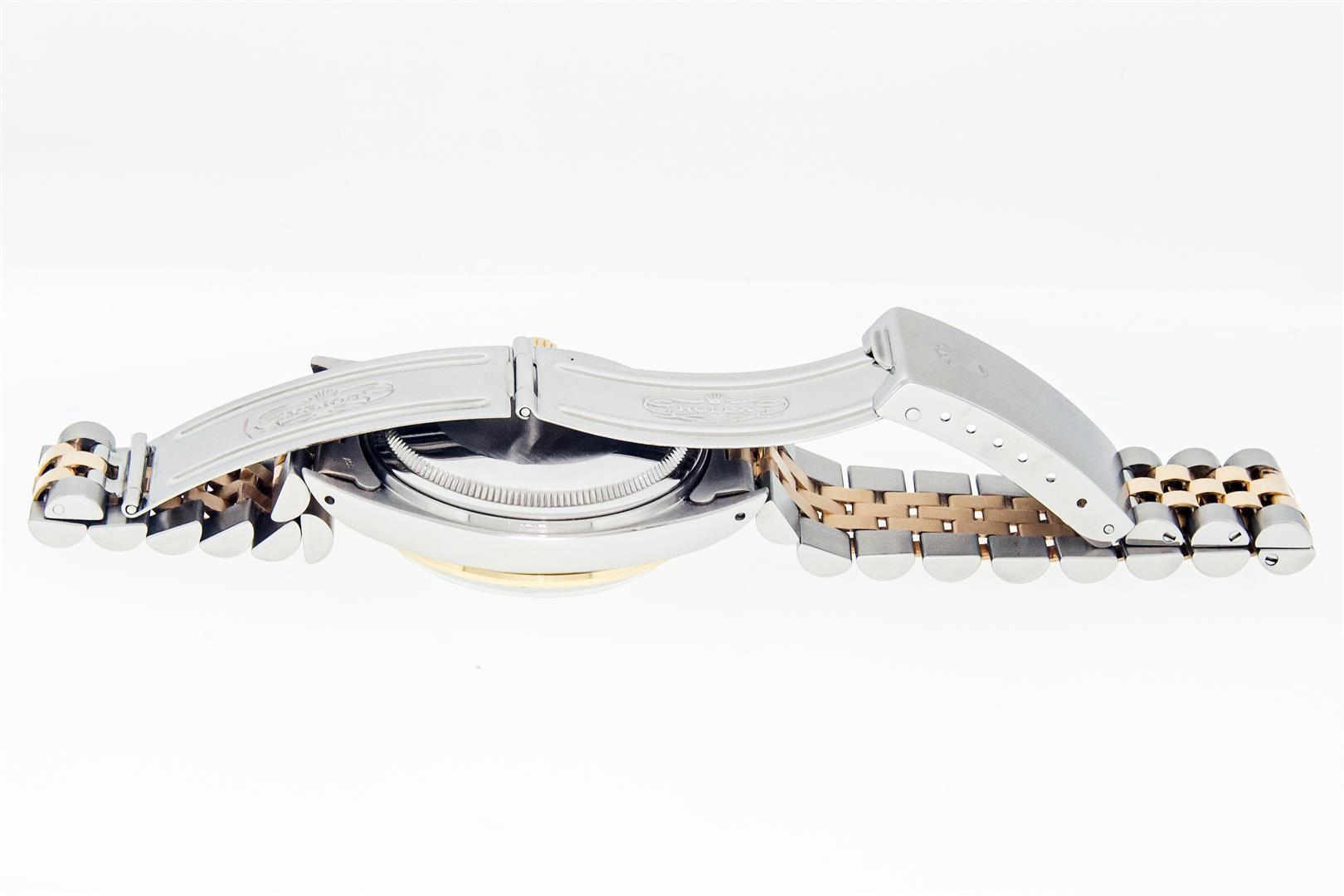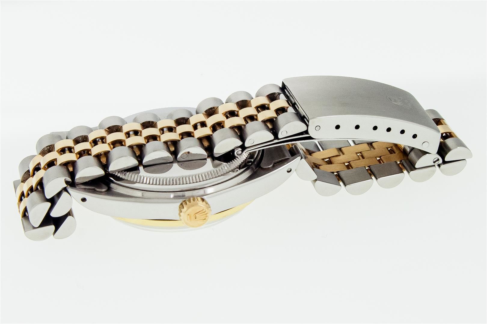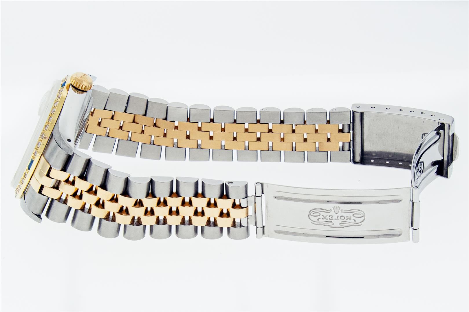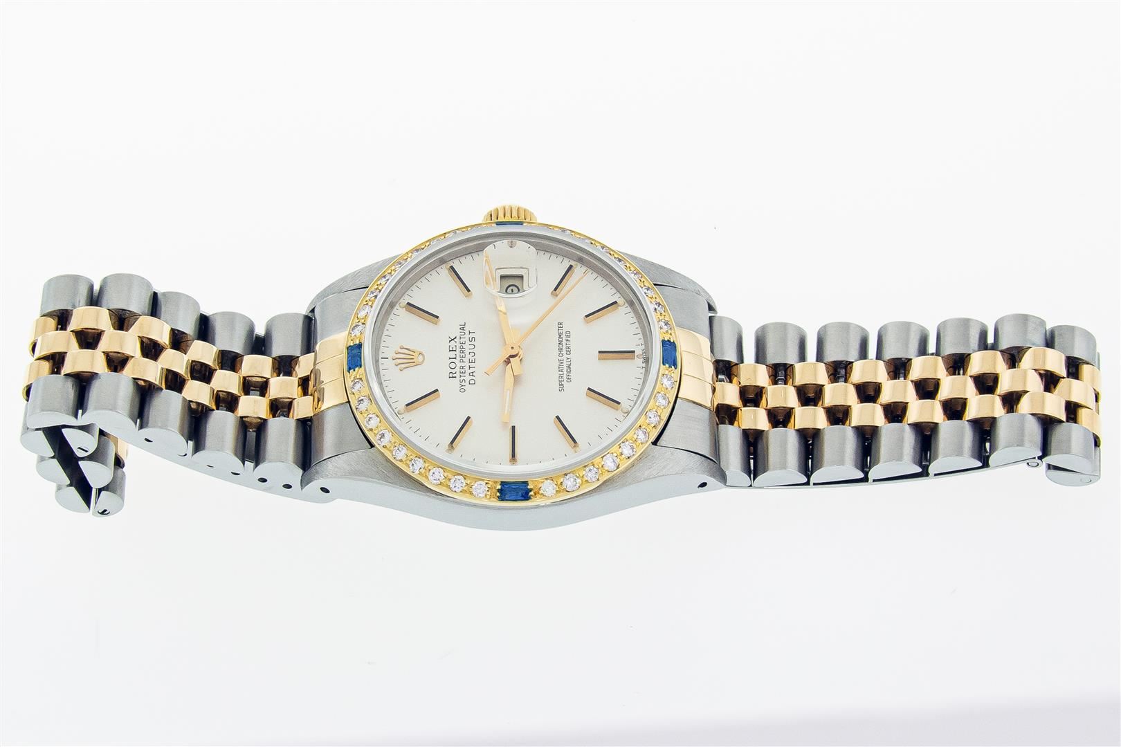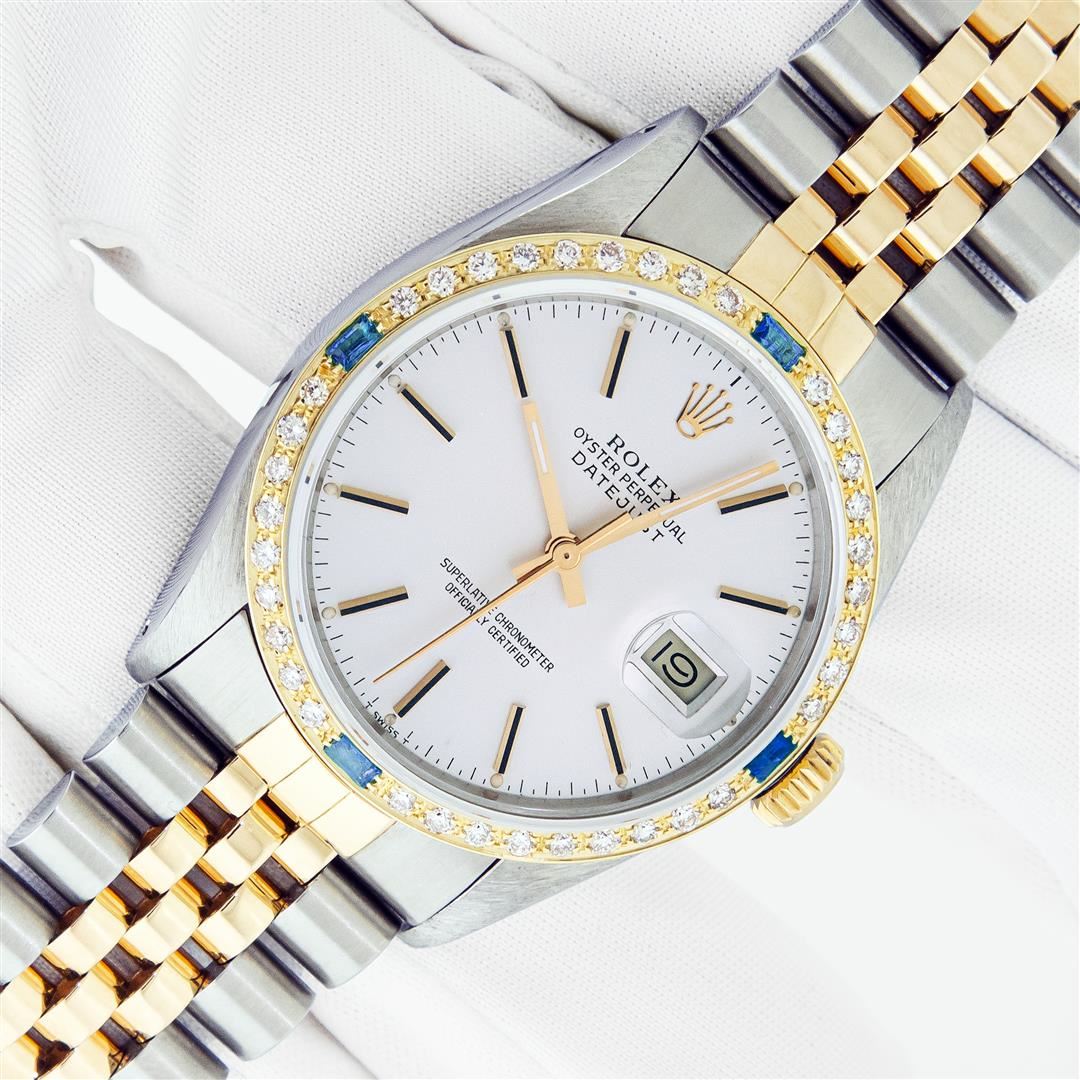One Mens Pre Owned Two Tone Yellow Gold & Stainless Steel Rolex Datejust Polished, Serviced & Electronically Tested, Yellow Gold & Stainless Steel Case: 36mm, Rolex Yellow Gold Crown, Custom Bezel: New 18K Yellow Gold Sapphire Beadset Diamond Bezel, Diamond Count: 36 Diamonds + 4 Sapphires, Clarity: SI-VS, Color: G to H. Custom Crystal: New Sapphire With Magnified Date Window. Custom Hands: New Hands. Rolex Movement: Automatic Winding Movement. Rolex Factory Dial: Silver Index With Dash Track & Lumi Dots. Date Window: 3 O'Clock Position Date Display, Quickset, Model: Datejust. Condition: G-6 Extra Fine. Rolex Bracelet: Two Tone Yellow Gold & Stainless Steel Jubilee Band. Bright Polish. 7.0 Inch Length, Adjustable. Standard Clasp, With Rolex Logo. This Watch Has Been Serviced Time Tested And Is In Excellent Condition It Is Free Of All Scratches And Dents.