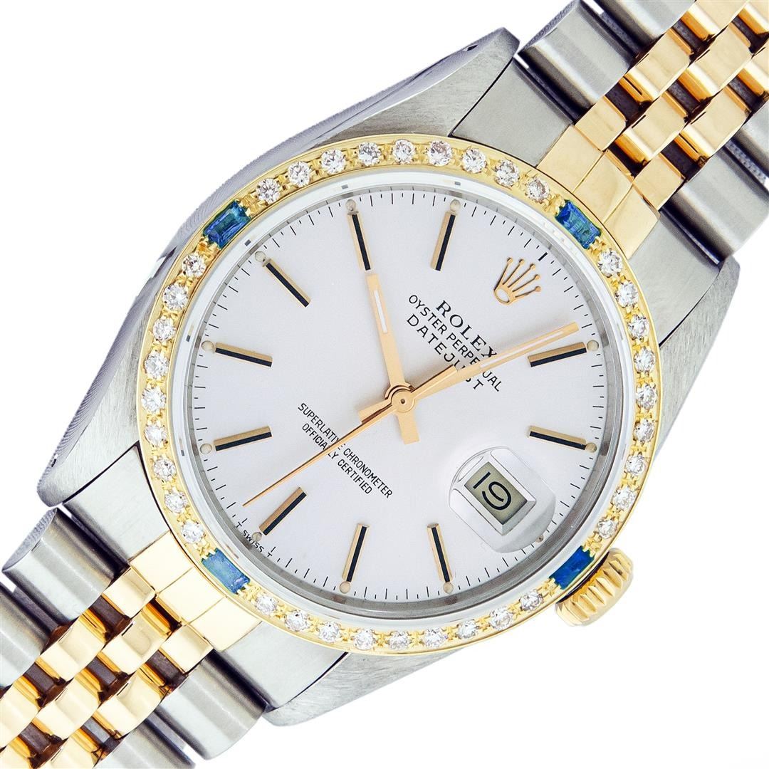 One Mens Pre Owned Two Tone Yellow Gold & Stainless Steel Rolex Datejust Polished, Serviced & Electronically Tested, Yellow Gold & Stainless Steel Case: 36mm, Rolex Yellow Gold Crown, Custom Bezel: New 18K Yellow Gold Sapphire Beadset Diamond Bezel, Diamond Count: 36 Diamonds + 4 Sapphires, Clarity: SI-VS, Color: G to H. Custom Crystal: New Sapphire With Magnified Date Window. Custom Hands: New Hands. Rolex Movement: Automatic Winding Movement. Rolex Factory Dial: Silver Index With Dash Track & Lumi Dots. Date Window: 3 O'Clock Position Date Display, Quickset, Model: Datejust. Condition: G-6 Extra Fine. Rolex Bracelet: Two Tone Yellow Gold & Stainless Steel Jubilee Band. Bright Polish. 7.0 Inch Length, Adjustable. Standard Clasp, With Rolex Logo. This Watch Has Been Serviced Time Tested And Is In Excellent Condition It Is Free Of All Scratches And Dents.