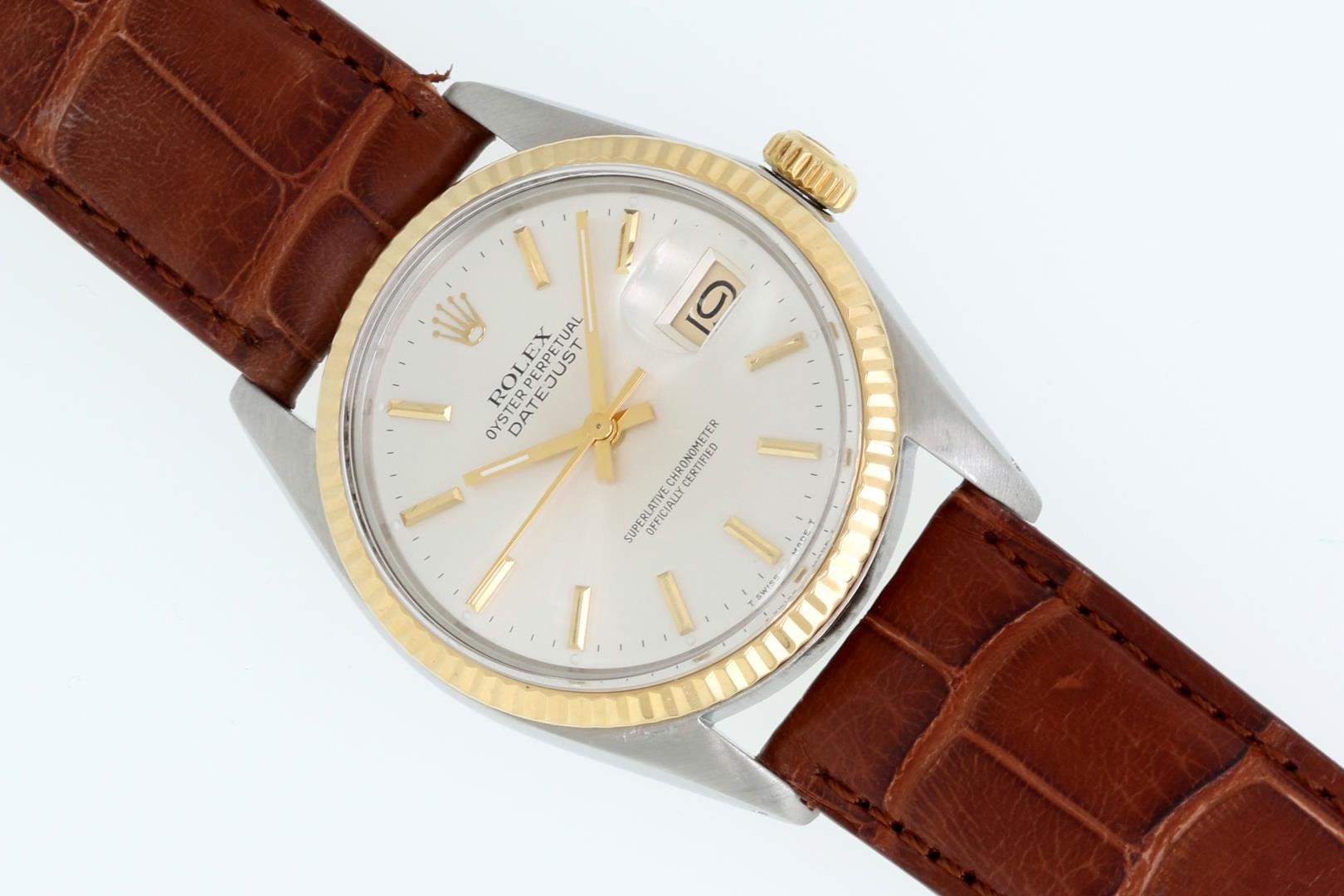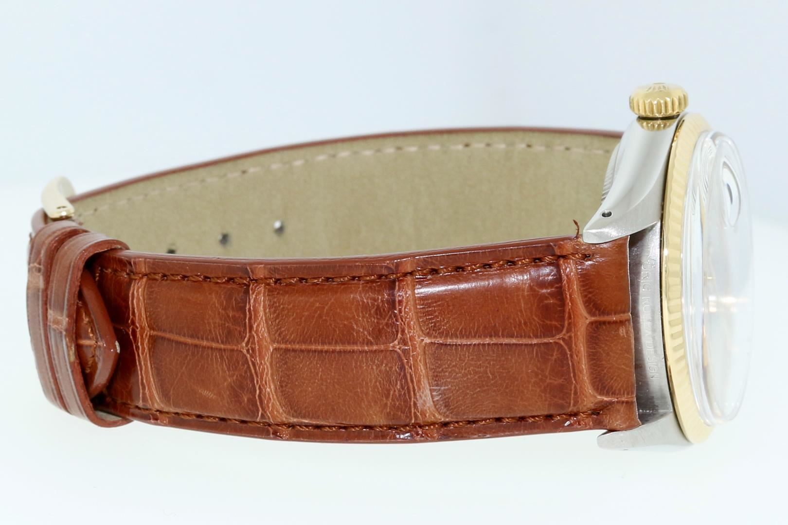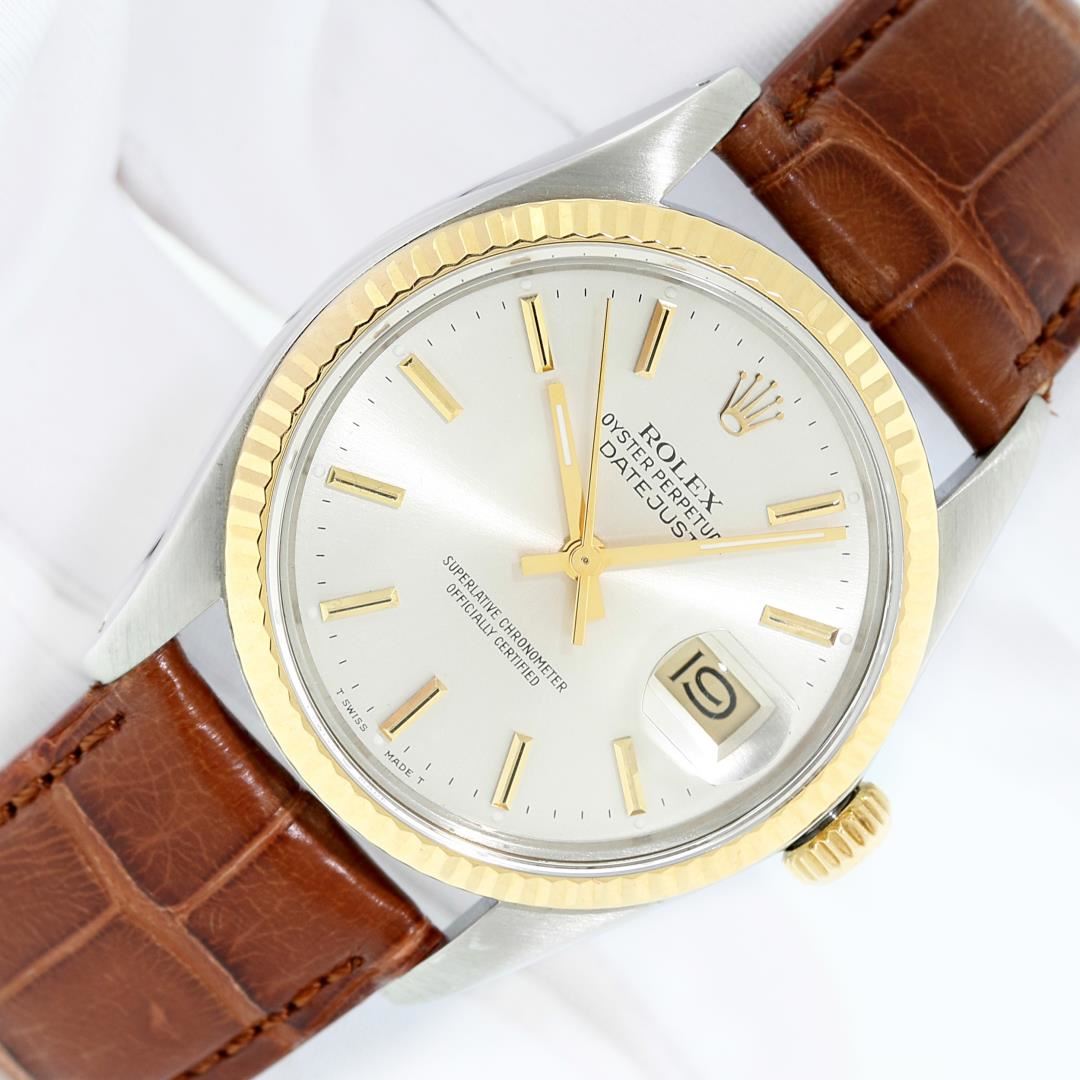 One Mens Pre Owned Two Tone Yellow Gold And Stainless Steel Rolex Datejust Polished, Serviced & Electronically Tested, Rolex Yellow Gold & Stainless Steel Case: 36mm, Rolex Yellow Gold Crown, Rolex Bezel: Yellow Gold Fluted Bezel. Custom Crystal: New Plastic With Date Window. Custom Hands: New Hands. Rolex Movement: Automatic Winding Movement. Rolex Dial: Silver With Index Hour Markers. Date Window: 3 O'Clock Position Date Display, Quickset, Model: Datejust. Condition: G-6 Extra Fine. Custom Band: New Brown Leather Band 7.0 Inch Length with New Custom Pin Buckle Clasp. This Watch Has Been Serviced And Polished It Is Free Of All Scratches And Dents.