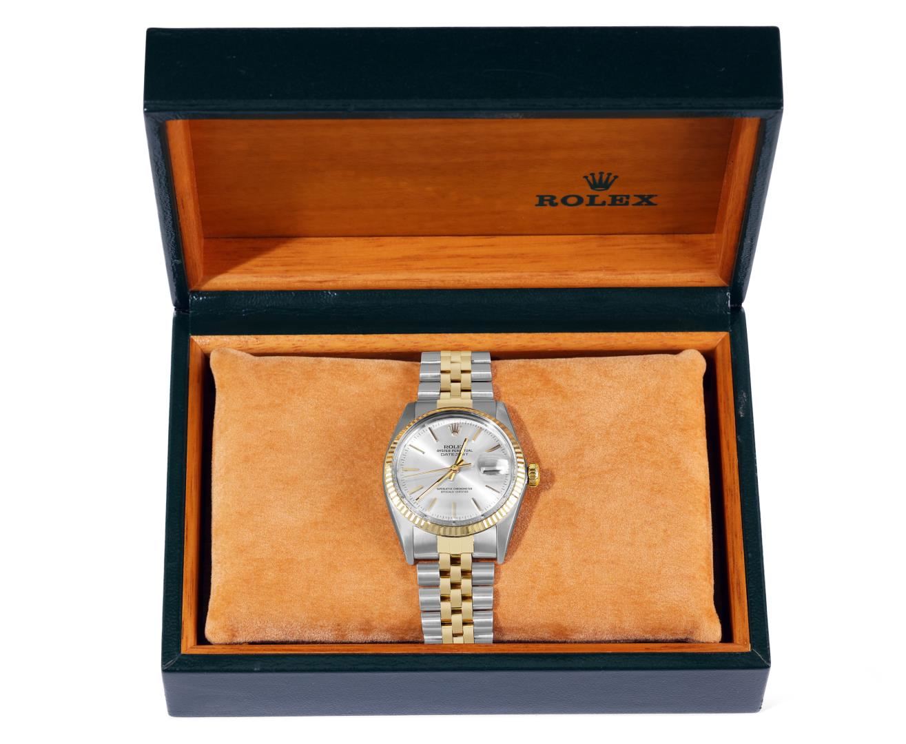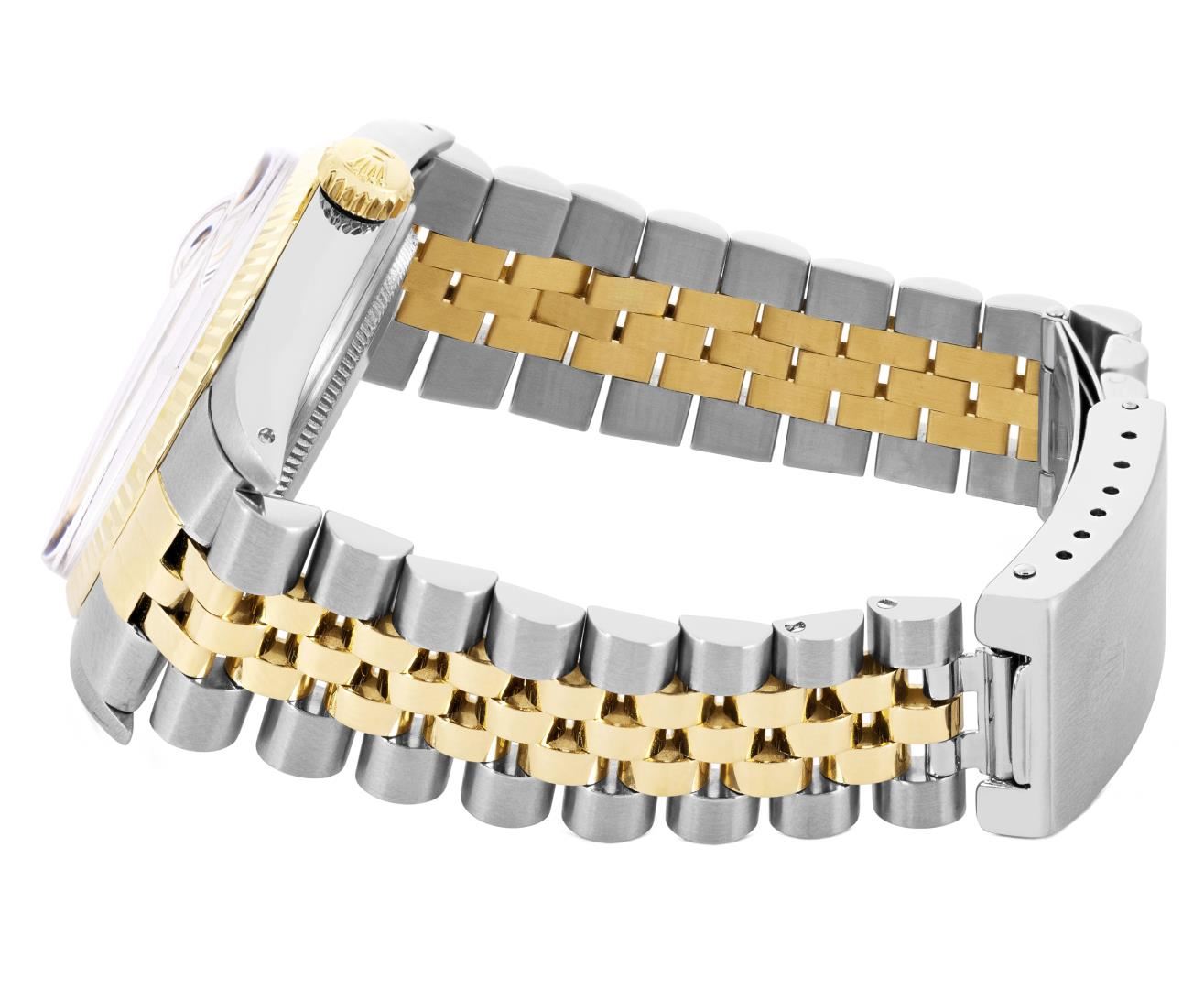 One Mens Pre Owned Yellow Gold Two Tone Rolex Datejust Polished, Serviced And Electronically Tested, Rolex Yellow Gold And Stainless Steel Case: 36mm, Rolex Yellow Gold Crown, Rolex Bezel: Yellow Gold Fluted Bezel. Custom Crystal: New Acrylic With Magnified Date Window. Hands: Luminescent Hands. Rolex Movement: Automatic Winding Movement 3035. Rolex Dial: Silver Dial With Index Hour Markers and Dash Track With Lumi Dots. Date Window: 3 O'clock Position Date Display, Quickset, Model: Quickset Datejust. Condition: G-6 Extra Fine. Rolex Bracelet: Two Tone Yellow Gold And Stainless Steel Jubilee Band. Bright Polish. 7.0 Inch Length, Adjustable. Standard Clasp, With Rolex Logo. This Watch Has Been Serviced Time Tested And Is In Excellent Condition It Is Free Of All Scratches And Dents. This Watch Comes With A Rolex Box.