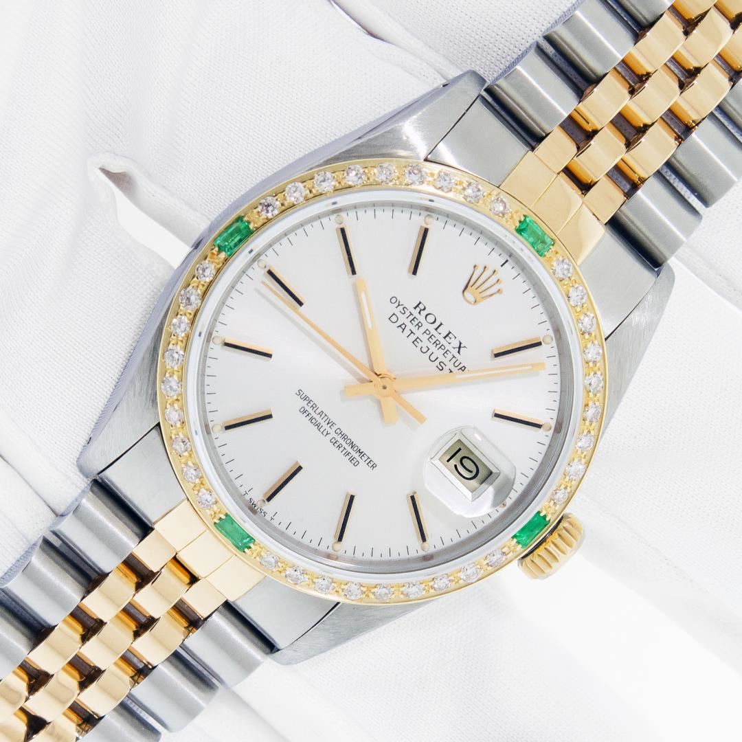 One Mens Pre Owned Two Tone Yellow Gold & Stainless Steel Rolex Datejust Polished, Serviced & Electronically Tested, Yellow Gold & Stainless Steel Case: 36mm, Rolex Yellow Gold Crown, Custom Bezel: New 18K Yellow Gold Emerald Beadset Diamond Bezel, Diamond Count: 36 Diamonds + 4 Emerald, Clarity: SI-VS, Color: G to H. Custom Crystal: New Sapphire With Magnified Date Window. Custom Hands: New Hands. Rolex Movement: Automatic Winding Movement. Rolex Factory Dial: Silver Index With Dash Track & Lumi Dots. Date Window: 3 O'Clock Position Date Display, Quickset, Model: Datejust. Condition: G-6 Extra Fine. Rolex Bracelet: Two Tone Yellow Gold & Stainless Steel Jubilee Band. Bright Polish. 7.0 Inch Length, Adjustable. Standard Clasp, With Rolex Logo. This Watch Has Been Serviced Time Tested And Is In Excellent Condition It Is Free Of All Scratches And Dents.