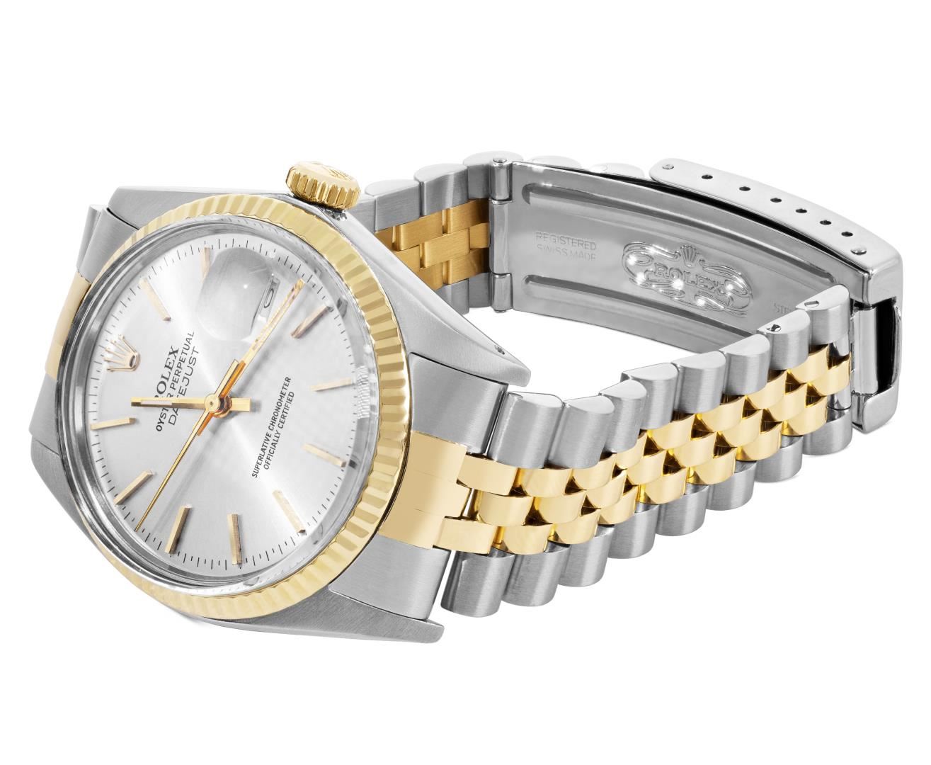 One Mens Pre Owned Yellow Gold Two Tone Rolex Datejust Polished, Serviced And Electronically Tested, Rolex Yellow Gold And Stainless Steel Case: 36mm, Rolex Yellow Gold Crown, Rolex Bezel: Yellow Gold Fluted Bezel. Custom Crystal: New Acrylic With Magnified Date Window. Hands: Luminescent Hands. Rolex Movement: Automatic Winding Movement 3035. Rolex Dial: Silver Dial With Index Hour Markers and Dash Track With Lumi Dots. Date Window: 3 O'Clock Position Date Display, Quickset, Model: Quickset Datejust. Condition: G-6 Extra Fine. Rolex Bracelet: Two Tone Yellow Gold And Stainless Steel Jubilee Band. Bright Polish. 7.0 Inch Length, Adjustable. Standard Clasp, With Rolex Logo. This Watch Has Been Serviced Time Tested And Is In Excellent Condition It Is Free Of All Scratches And Dents.