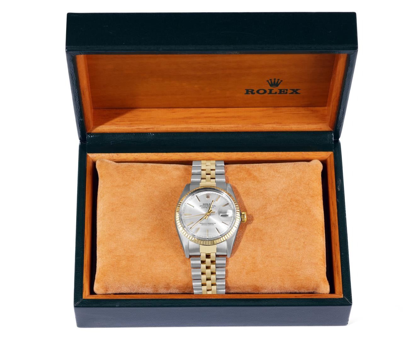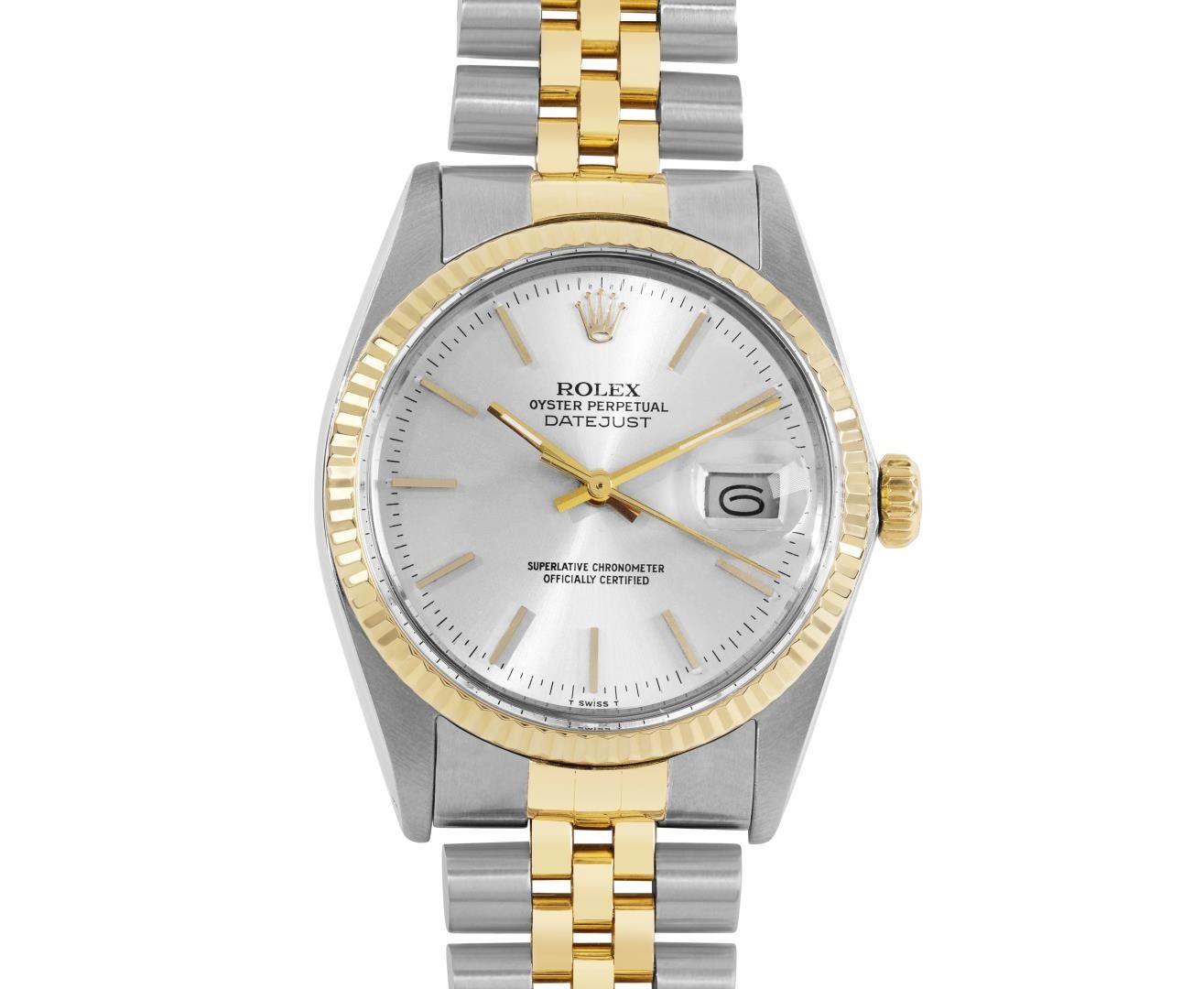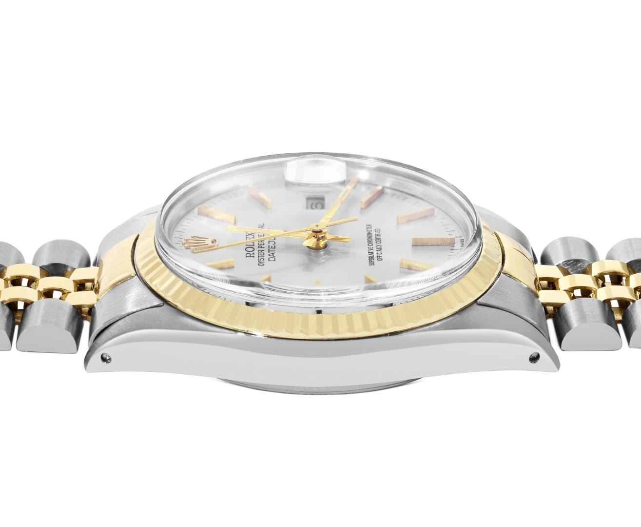 One Mens Pre Owned Yellow Gold Two Tone Rolex Datejust Polished, Serviced And Electronically Tested, Rolex Yellow Gold And Stainless Steel Case: 36mm, Rolex Yellow Gold Crown, Rolex Bezel: Yellow Gold Fluted Bezel. Custom Crystal: New Acrylic With Magnified Date Window. Hands: Luminescent Hands. Rolex Movement: Automatic Winding Movement 3035. Rolex Dial: Silver Dial With Index Hour Markers and Dash Track With Lumi Dots. Date Window: 3 O'Clock Position Date Display, Quickset, Model: Quickset Datejust. Condition: G-6 Extra Fine. Rolex Bracelet: Two Tone Yellow Gold And Stainless Steel Jubilee Band. Bright Polish. 7.0 Inch Length, Adjustable. Standard Clasp, With Rolex Logo. This Watch Has Been Serviced Time Tested And Is In Excellent Condition It Is Free Of All Scratches And Dents.