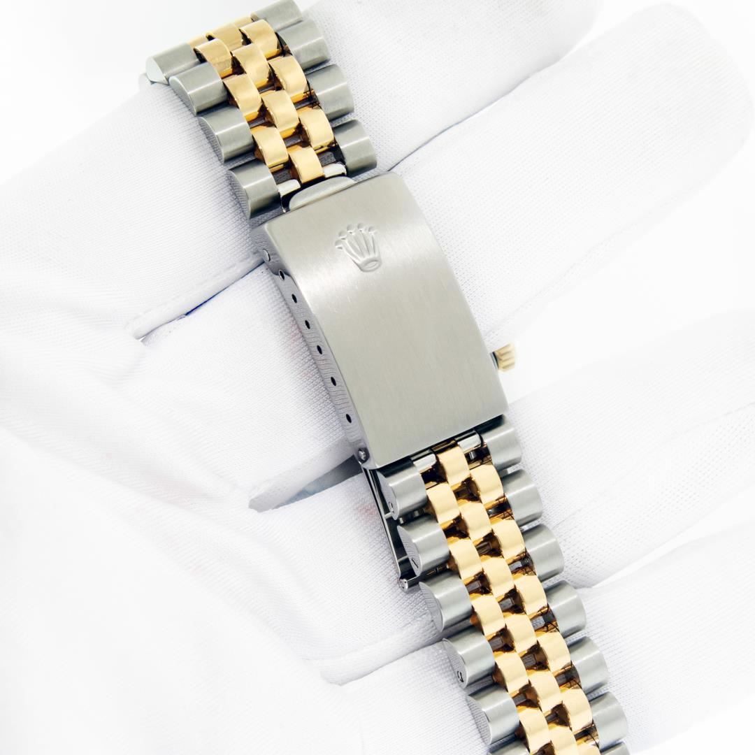 One Mens Pre Owned Two Tone Yellow Gold and Stainless Steel Rolex Datejust Polished, Serviced & Electronically Tested, Rolex Yellow Gold & Stainless Steel Case: 36mm, Rolex Yellow Gold Crown, Custom Bezel: New 18K Yellow Gold Beadset Diamond Bezel, Diamond Count: 44 Diamonds. Custom Crystal: New Sapphire With Magnified Date Window. Custom Hands: New Luminecent Hands. Rolex Movement: Automatic Winding Movement. Rolex Dial: Silver Index Dial With Dash Track. Date Window: 3 O'Clock Position Date Display, Quickset, Model: Condition: G-6 Extra Fine. Rolex Bracelet: Two Tone Yellow Gold & Stainless Steel Jubilee Band. Bright Polish. 7.0 Inch Length, Adjustable. Standard Clasp, With Rolex Logo. This Watch Has Been Serviced Time Tested And Is In Excellent Condition It Is Free Of All Scratches And Dents.