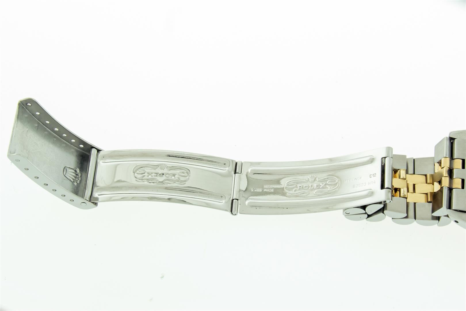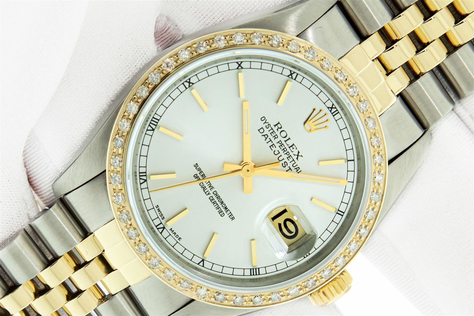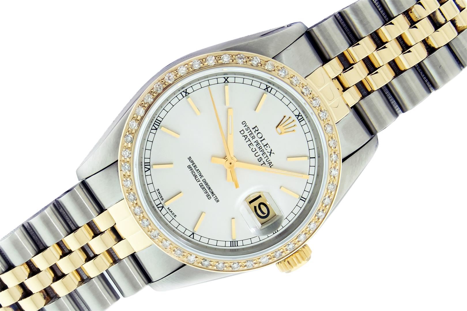 One Mens Pre Owned 18K Yellow Gold & Stainless Steel Two Tone Rolex Oyster Perpetual Datejust Polished, Serviced & Electronically Tested, Rolex 18K Yellow Gold & Stainless Steel Case: 36mm, Original Rolex 18K Yellow Gold Crown, Custom Bezel: New 18K Yello