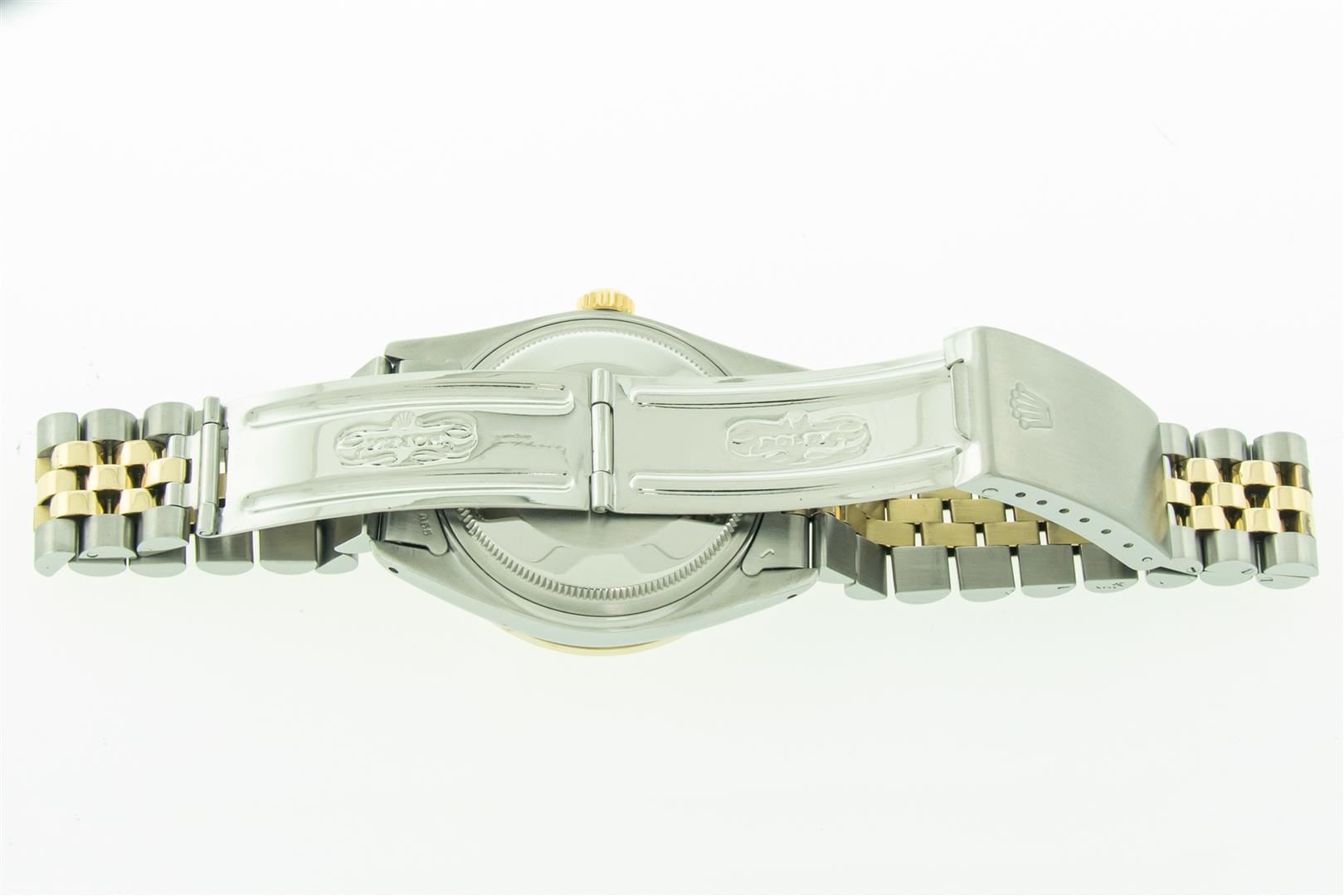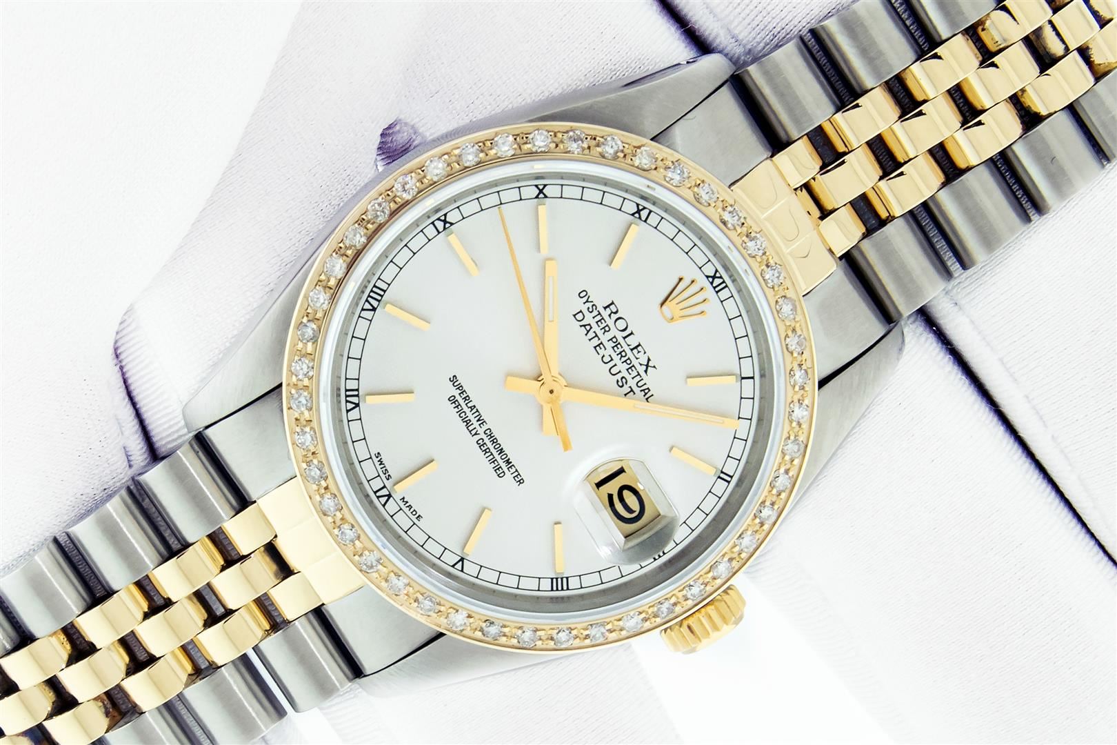 One Mens Pre Owned 18K Yellow Gold & Stainless Steel Two Tone Rolex Oyster Perpetual Datejust Polished, Serviced & Electronically Tested, Rolex 18K Yellow Gold & Stainless Steel Case: 36mm, Original Rolex 18K Yellow Gold Crown, Custom Bezel: New 18K Yello