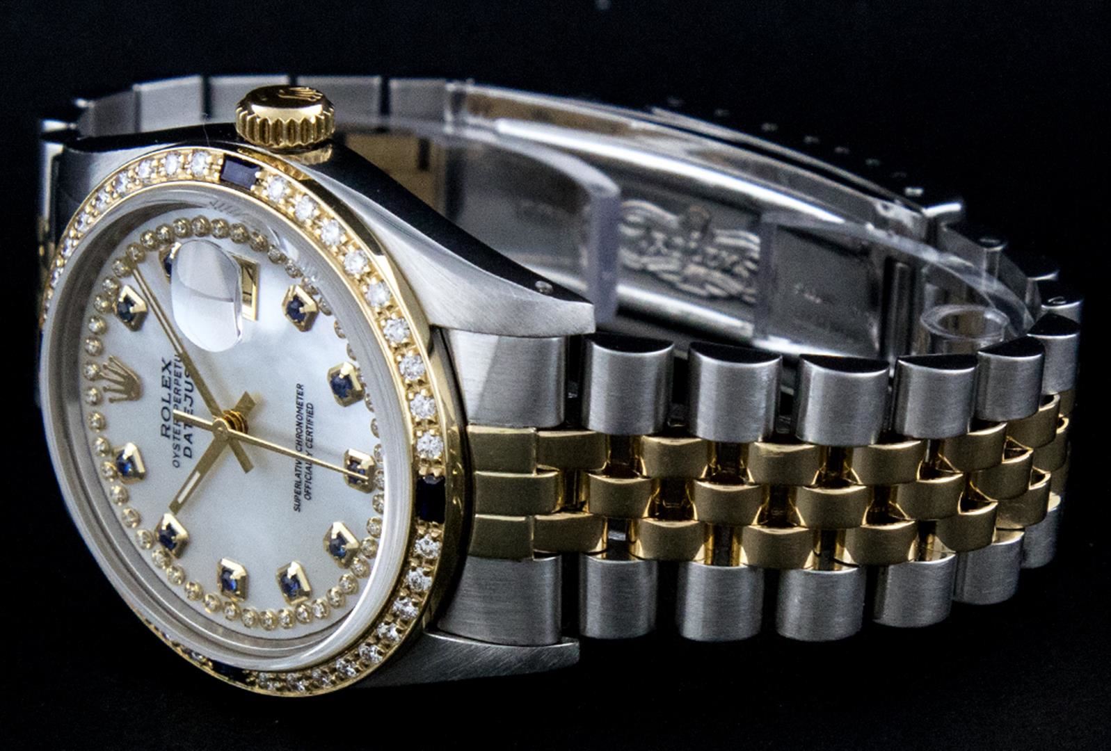 One Mens Two Tone Rolex Datejust Polished, Serviced & Electronically Tested, 18K Yellow Gold & Stainless Steel Case:36mm, 18K Yellow Gold Crown, Custom Bezel: 18K Yellow Gold Sapphire Beadset Diamond Bezel, Diamond Count: 36 Diamonds + 4 Sapphires Total Weight 1.00 Carat, Clarity: Si-VS, Color: G to H. Custom Crystal: Synthetic Sapphire Cyclops Lens. Movement: Automatic Winding Movement Caliber 3135. Custom Dial: Mother Of Pearl Sapphire String Diamond Dial , Diamond + Gem Count: 10 Sapphires + 48 Diamonds in Dial G To H In Color, SI-VS Clarity. Date Window: 3 O'Clock Position Date Display, Quickset, Model: 16233 Sapphire Datejust. Condition: G-6 Extra Fine. Bracelet:Two Tone 18K Yellow Gold & Stainless Steel Rolex Jubilee Band. Bright Polish. 7.0 Inch Length, Adjustable. Standard Clasp, With Rolex Logo.
