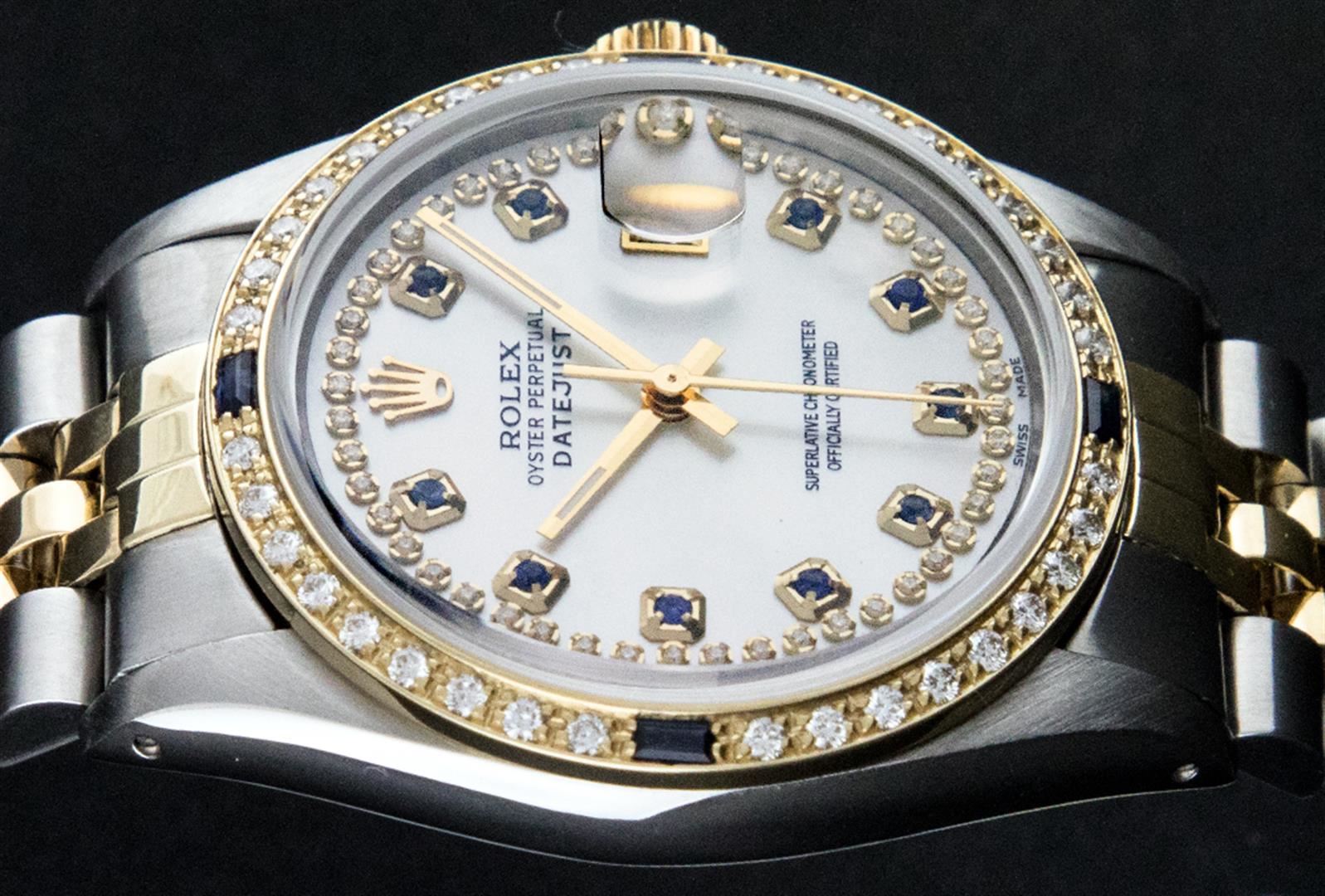 One Mens Two Tone Rolex Datejust Polished, Serviced & Electronically Tested, 18K Yellow Gold & Stainless Steel Case:36mm, 18K Yellow Gold Crown, Custom Bezel: 18K Yellow Gold Sapphire Beadset Diamond Bezel, Diamond Count: 36 Diamonds + 4 Sapphires Total Weight 1.00 Carat, Clarity: Si-VS, Color: G to H. Custom Crystal: Synthetic Sapphire Cyclops Lens. Movement: Automatic Winding Movement Caliber 3135. Custom Dial: Mother Of Pearl Sapphire String Diamond Dial , Diamond + Gem Count: 10 Sapphires + 48 Diamonds in Dial G To H In Color, SI-VS Clarity. Date Window: 3 O'Clock Position Date Display, Quickset, Model: 16233 Sapphire Datejust. Condition: G-6 Extra Fine. Bracelet:Two Tone 18K Yellow Gold & Stainless Steel Rolex Jubilee Band. Bright Polish. 7.0 Inch Length, Adjustable. Standard Clasp, With Rolex Logo.