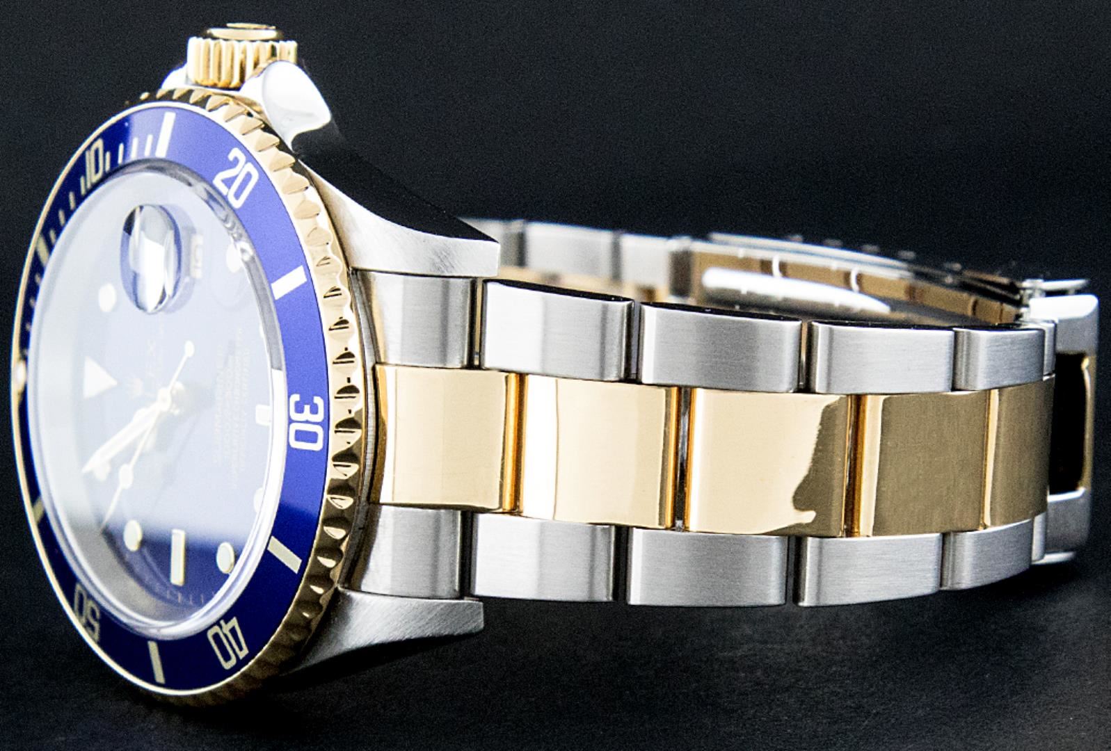 One Mens Pre Owned Rolex 18K Yellow Gold And Stainless Steel Two Tone Submariner With Date Polished, Serviced & Electronically Tested, Rolex Stainless Steel Case: 40mm, Rolex Yellow Gold Crown, Rolex Bezel: Yellow Gold Rotatable Bezel With Blue Insert. Crystal: Sapphire With Magnified Date Window Lens. Rolex Movement: Automatic Winding Movement Caliber 3135. Rolex Dial: Rolex Blue Submariner Dial with Luminous Index Hour Markers, Date Window: 3 O'Clock Position Date Display, Model: Submariner, Quickset, Condition: G-6 Extra Fine. Rolex Bracelet: Stainless Steel and Yellow Gold Oyster Band With Gold Through The Buckle. Bright Polish & Satin Finish. 7.0 Inch Length, Adjustable. Standard Yellow Gold Clasp, With Rolex Logo.