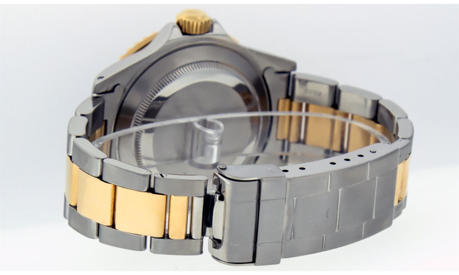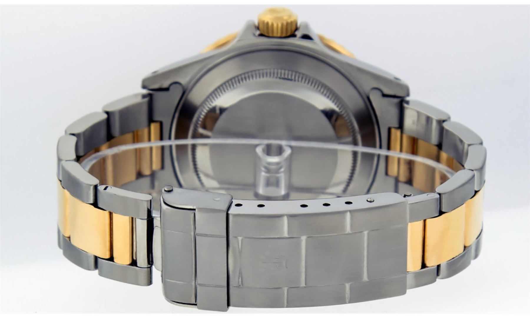 One Mens Pre Owned Rolex Two Tone Yellow Gold And Stainless Steel Submariner With Date Polished, Serviced & Electronically Tested, Rolex Stainless Steel Case: 40mm, Rolex 18K Yellow Gold Crown, Rolex Bezel: 18K Yellow Gold Rotatable Bezel With Blue Insert. Crystal: Sapphire With Magnified Date Window. Rolex Movement: Automatic Winding Movement Caliber 3135. Rolex Dial: Blue Submariner Dial with Luminous Index Hour Markers. Date Window: 3 O'Clock Position Date Display, Model: Submariner, Quickset, Condition: G-6 Extra Fine. Rolex Bracelet: 18K Yellow Gold And Stainless Steel Oyster Band. Bright Polish & Satin Finish. 7.0 Inch Length, Adjustable. Standard Clasp, With Rolex Logo.