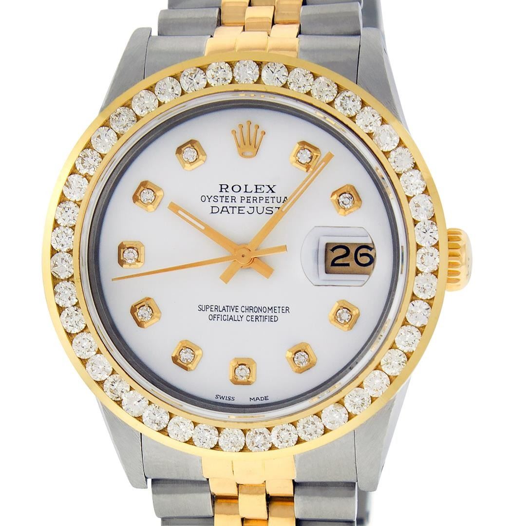 One Mens Pre Owned Yellow Gold And Stainless Rolex Datejust Polished Bright with Satin Finish, Serviced And Electronically Tested, Rolex Stainless Steel Case: 36mm, Rolex Yellow Gold Crown, Custom Bezel: New 18K Yellow Gold 3ct Channel Set Diamond Bezel, Diamond Count: 40 Diamonds. Custom Crystal: New Sapphire With Magnified Lens. Custom Hands: New Luminescent Hands. Rolex Movement: Automatic Winding Movement 3035. Custom Dial: Custom White Dial With Added Diamonds, Diamond Count: 10 Diamonds On Dial. Date Window: 3 O'Clock Position Date Display, Quickset, Model: Datejust Condition: G-6 Extra Fine. Rolex Bracelet: Yellow Gold And Stainless Steel Jubilee Band. Bright Polish And Satin Finish. 7.0 Inch Length, Adjustable. Standard Clasp, With Rolex Logo. This Watch Has Been Serviced And Polished It Is Free Of All Scratches And Dents.