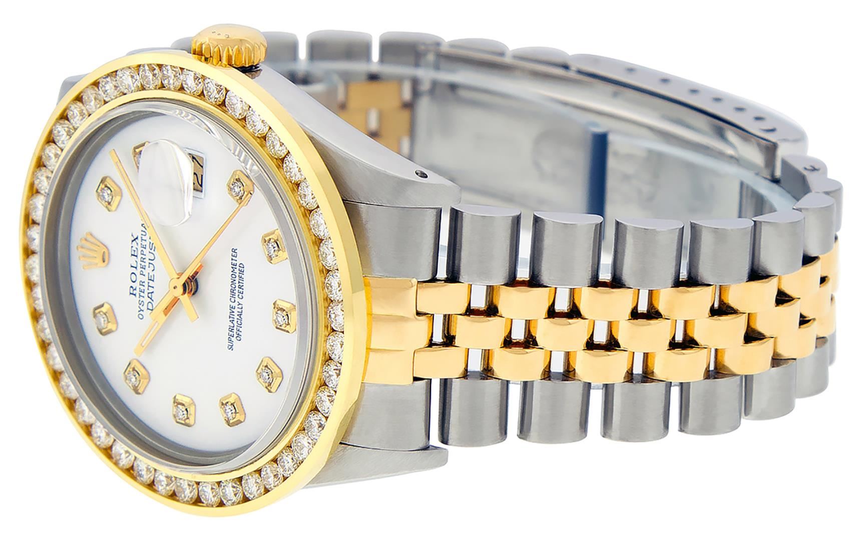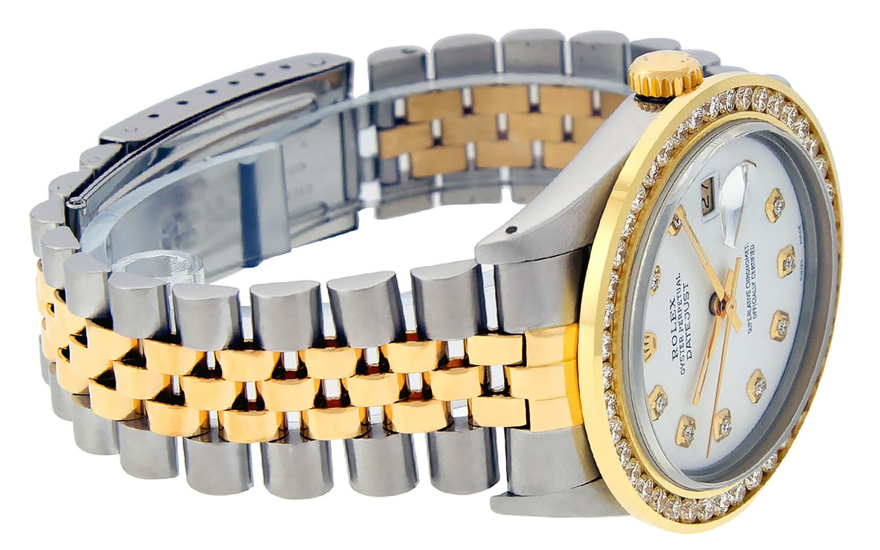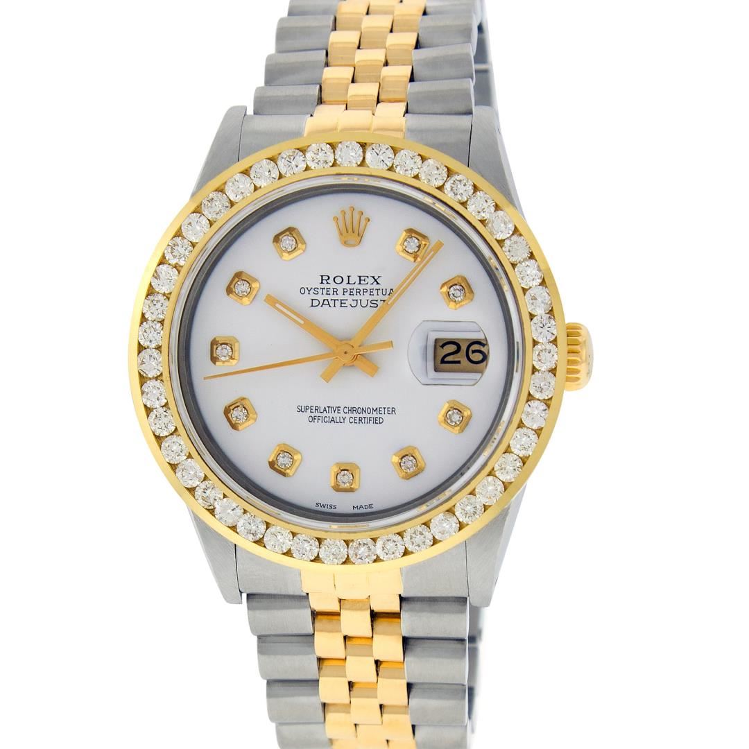 One Mens Pre Owned Yellow Gold And Stainless Rolex Datejust Polished Bright with Satin Finish, Serviced And Electronically Tested, Rolex Stainless Steel Case: 36mm, Rolex Yellow Gold Crown, Custom Bezel: New 18K Yellow Gold 3ct Channel Set Diamond Bezel, Diamond Count: 40 Diamonds. Custom Crystal: New Sapphire With Magnified Lens. Custom Hands: New Luminescent Hands. Rolex Movement: Automatic Winding Movement 3035. Custom Dial: Custom White Dial With Added Diamonds, Diamond Count: 10 Diamonds On Dial. Date Window: 3 O'Clock Position Date Display, Quickset, Model: Datejust Condition: G-6 Extra Fine. Rolex Bracelet: Yellow Gold And Stainless Steel Jubilee Band. Bright Polish And Satin Finish. 7.0 Inch Length, Adjustable. Standard Clasp, With Rolex Logo. This Watch Has Been Serviced And Polished It Is Free Of All Scratches And Dents.