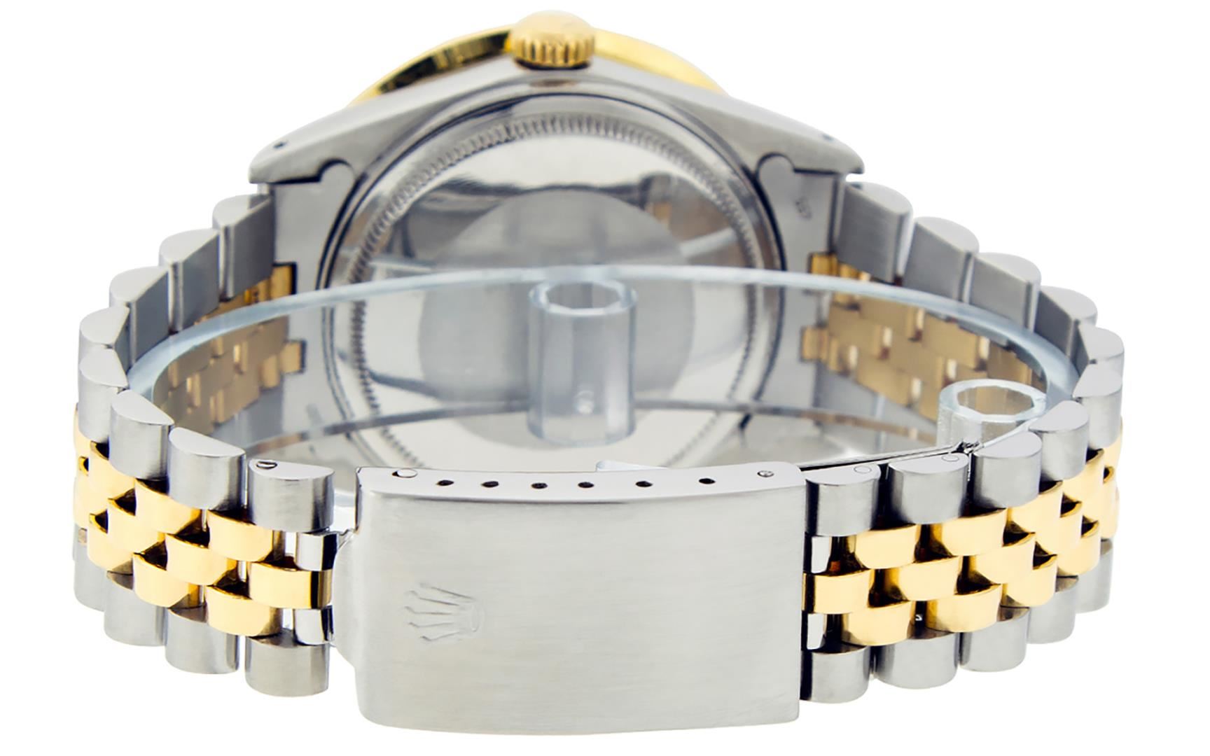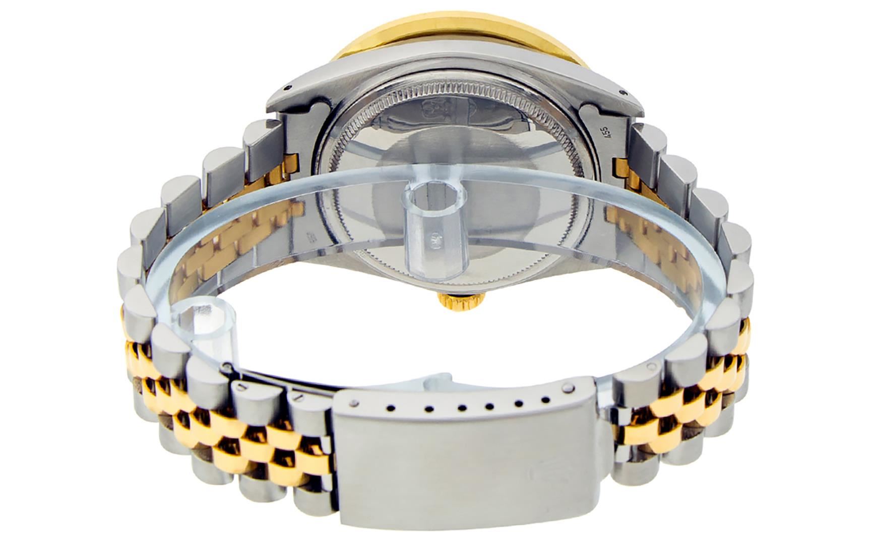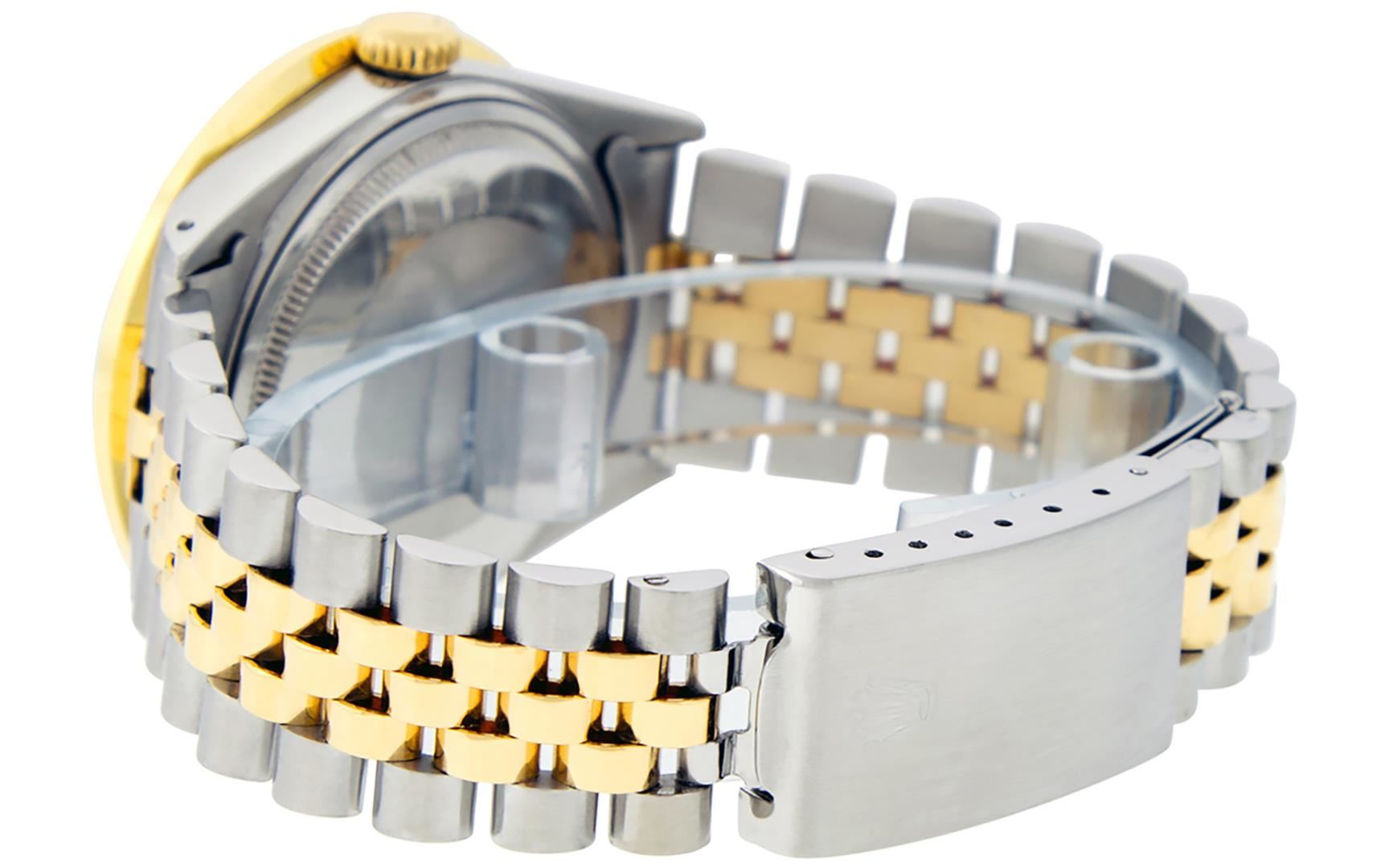 One Mens Pre Owned Yellow Gold And Stainless Rolex Datejust Polished Bright with Satin Finish, Serviced And Electronically Tested, Rolex Stainless Steel Case: 36mm, Rolex Yellow Gold Crown, Custom Bezel: New 18K Yellow Gold 3ct Channel Set Diamond Bezel, Diamond Count: 40 Diamonds. Custom Crystal: New Sapphire With Magnified Lens. Custom Hands: New Luminescent Hands. Rolex Movement: Automatic Winding Movement 3035. Custom Dial: Custom White Dial With Added Diamonds, Diamond Count: 10 Diamonds On Dial. Date Window: 3 O'Clock Position Date Display, Quickset, Model: Datejust Condition: G-6 Extra Fine. Rolex Bracelet: Yellow Gold And Stainless Steel Jubilee Band. Bright Polish And Satin Finish. 7.0 Inch Length, Adjustable. Standard Clasp, With Rolex Logo. This Watch Has Been Serviced And Polished It Is Free Of All Scratches And Dents.