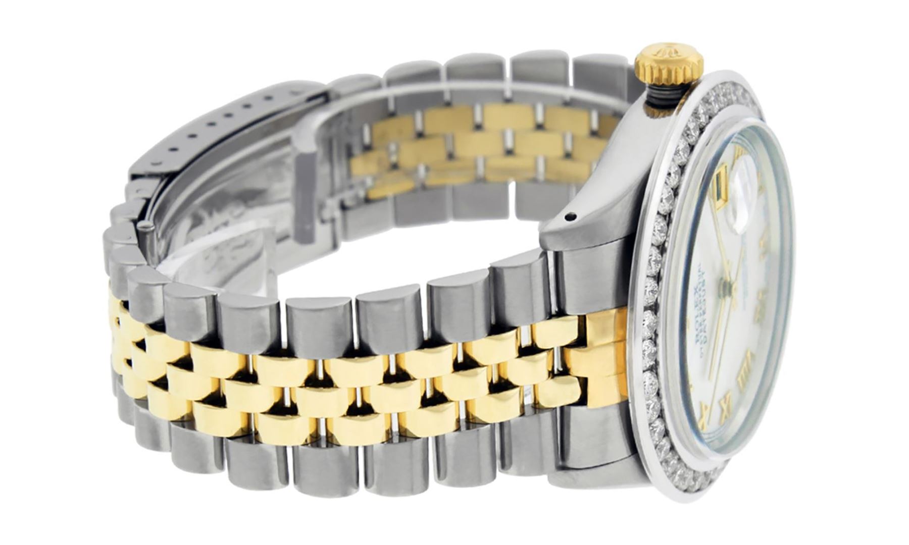One Mens Pre Owned Yellow Gold and Stainless Steel Rolex Datejust Polished Bright with Satin Finish, Serviced And Electronically Tested, Rolex Stainless Steel Case: 36mm, Rolex Yellow Gold Crown, Custom Bezel: New 18K White Gold 3ct Channel Set Diamond Bezel, Diamond Count: 40 Diamonds, Total Weight 3.00 Carat. Custom Crystal: New Sapphire With Magnified Date Window. Custom Hands: New Luminecent Hands. Rolex Movement: Automatic Winding Movement 3035. Custom Dial: Custom White Roman Dial With Square Track. Date Window: 3 O'Clock Position Date Display, Quickset, Model: Datejust Condition: G-6 Extra Fine. Rolex Bracelet: Yellow Gold And Stainless Steel Jubilee Band. Bright Polish & Satin Finish. 7.0 Inch Length, Adjustable. Standard Clasp, With Rolex Logo. This Watch Has Been Serviced And Polished It Is Free Of All Scratches And Dents.