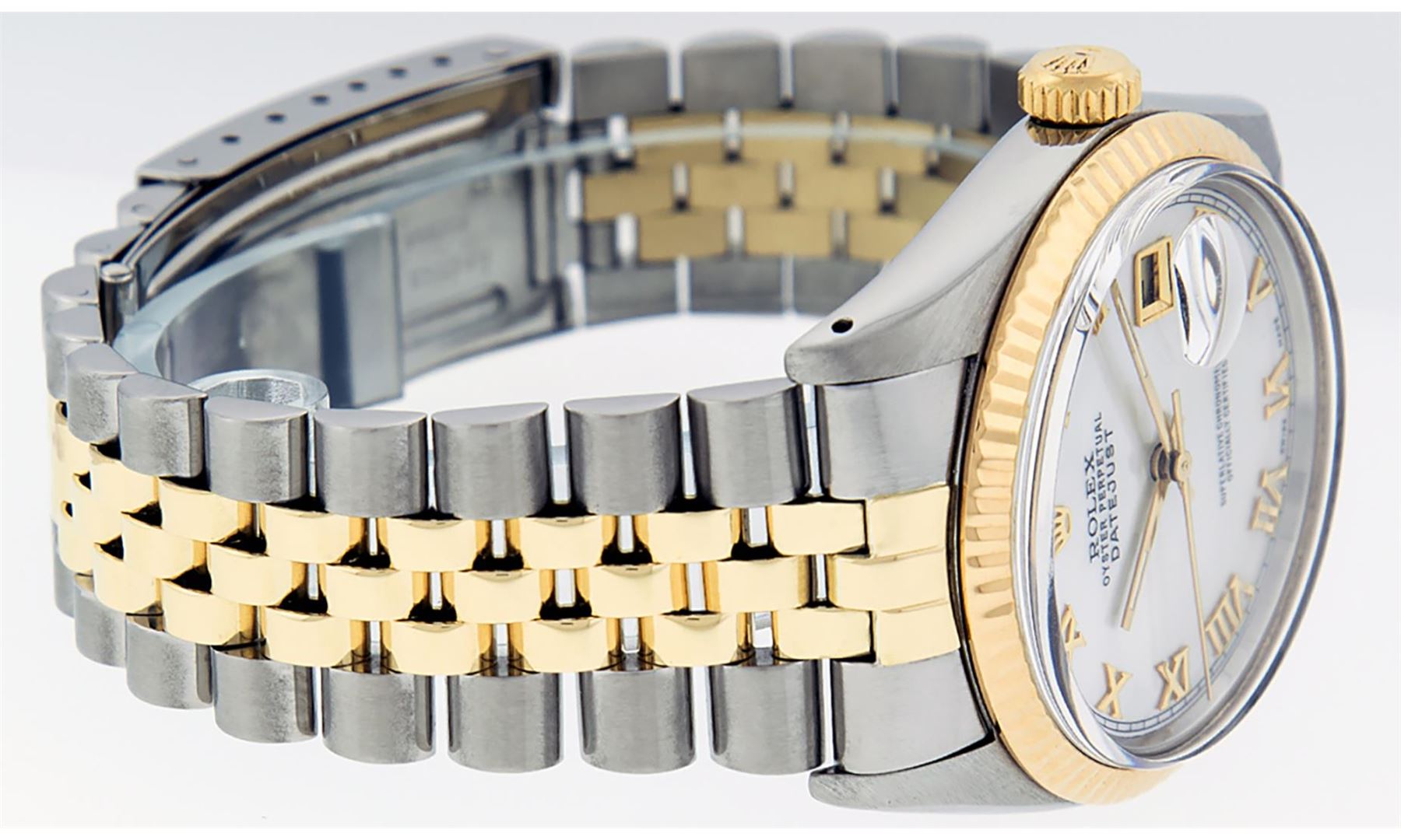 One Mens Pre Owned Yellow Gold Two Tone Rolex Datejust Polished, Serviced And Electronically Tested, Rolex Yellow Gold And Stainless Steel Case: 36mm, Rolex Yellow Gold Crown, Rolex Bezel: Yellow Gold Fluted Bezel. Custom Crystal: New Acrylic With Magnified Date Window. Custom Hands: New Luminescent Hands. Rolex Movement: Automatic Winding Movement 3035. Custom Dial: Custom White Roman Dial With Square Track. Date Window: 3 O'clock Position Date Display, Quickset, Model: Quickset Datejust. Condition: G-6 Extra Fine. Rolex Bracelet: Two Tone Yellow Gold And Stainless Steel Jubilee Band. Bright Polish. 7.0 Inch Length, Adjustable. Standard Clasp, With Rolex Logo. This Watch Has Been Serviced Time Tested And Is In Excellent Condition It Is Free Of All Scratches And Dents.
